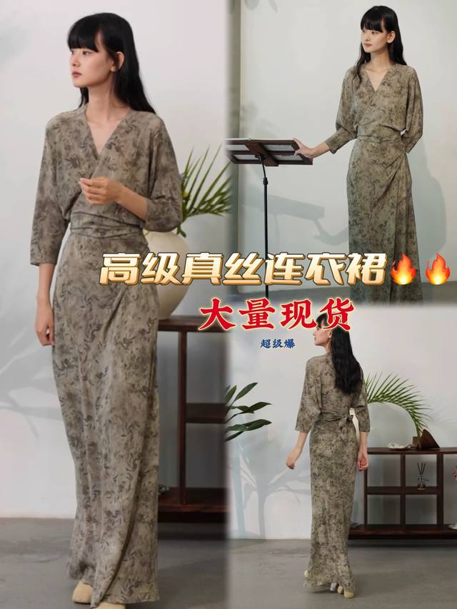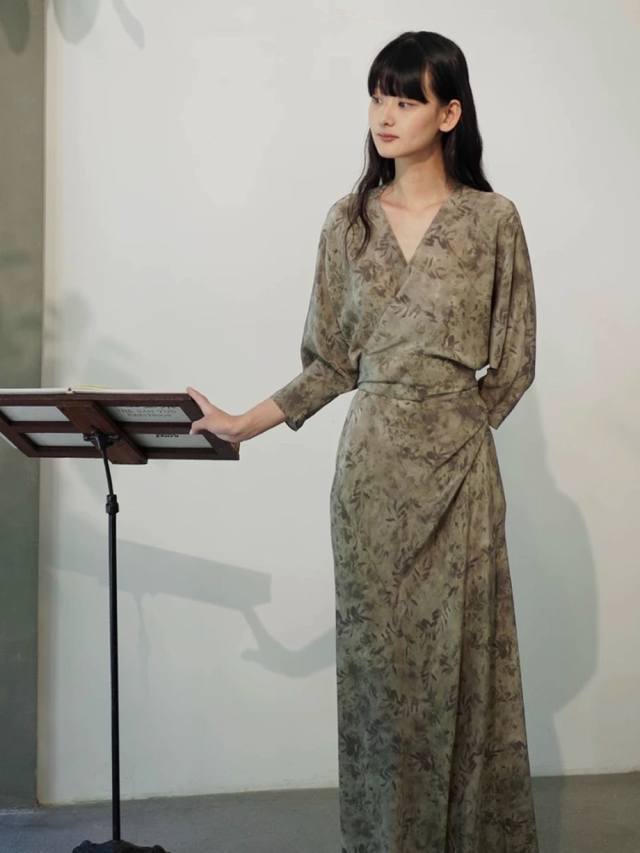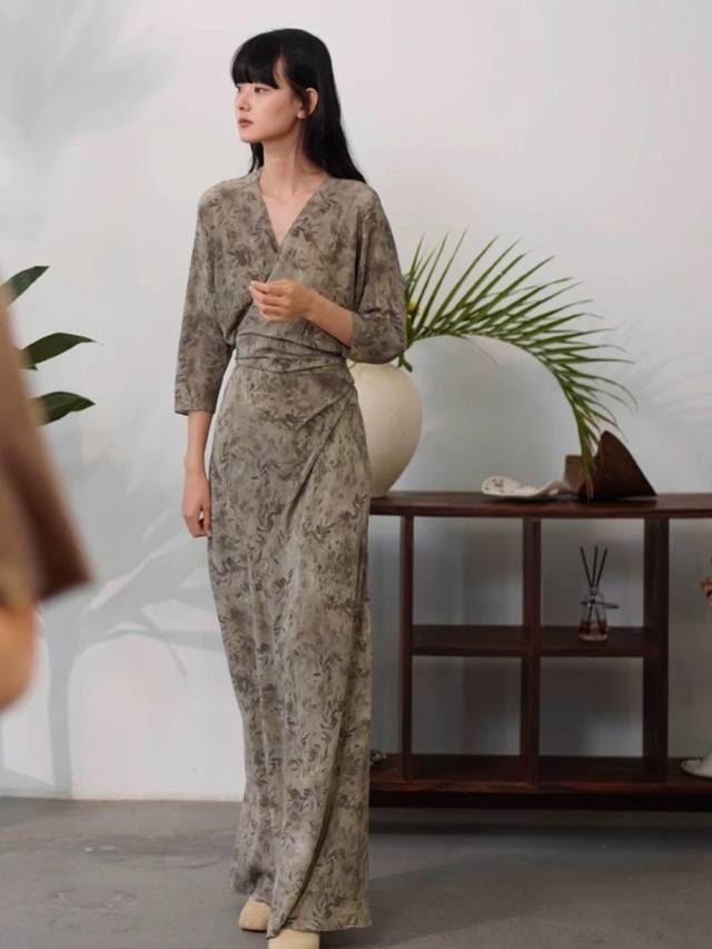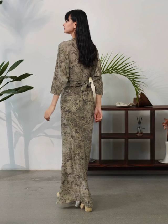 Absolutely stunning! This custom-made, popular bamboo leaf ink painting silk wrap dress is a niche, elegant Spanish, bias-cut, sand-washed silk wrap dress. The loose, irregular fit and wrap-around design don't restrict body shape. The three-quarter sleeves and V-neck flatter the neckline. The dress is entirely tailored, without zippers or other accessories. The upper body has adjustable straps and can be tied with a bow at the back. The bias-cut design creates a sense of space, and the irregular hem has the dynamic feel of a fishtail skirt. Over 2.5 meters of amazing material, the ankle-length skirt elongates the overall figure. Soft to the touch, it drapes smoothly without wrinkles. Single-layer, unlined, breathable and non-permeable. Smlxl