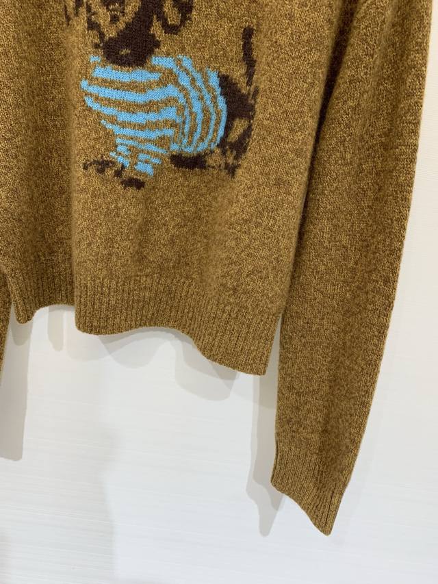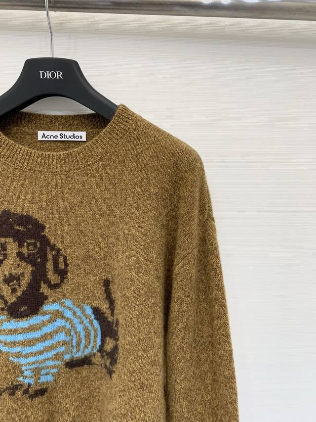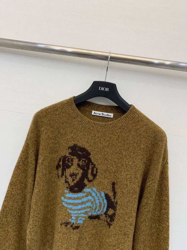 Acnestudios 2025 Autumn/Winter New Arrival: Yak Wool and Fleece Skin-Friendly Crew Neck Puppy Sweater. Features a cropped design with structured shoulders, a playful animal-print pattern, and a soft, comfortable feel. The floral yarn and puppy graphic add a touch of fun and style to autumn/winter outfits. Available in S, M, L, DDD colors.