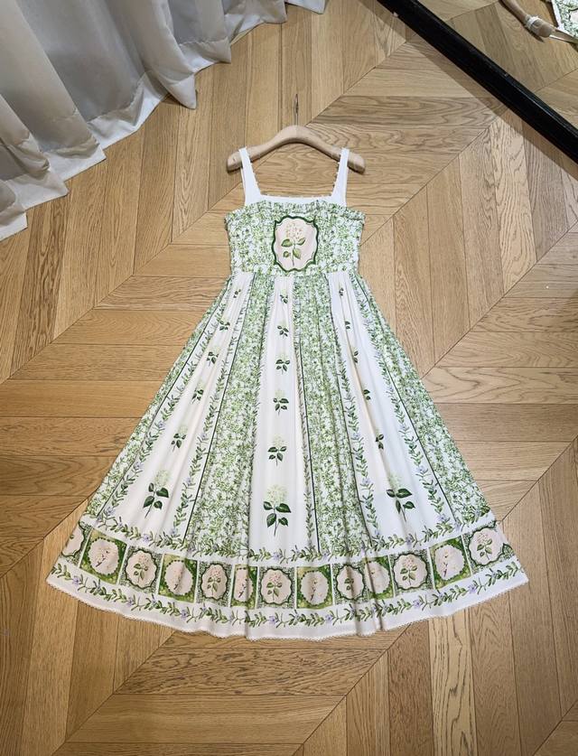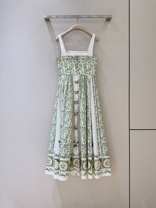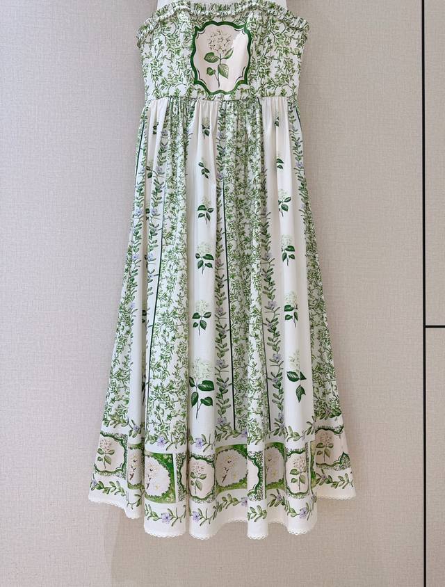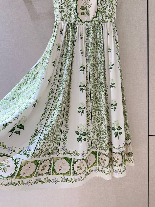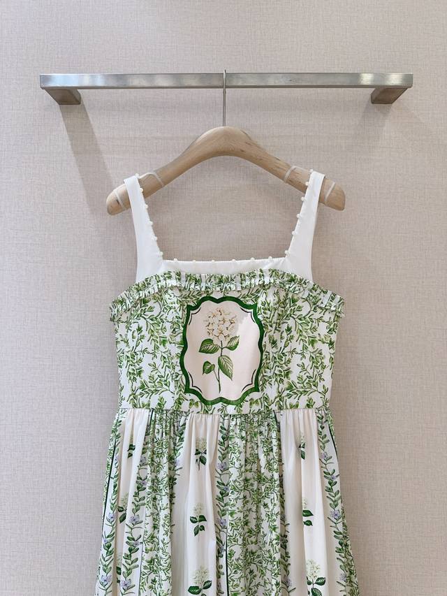 dress features a pure white base, adorned with fresh green vines and delicate floral patterns. Its pearl-encrusted square collar and delicate ruffled edges create a playful yet elegant look, showcasing the alluring lines of the shoulders and neck. The high-waist design meets the full, flowing hem, draping gracefully. Every turn evokes a romantic poem about nature and beauty.