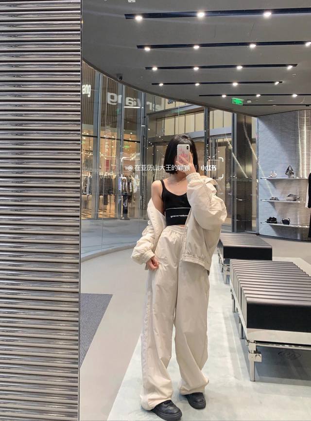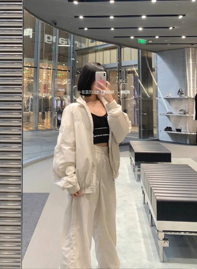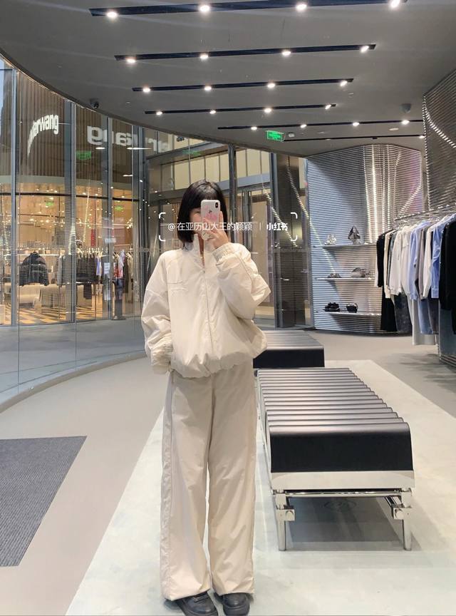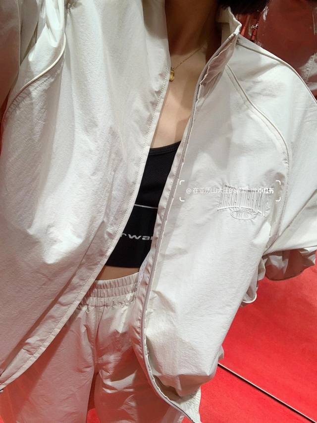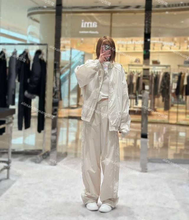 Alexand*R Wang 25Fw Autumn/Winter New Letter Embroidery Stand Collar Zip-Up Windbreaker Jacket + Pants Set | Exclusive High-Quality Production! The off-white lightweight windbreaker fabric has a cool sheen. The stand collar and full zip-up design are neat and windproof. The understated letter embroidery on the body is an Aw-style cool and trendy signature, with effortless sophistication hidden in the details. The jacket has an oversized silhouette, which is flattering and doesn't make you look shorter. The wide-leg pants with drawstring cuffs are casual and can hide minor leg imperfections. Wear it alone for a street style look, layer it with a cropped tank top to show off your waist and instantly become a hot girl, or layer it with a sweatshirt for a relaxed citywalk style. This set covers all your autumn/winter street style needs. Available now in sizes S, M, L, DDD