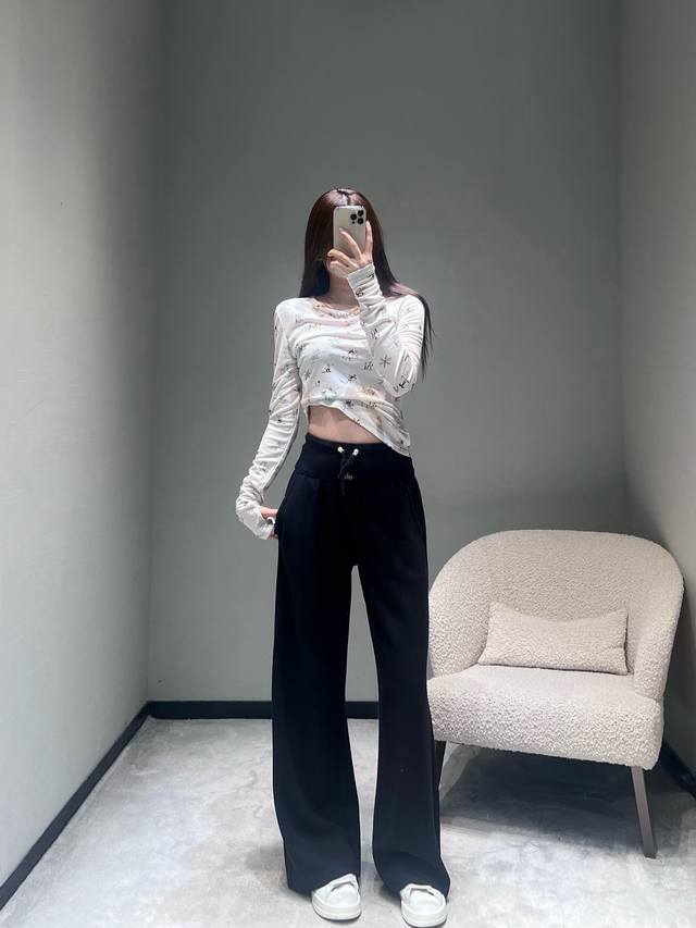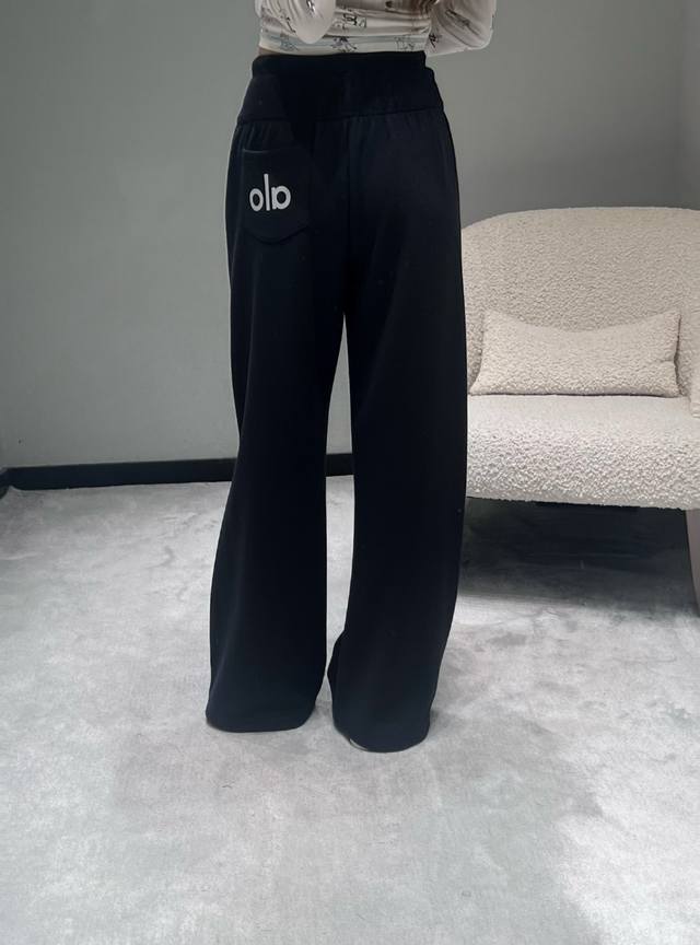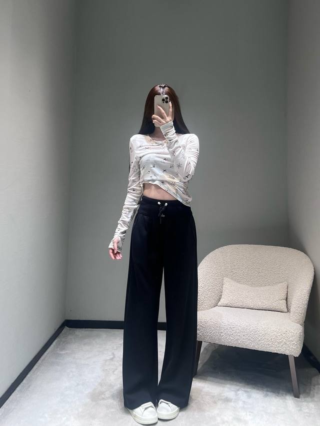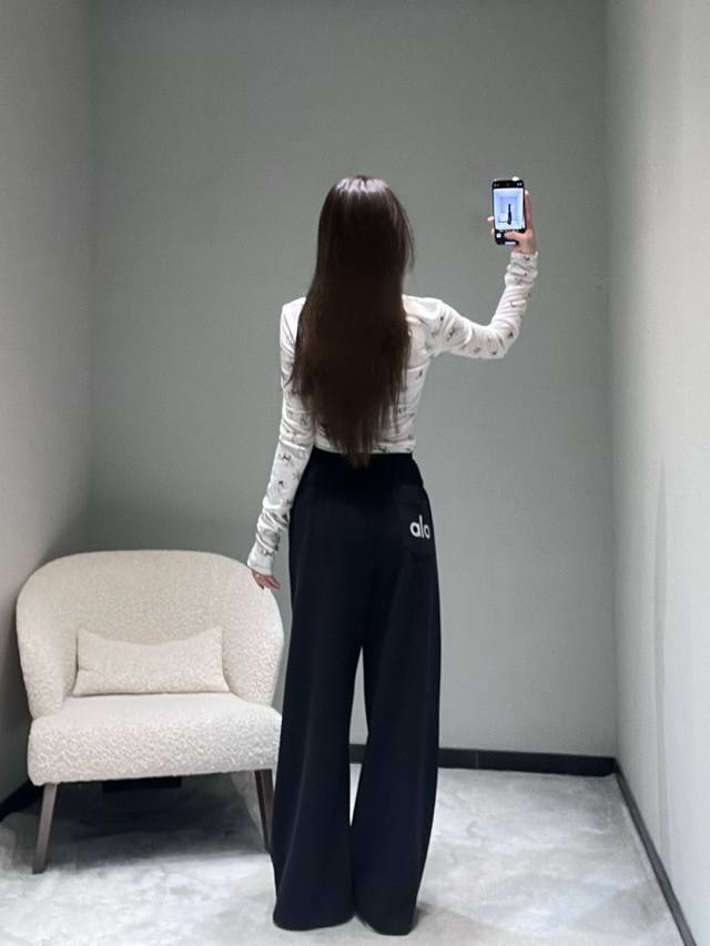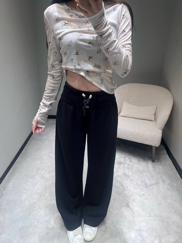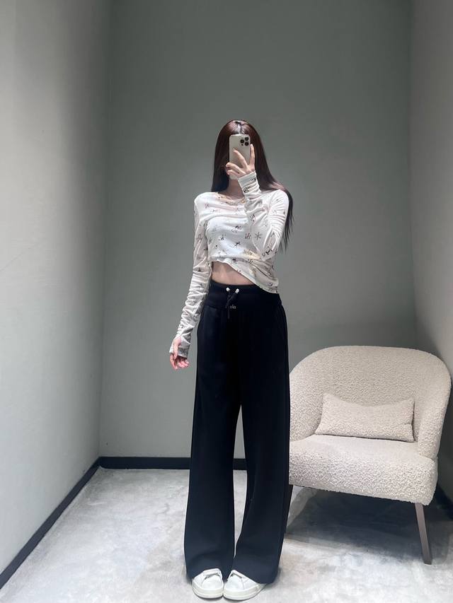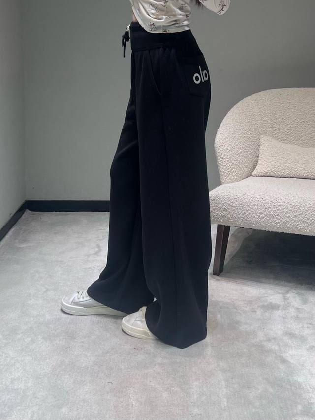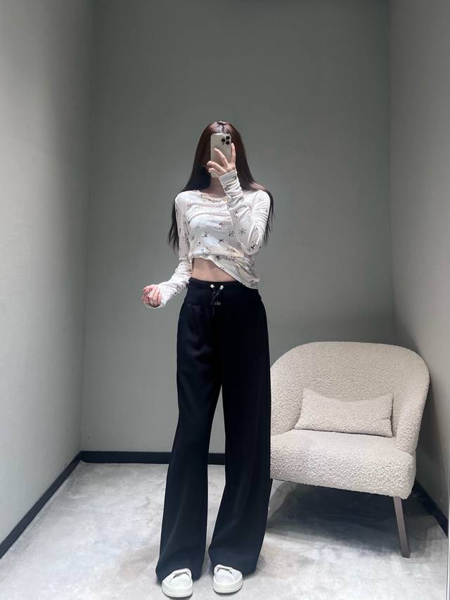Al*O 2025 Autumn/Winter New Collection High-Waisted Wide-Leg Pants: The drawstring waistband allows for adjustable tightness; the wide-leg design offers a relaxed fit and a strong drape; made from soft, skin-friendly sweatshirt fabric with a delicate touch; the pants feature a simple solid color finish without unnecessary embellishments, creating a clean and crisp overall style