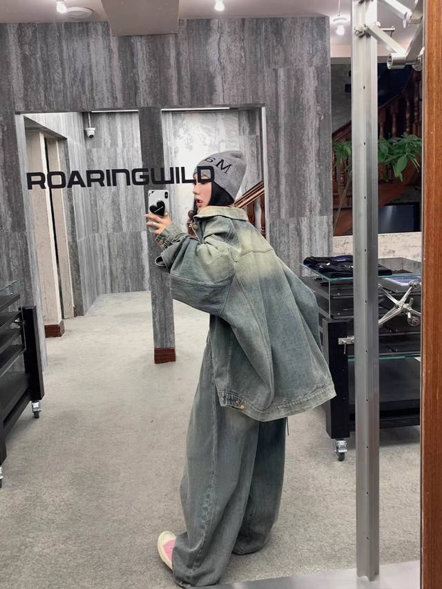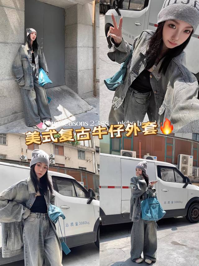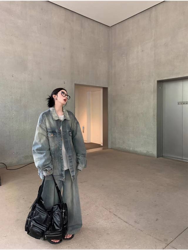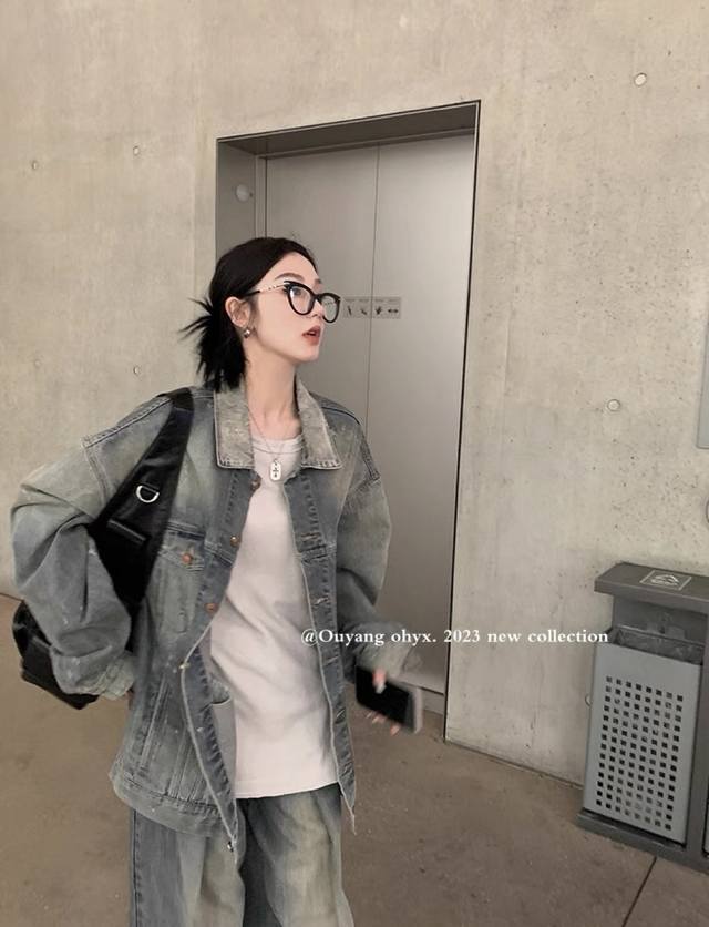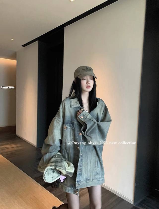 American retro denim jacket, loose casual jacket, top design, niche casual shoulder H large silhouette design, creating an American street trend, yuppie style, casual and chic Smlxl