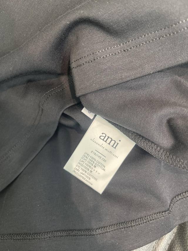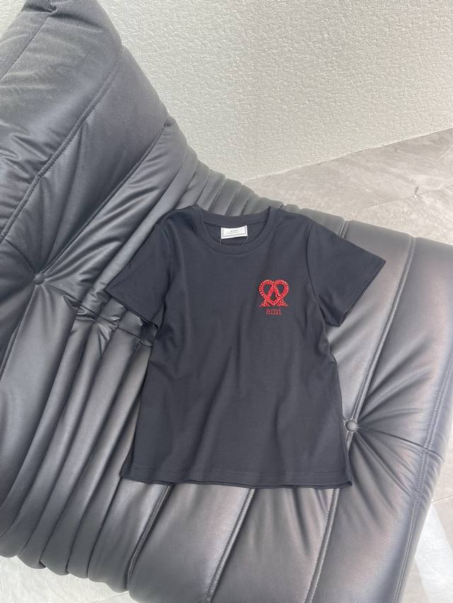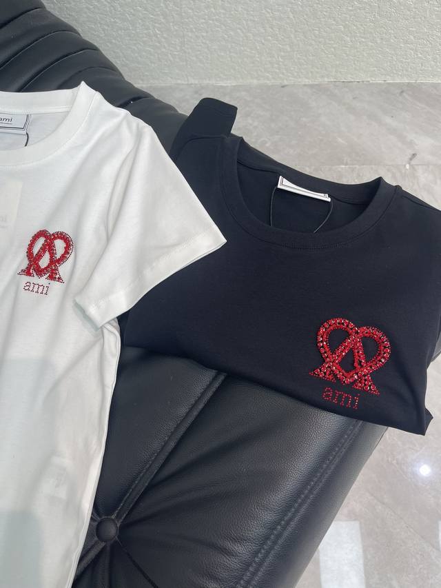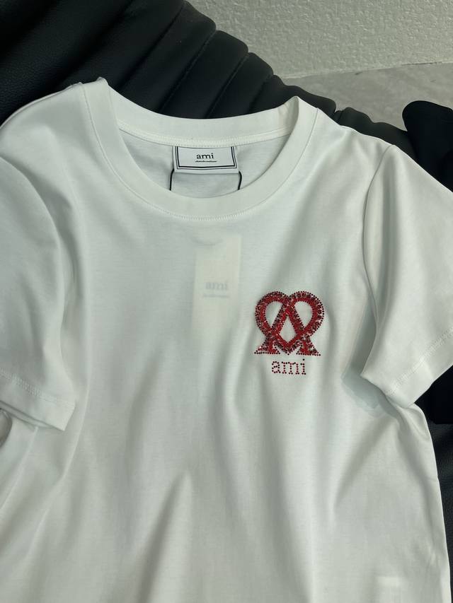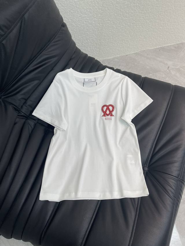 Ami* Spring /Summer 2026 New Beaded Letter Logo Short-Sleeve T-Shirt. Made of custom Yb mercerized cotton, breathable and comfortable with a premium feel. Regular short-sleeve cut with straight shoulders. The eye-catching red Ami* heart logo contrasts beautifully with the classic red and white and black and red color scheme. The simple embroidered sequined lettering exudes a sophisticated luxury brand vibe. Even a basic T-shirt can look high-end. A versatile wardrobe staple for wearing alone or layering, it blends casualness and sophistication into everyday outfits, highlighting the brand's style and exuding high-end fashion. Sml Aa. DDD