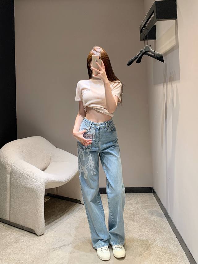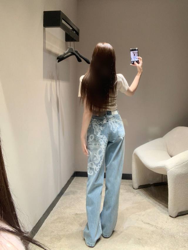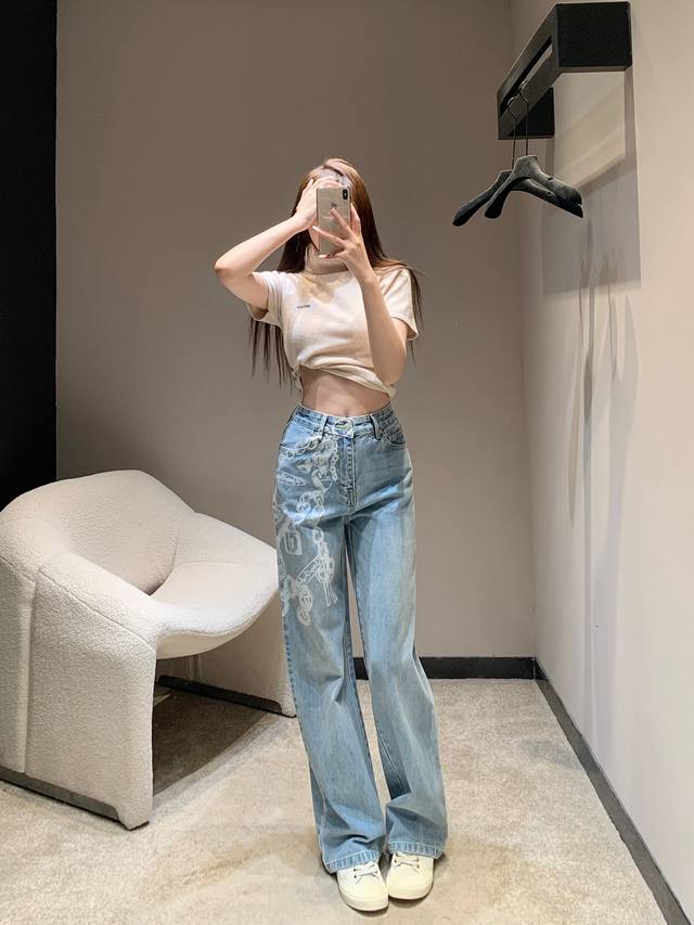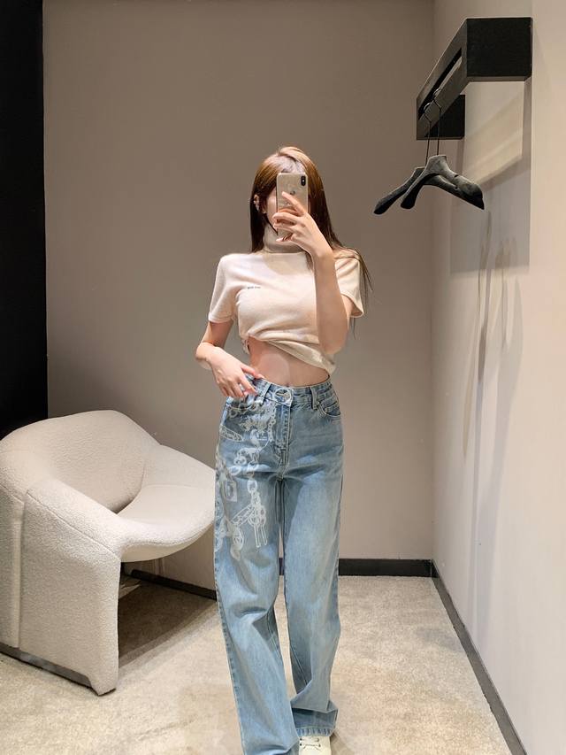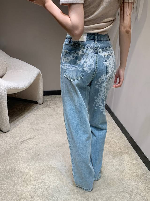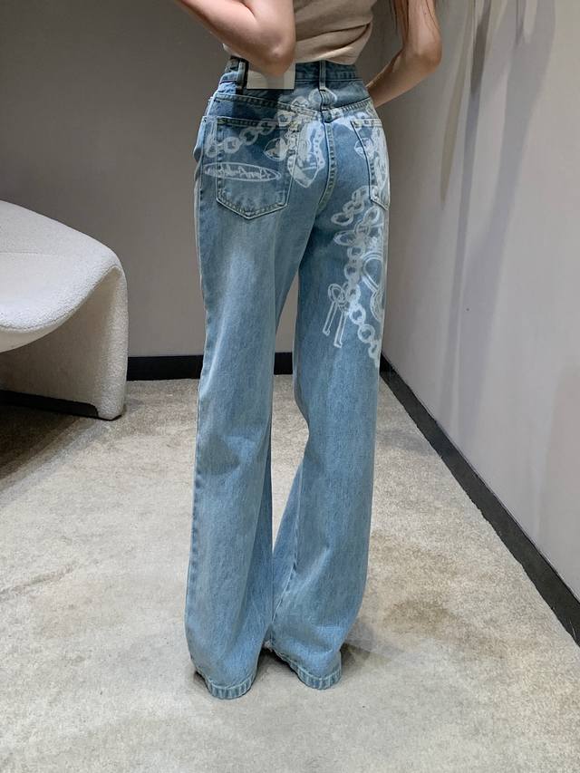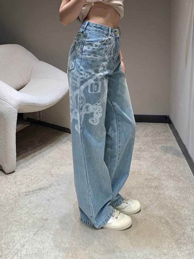 Ann Andelman 25Fw Fall/Winter New Chain Print Loose-fit Jeans | Exclusive High-quality! The light wash blue denim base exudes a casual vibe, while the all-over white chain print and decorative patterns create a clean and rebellious look, breaking away from the monotony of basic denim. The print details combine brand recognition with an artistic touch! Available now in sizes S, M, L, D.D.