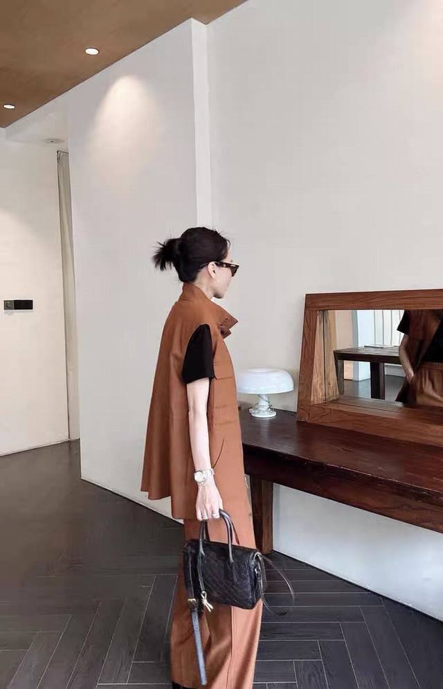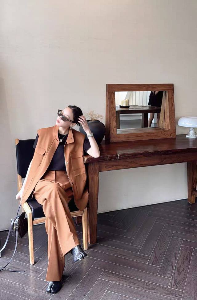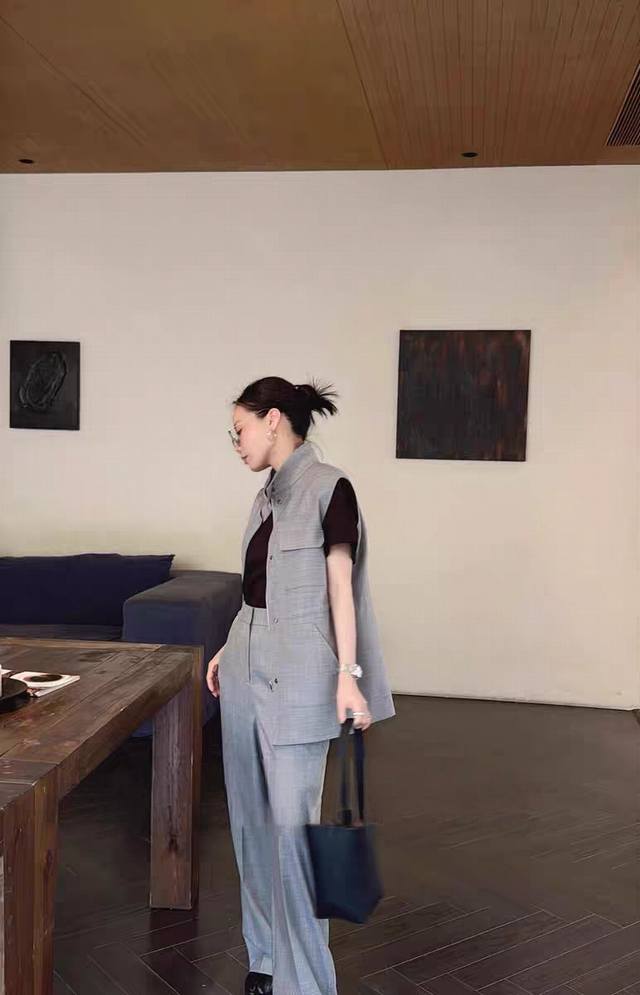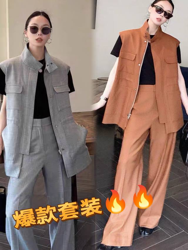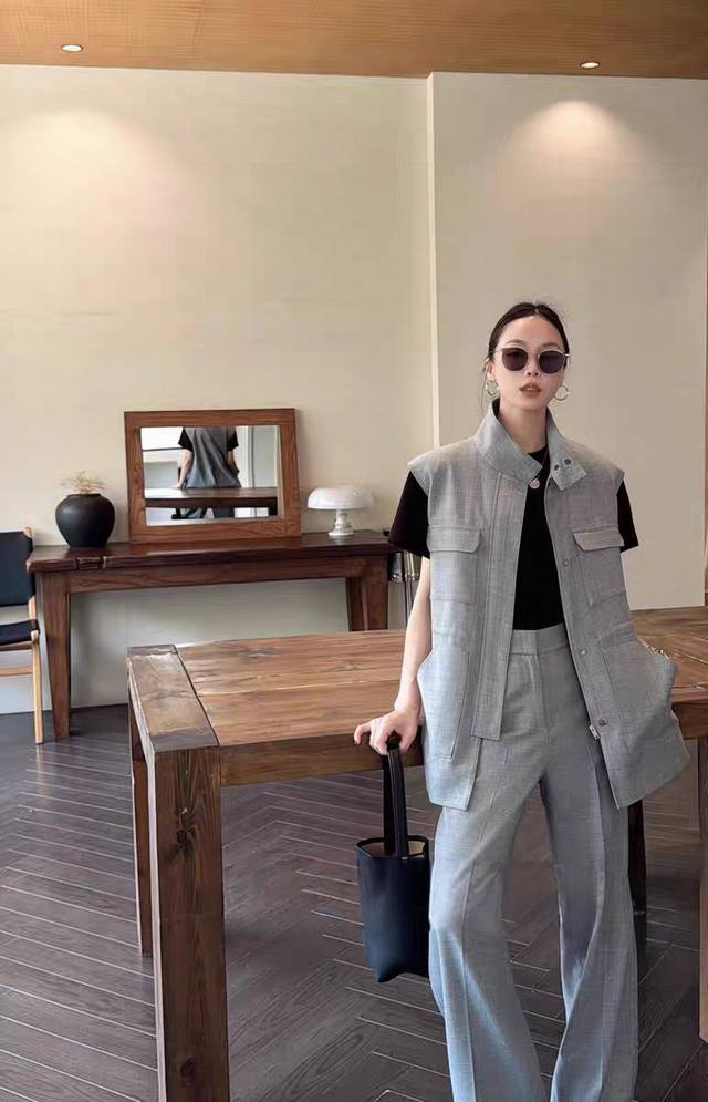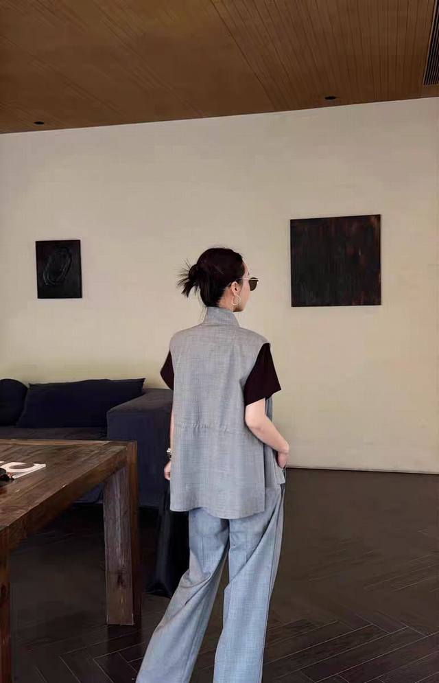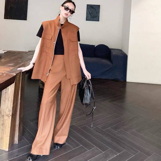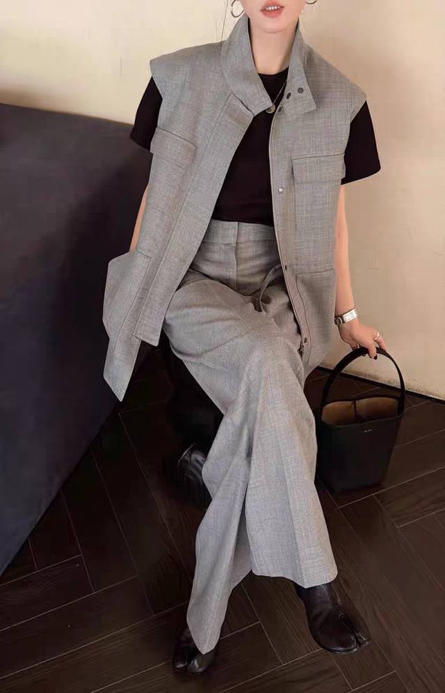 Autumn hot-selling heavy-duty ultra-fashionable temperament imported custom wool loose silhouette stand-up collar drawstring slimming wool vest + straight pants slimming suit two-color four-size SML Xl