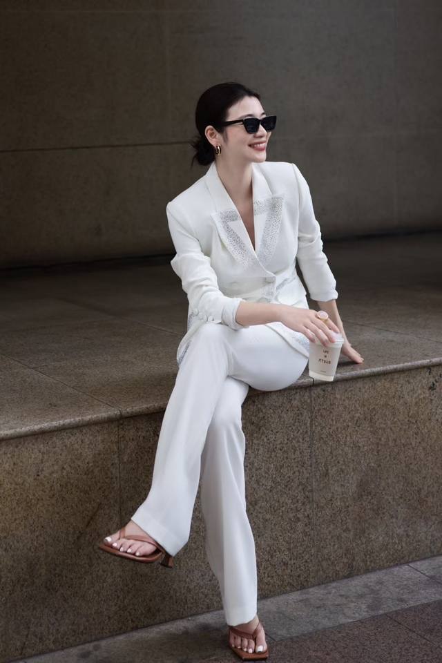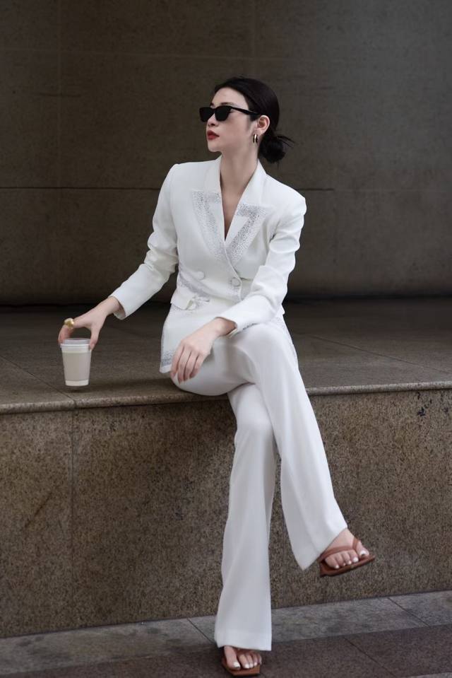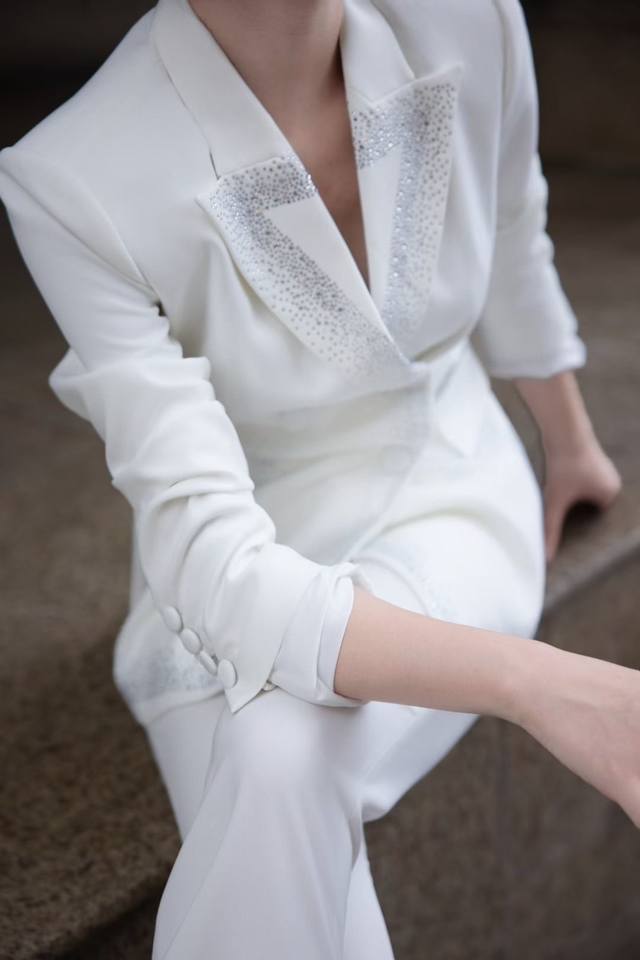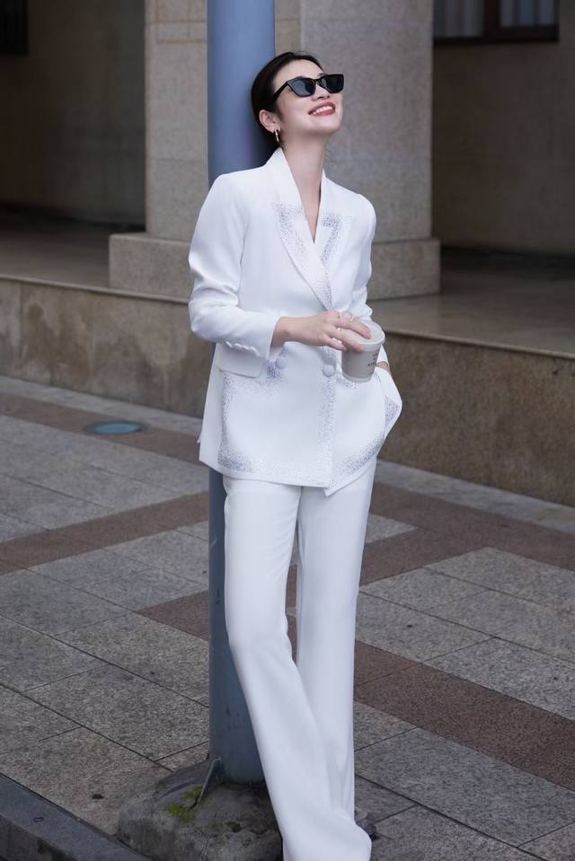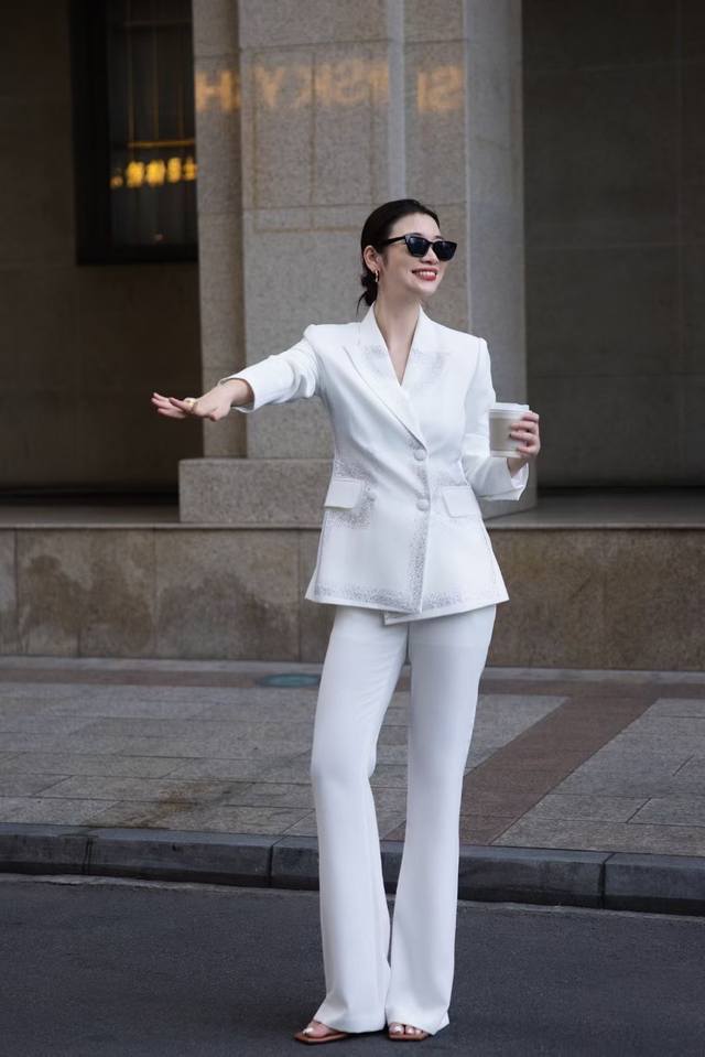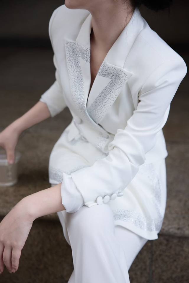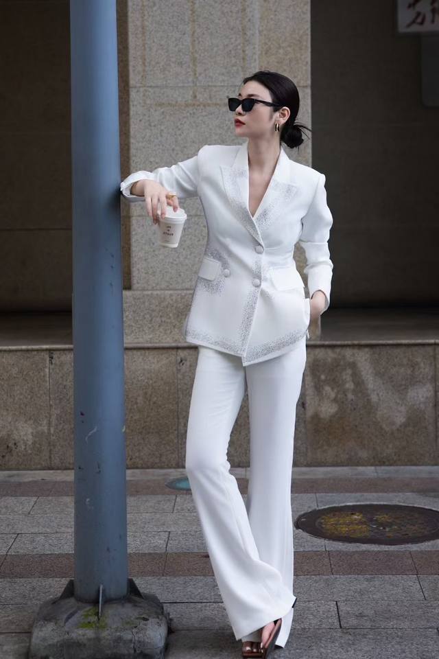 Autumn new double-breasted heavy-duty hot diamond suit + V-neck trousers suit white black red Smlxl