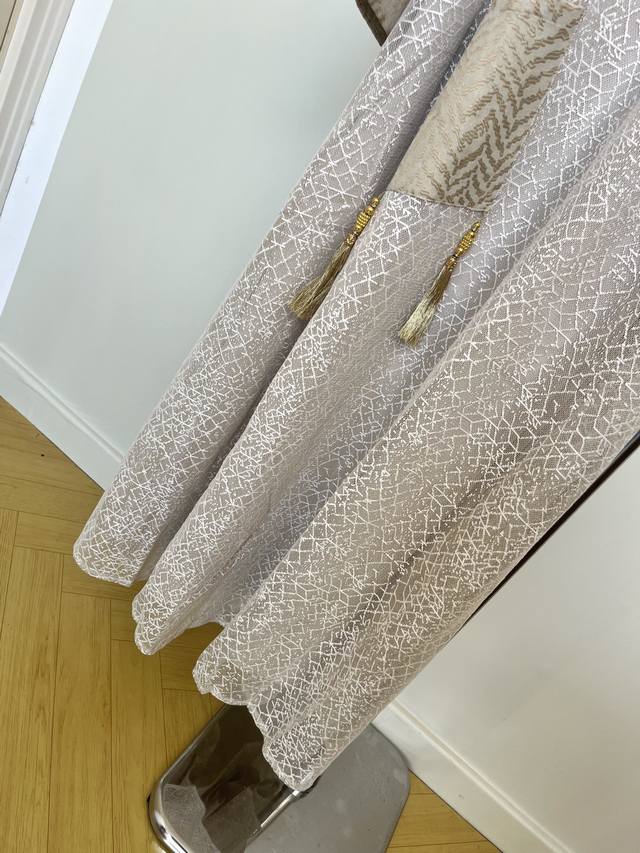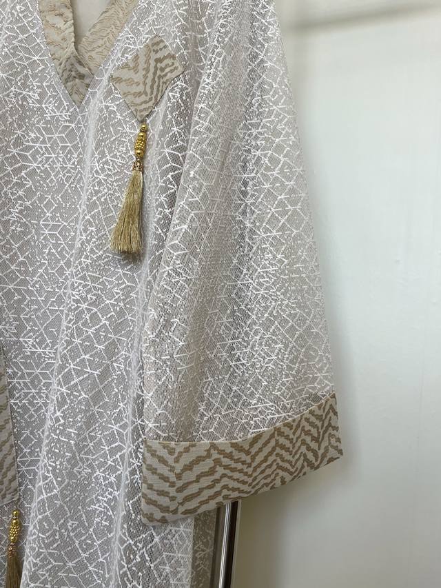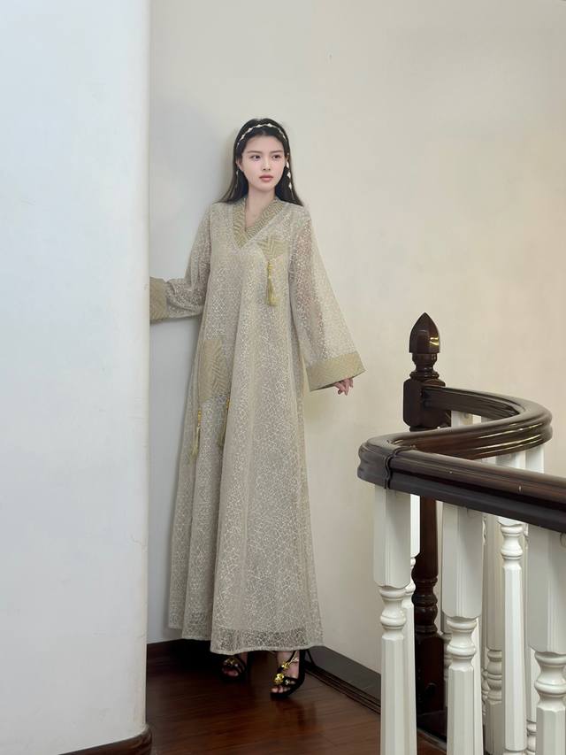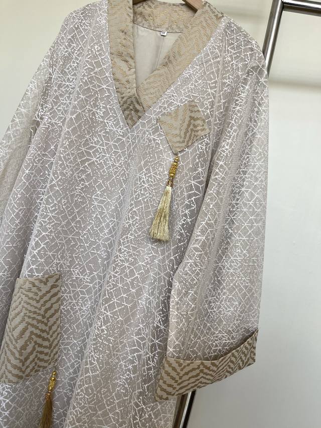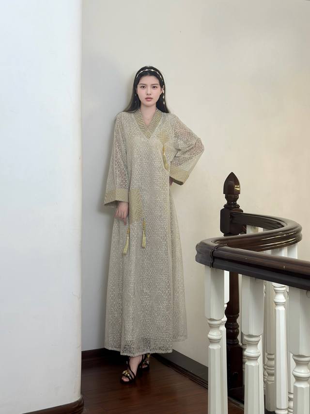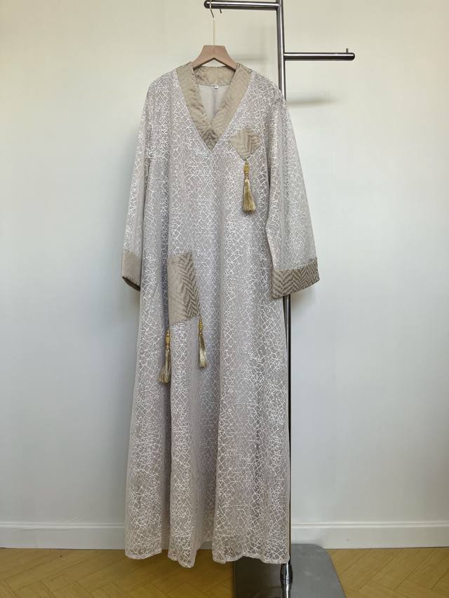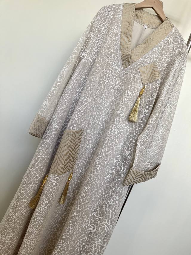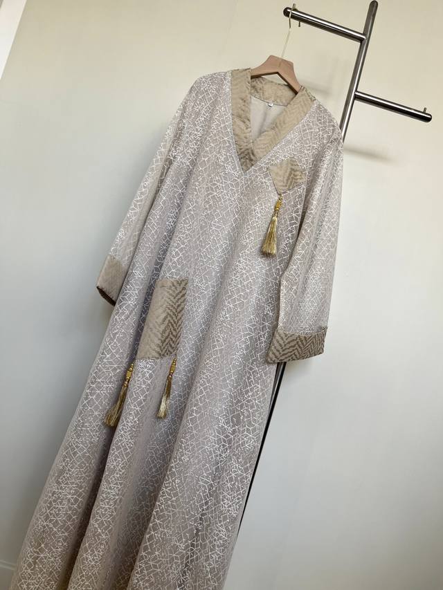 This dress features a soft, light gold hue, and delicate textures that shimmer like stars, radiating elegance and luxury. The classic V-neck design, accented with tassels, adds a touch of agility and romance. The loose fit makes it comfortable and effortless, making it a focal point for both daily commutes and banquets, showcasing your unique fashion sense.