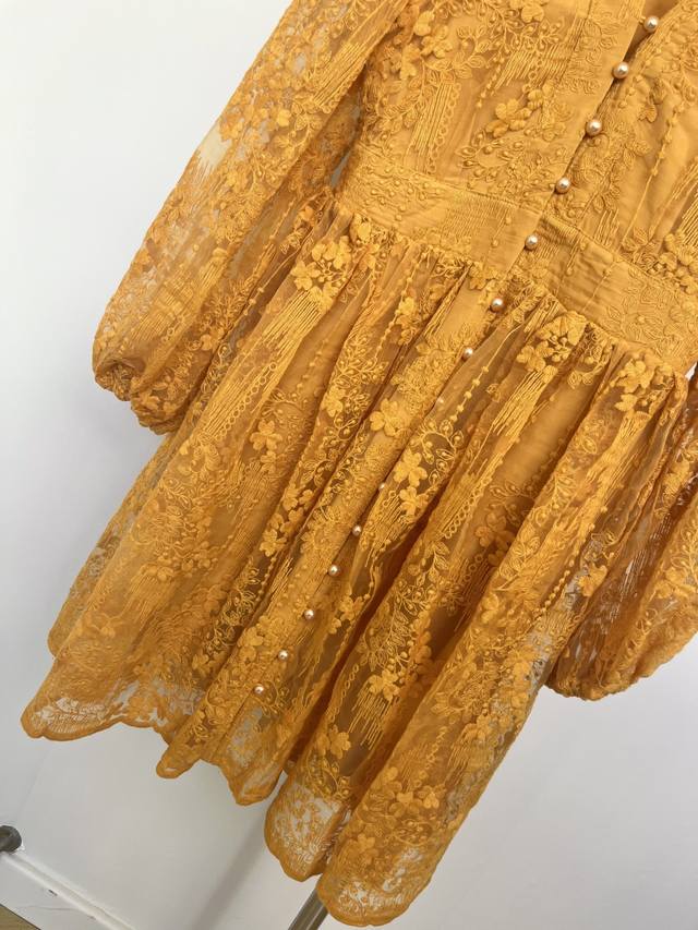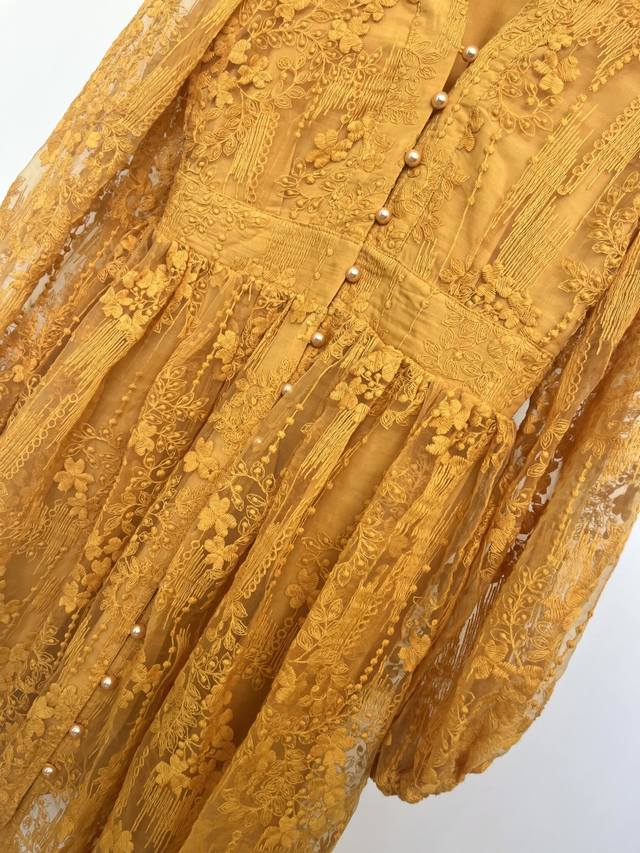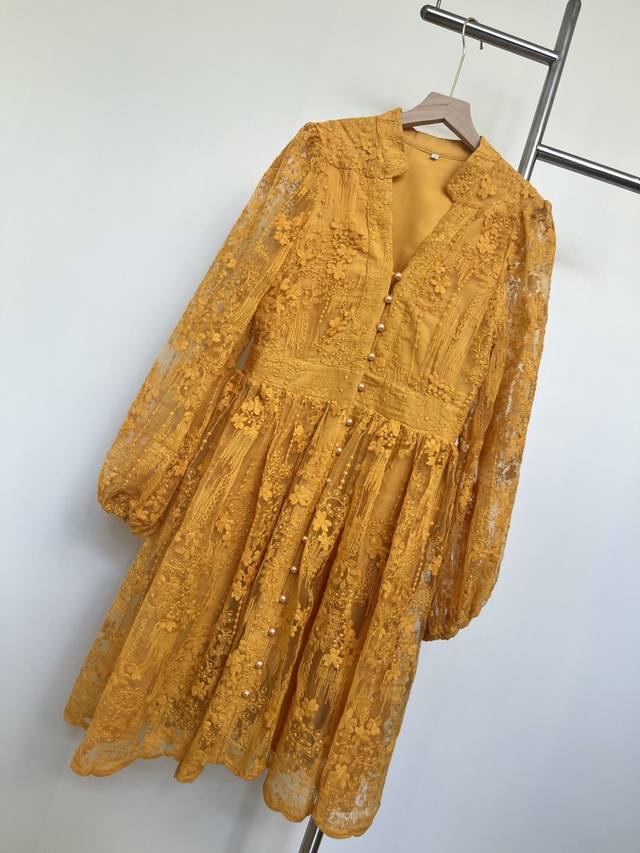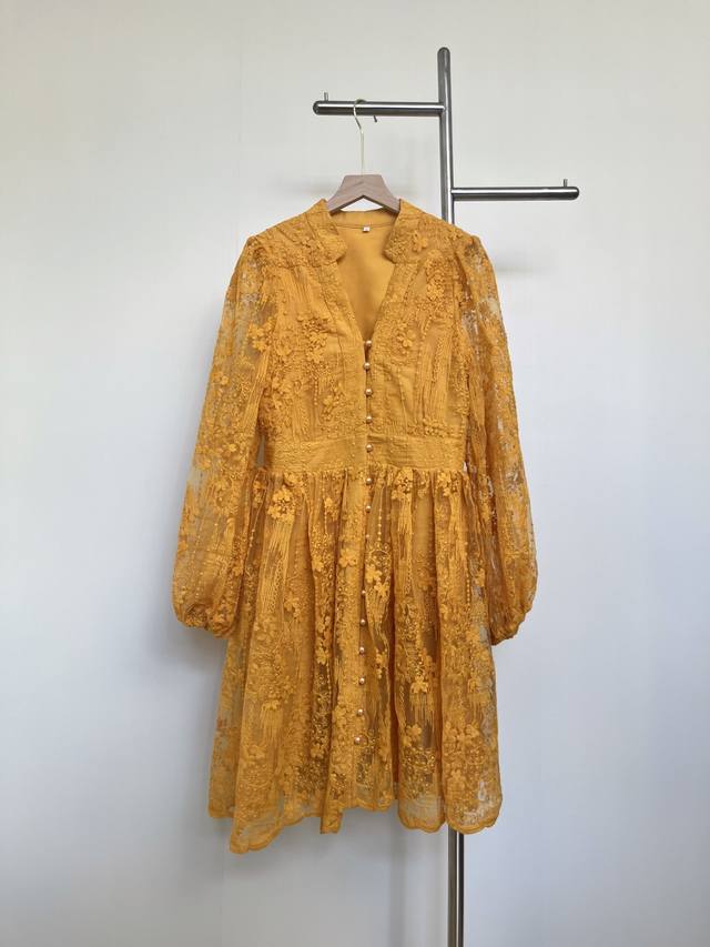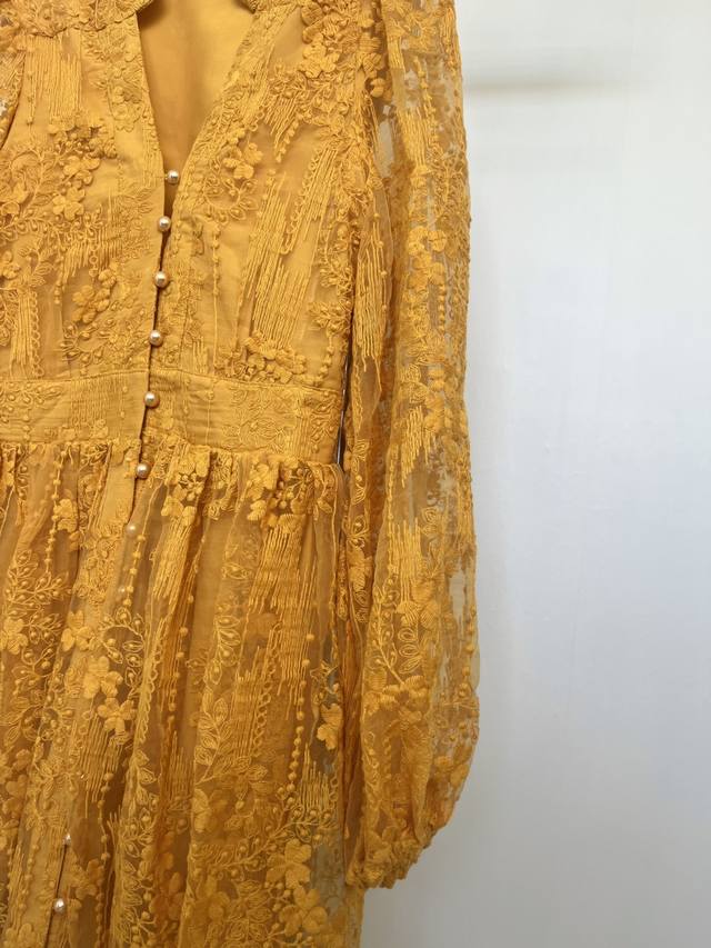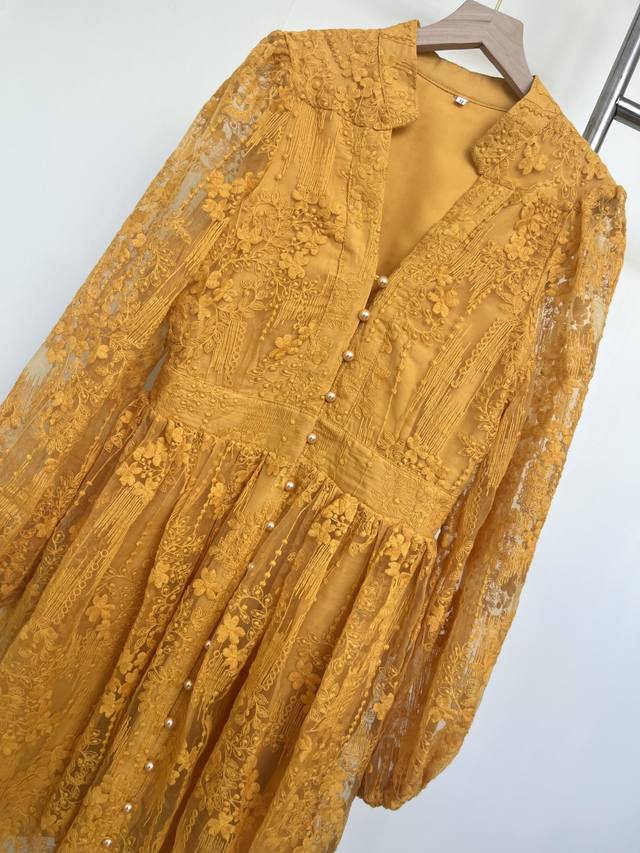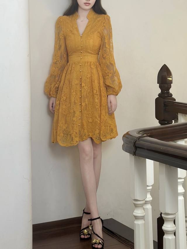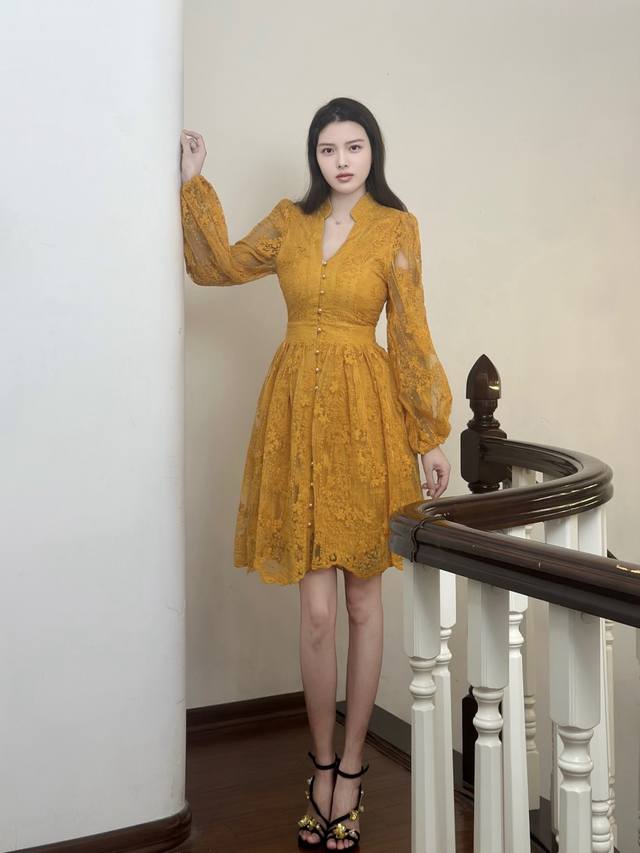 Set against a vibrant turmeric background, the allover lace dress seems to weave sunlight into the fabric. The V-neck and small stand-up collar create a unique charm, while the puff sleeves add a retro and soft touch, and the cinched waist accentuates the graceful curves. Wearing this dress is like wearing the whispers of autumn, exuding unique charm as you walk, and encountering unexpected romance.