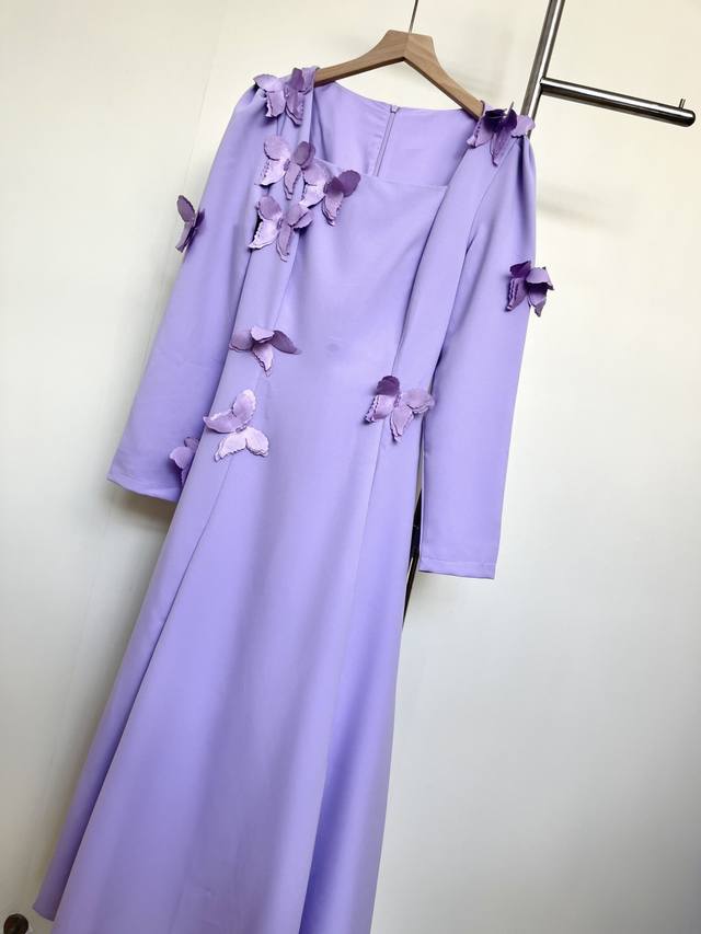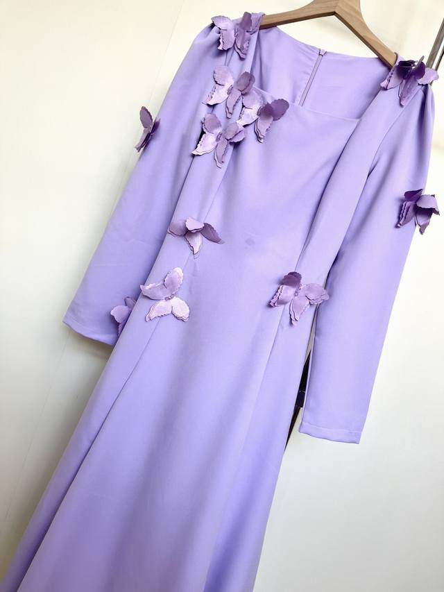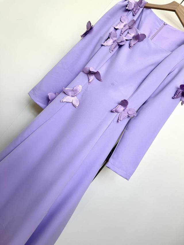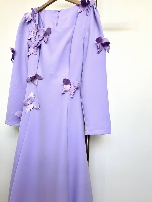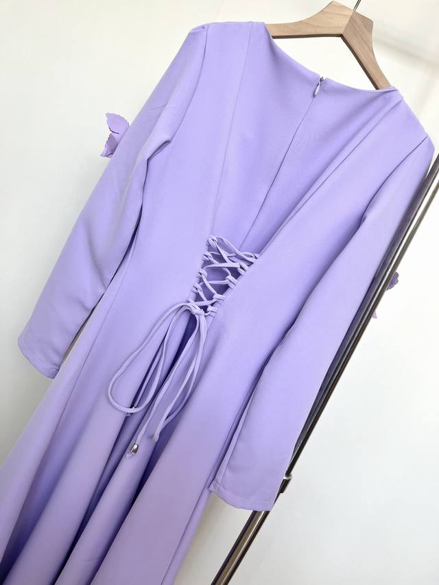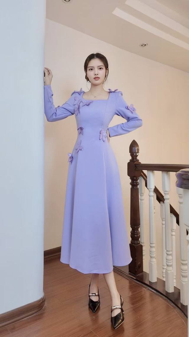 Set in lavender, the square neckline and 3D petals create a French elegance. The draped hem embodies a yearning for freedom and romance, and every detail of the design speaks to the idea: Wear this and you'll be a literary heroine strolling through Provence.