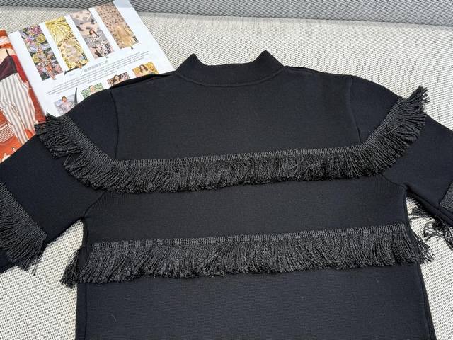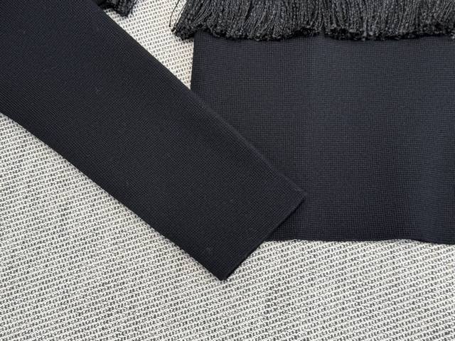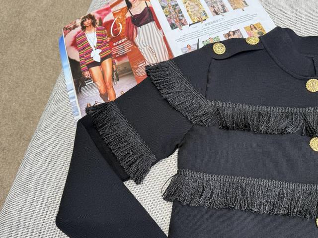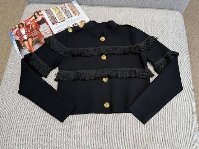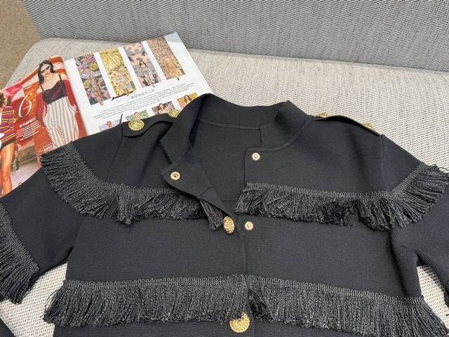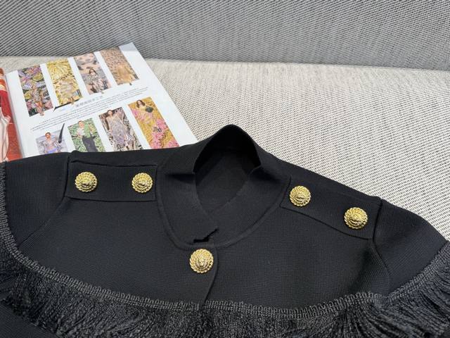 Black tassel short jacket with gold lion head buttons for a layered look. Tassels at the shoulders and cuffs, paired with gold buttons on the front, create a simple and elegant look.