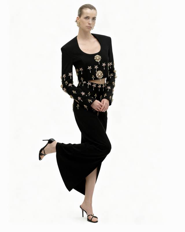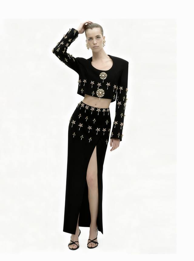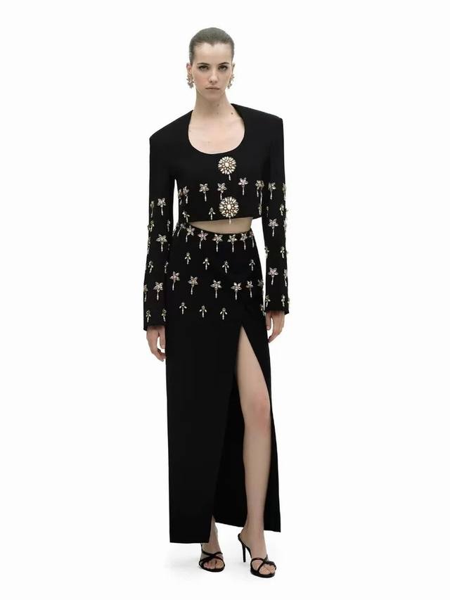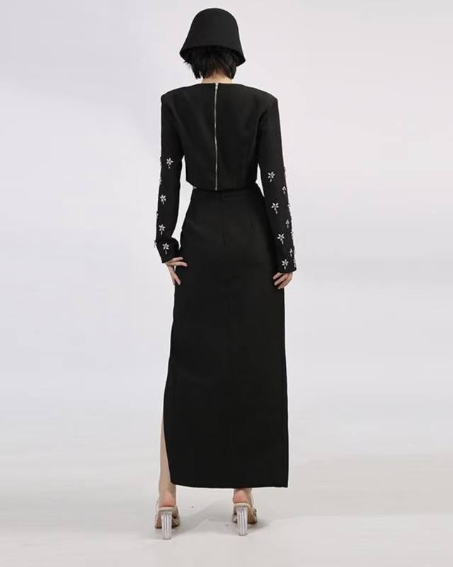 Balmai*N Balmai's new high-end custom heavy-duty craftsmanship, high-temperature reinforced hot-fix rhinestones, blingbling luxury and high-class temperament two-piece set! Square neck short long-sleeved top, sexy high-slit bodycon long skirt! Black, size M: shoulder width 37 with shoulder pads, bust 76, sleeve length 64, top length 36; waist 64 (elastic), skirt length 105 DDD