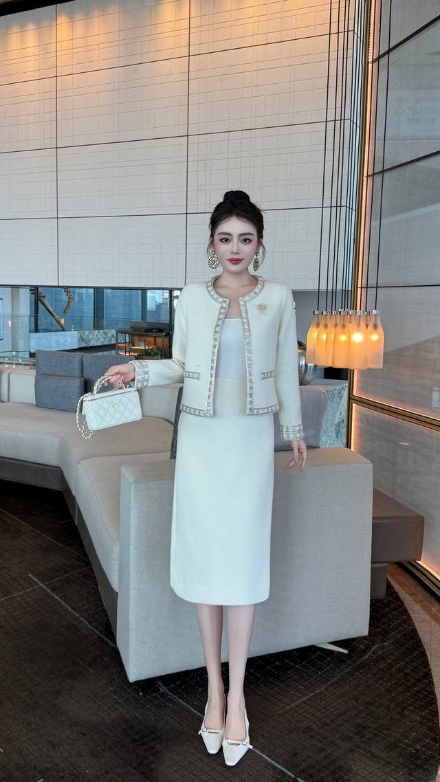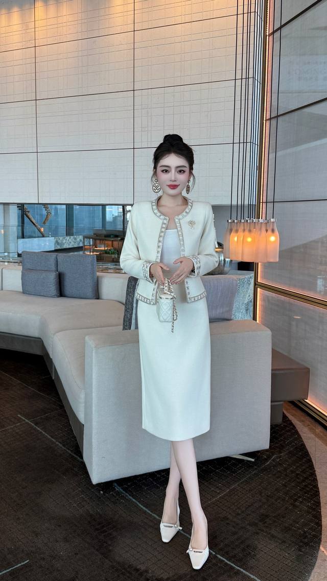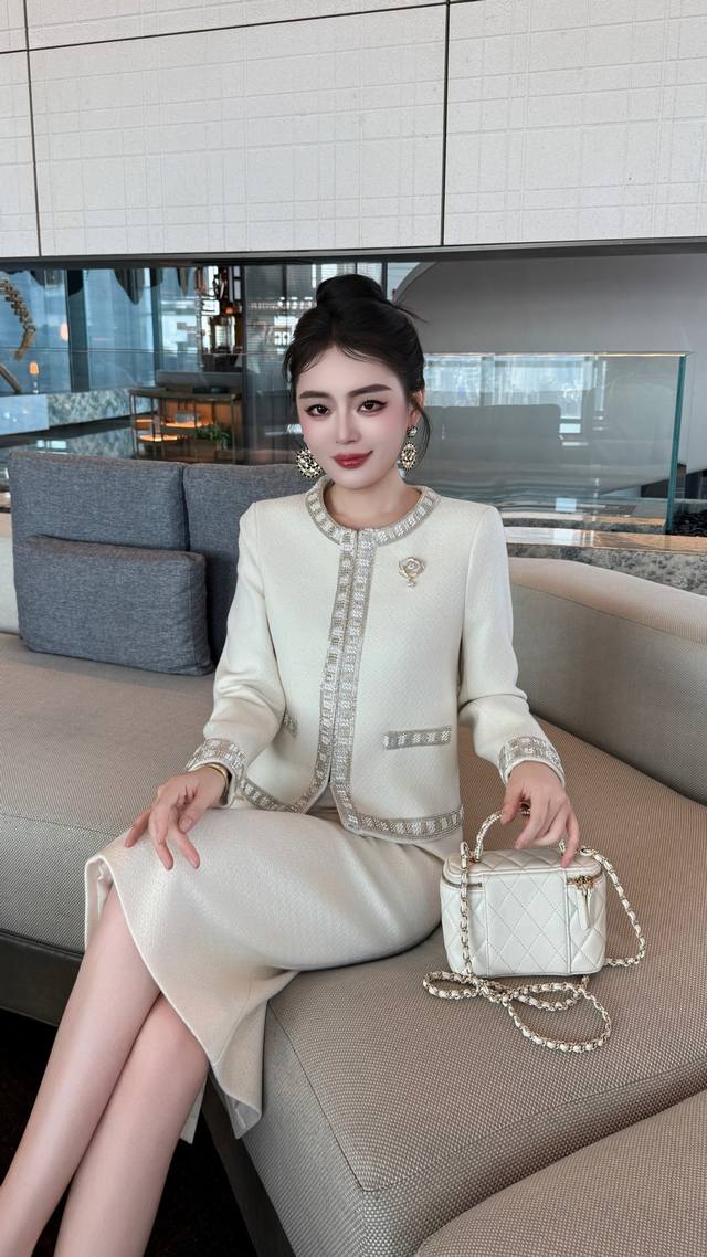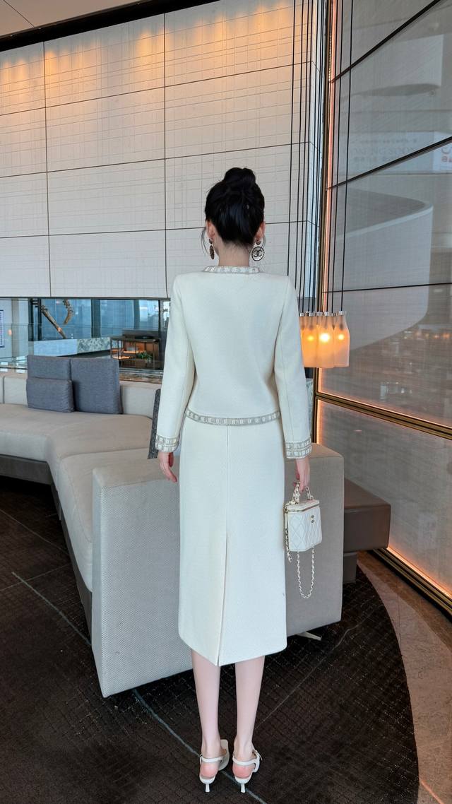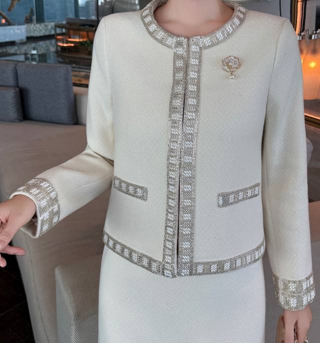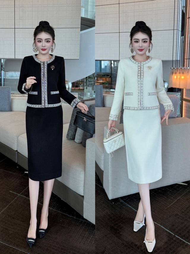 Black and white S~Xxl sizes woolen fabric suit 2025 autumn and winter new arrivals, celebrity temperament, small fragrance style, high-end fashion, round neck, heavy bead chain suit, slim fit, slimming and tall top jacket + skirt 2-piece set, comfortable fabric with a good drape, super fairy and beautiful, tall and slim, elegant and goddess-like, a favorite