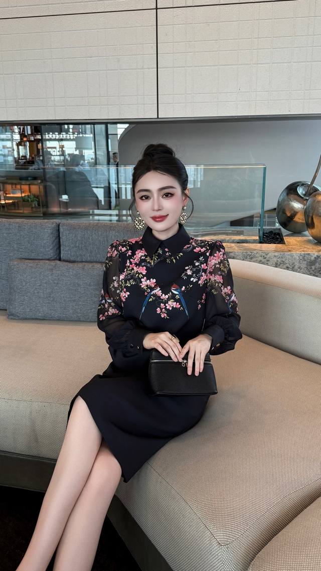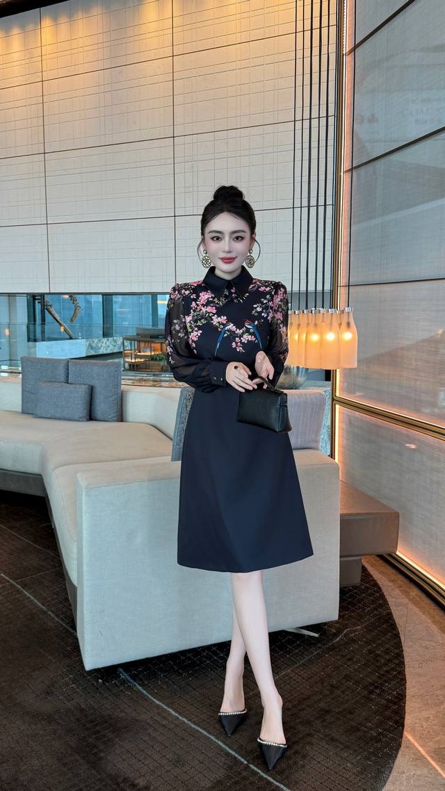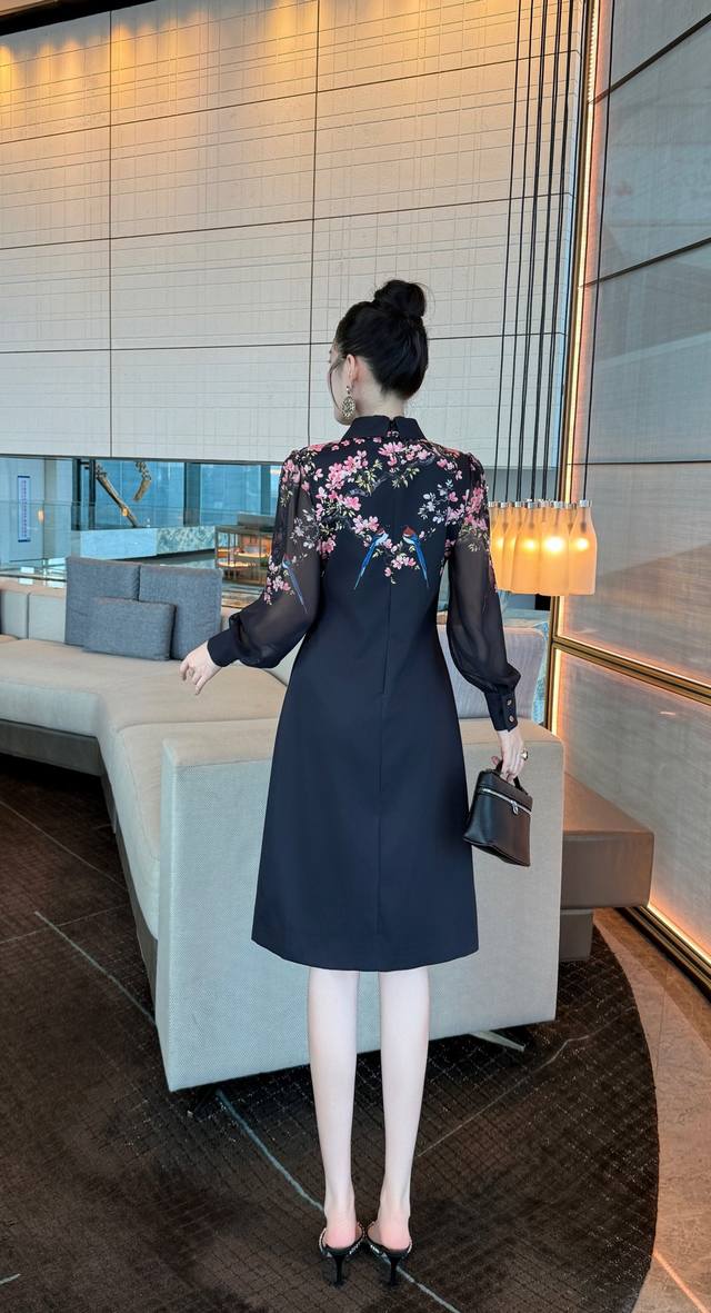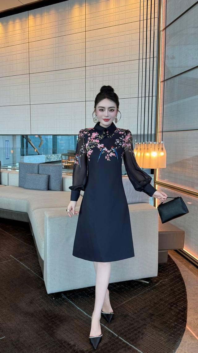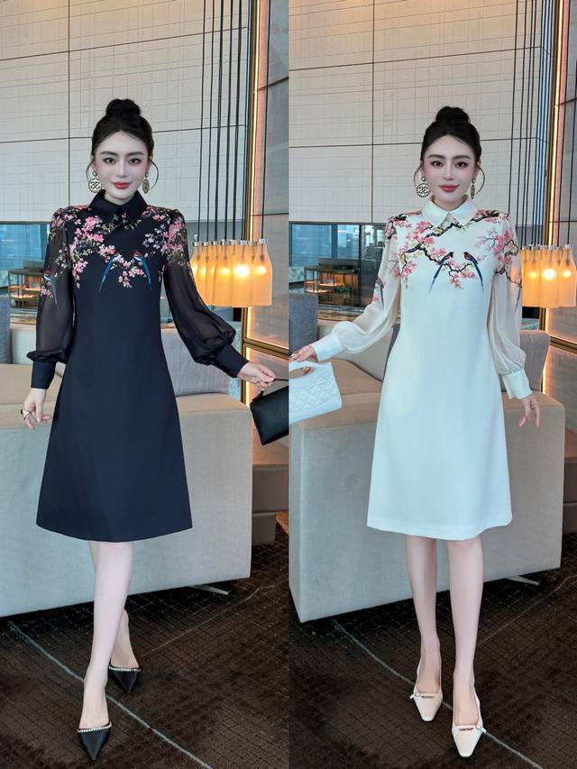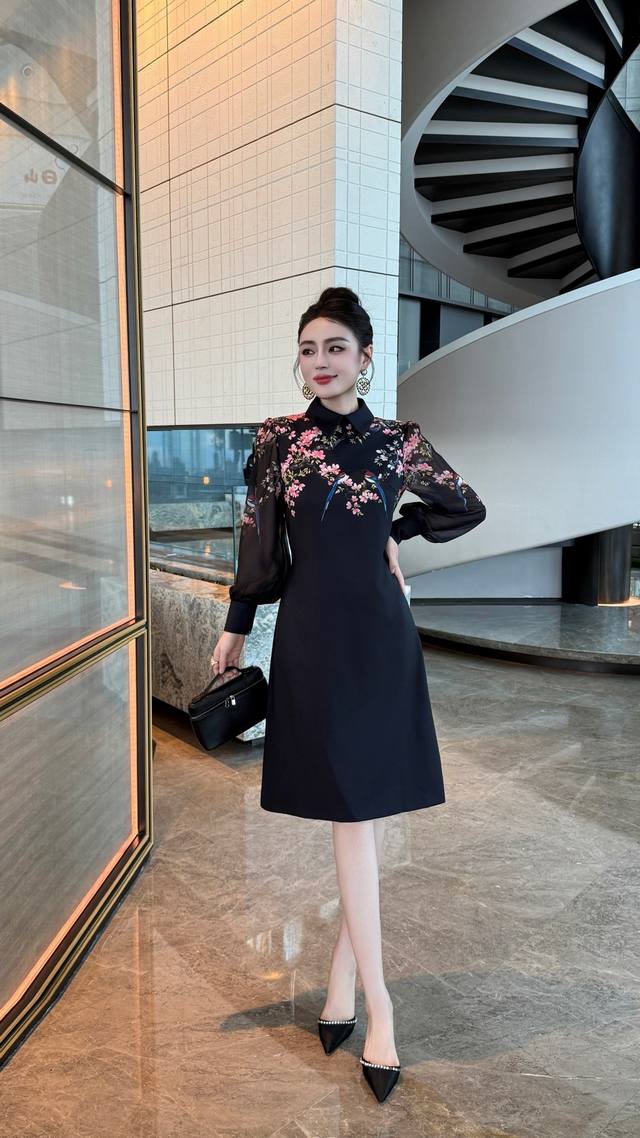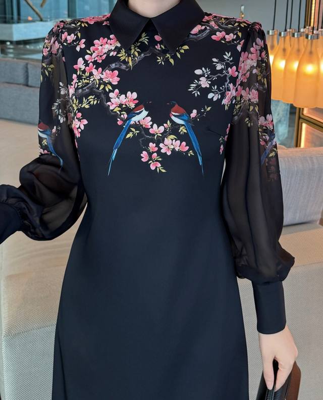 Black apricot color S~Xxl 5 sizes - 2025 early autumn new arrival, high-end and stylish, fashionable and stylish. Peach blossom print, bird lapel, transparent sleeve A-line skirt, extended length, pockets, quality and shape are superb! It looks good on everyone~ The waist-hugging shape is suitable for all body shapes~ Exquisite and elegant~ Super fairy and beautiful, versatile and goddess-like
