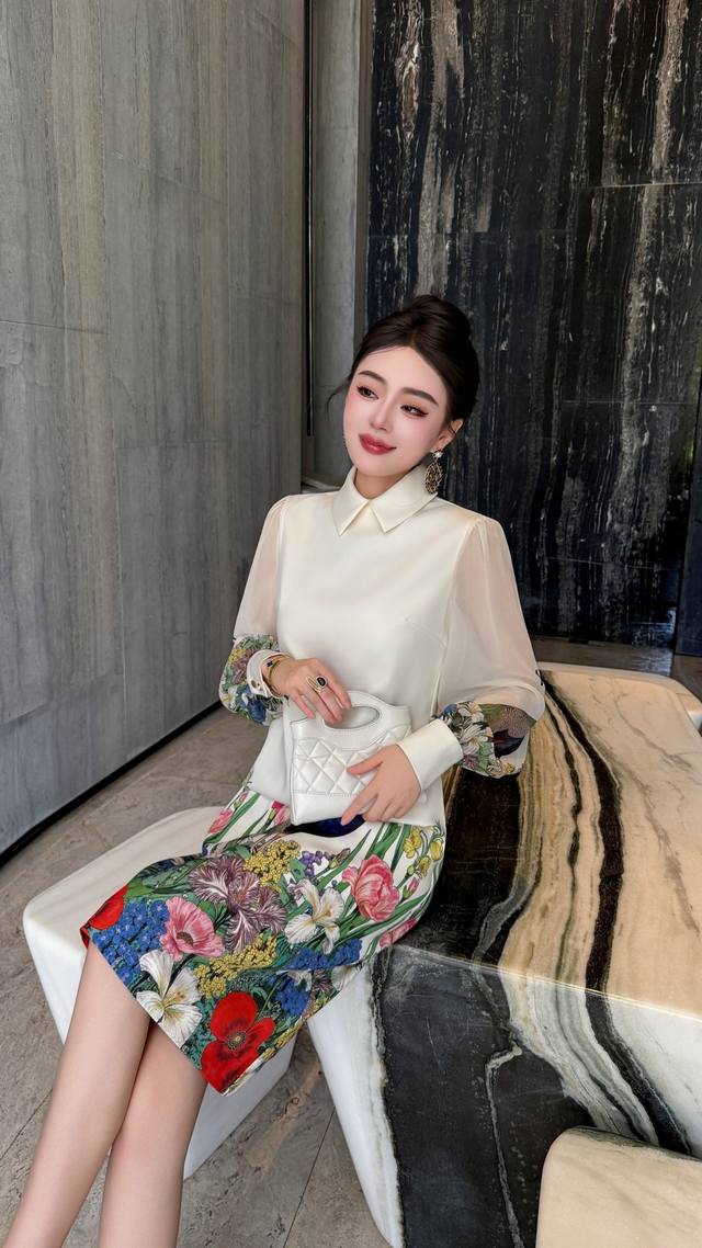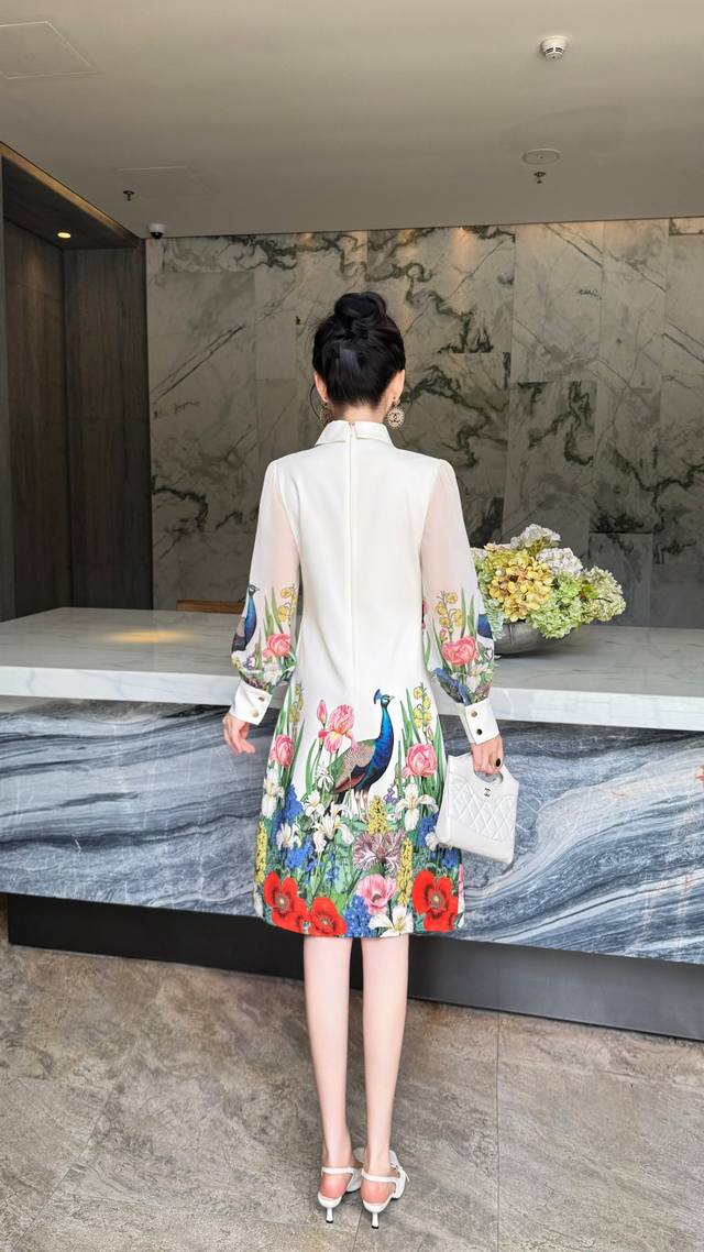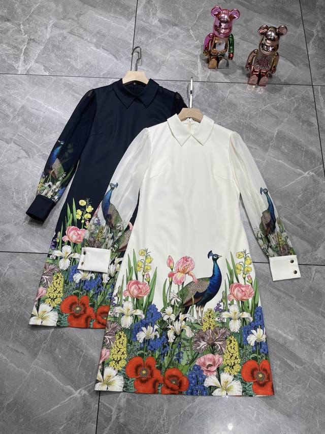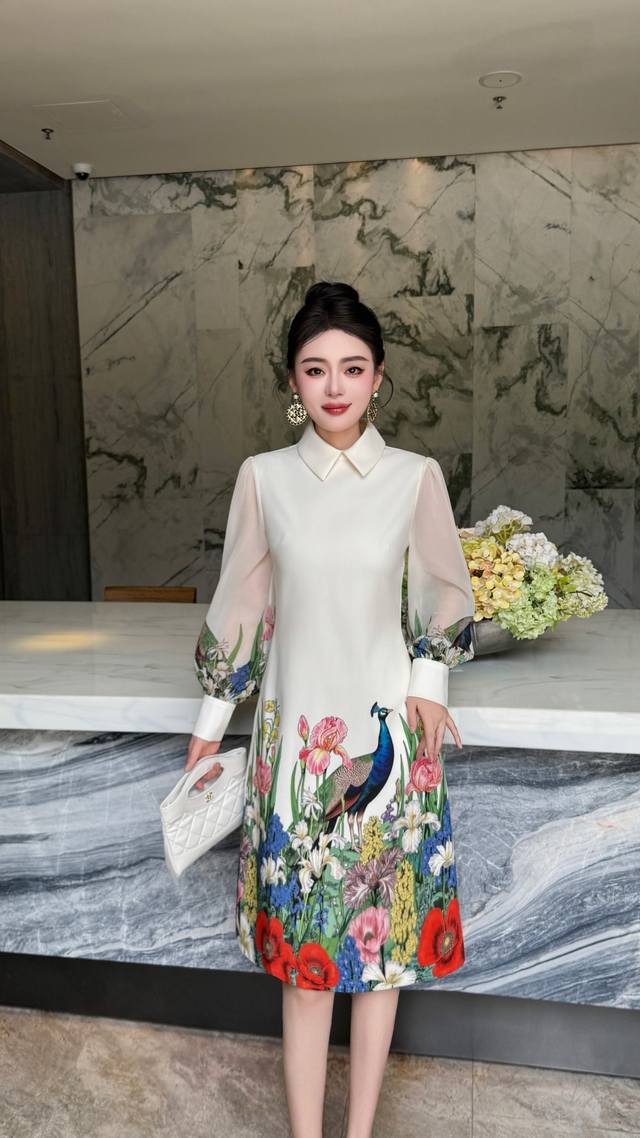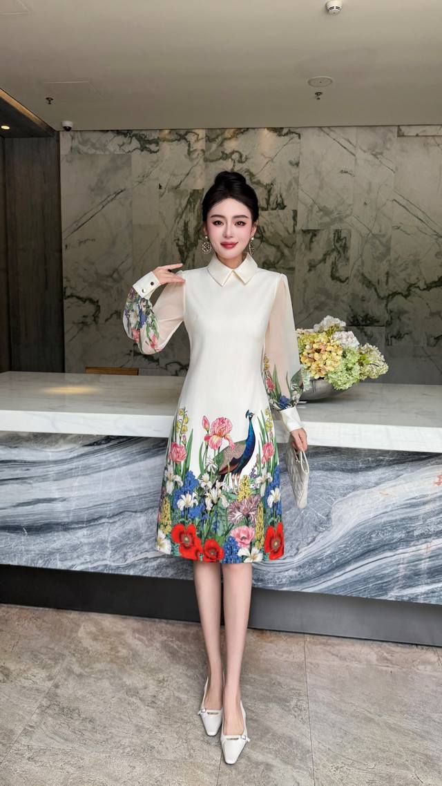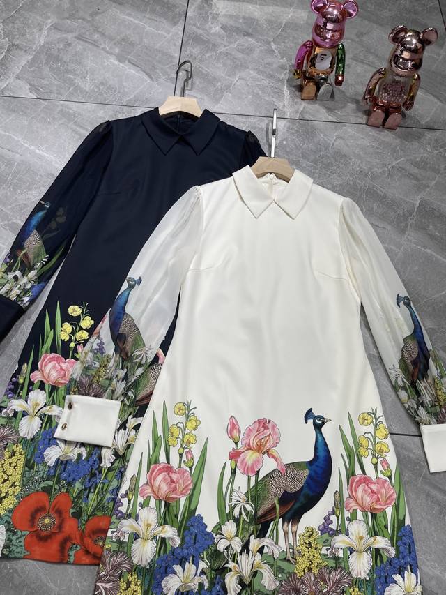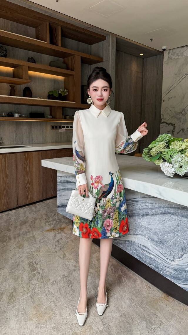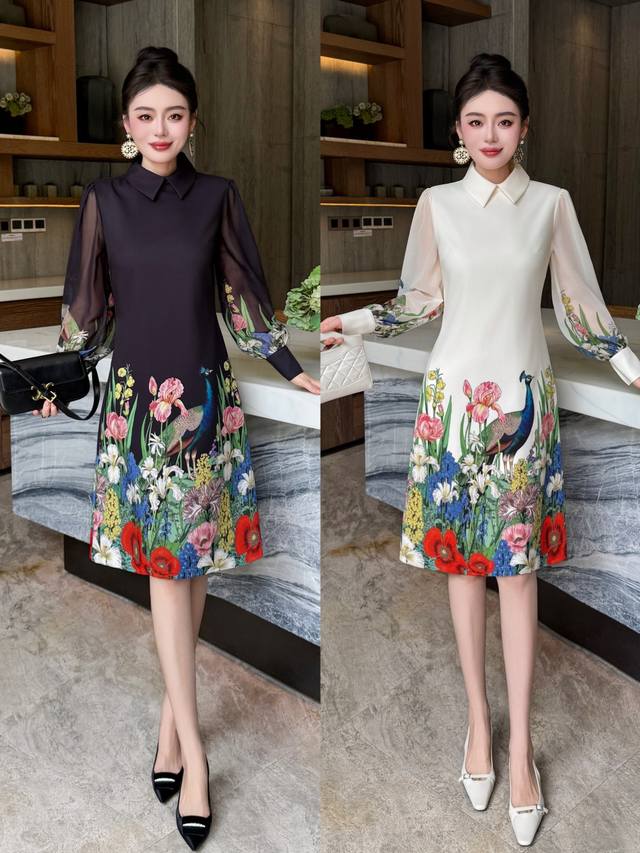 Black apricot color S~Xxl 5 sizes - 2025 early autumn new arrival, high-end and stylish. Peacock print lapel splicing transparent sleeve A-line skirt, extended length with pockets, quality and shape are superb! Looks good on everyone~ Waist-hugging shape, suitable for all body types ~ Exquisite and elegant~ Super fairy, super beautiful, versatile and goddess-like