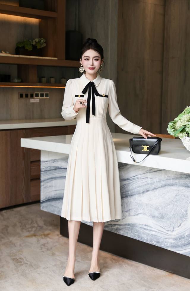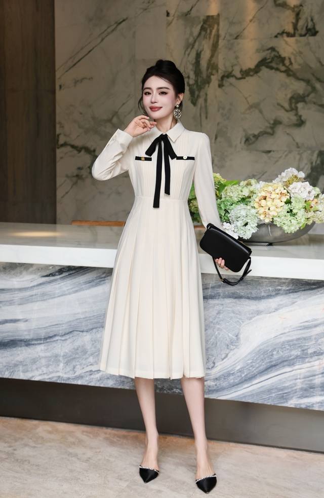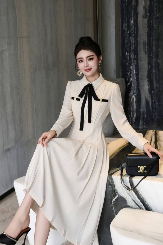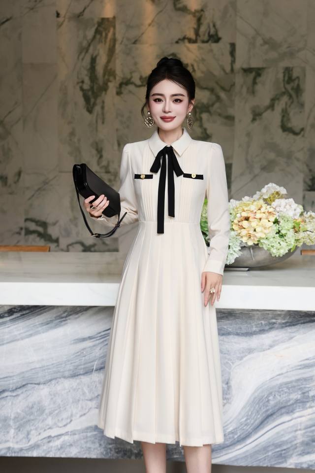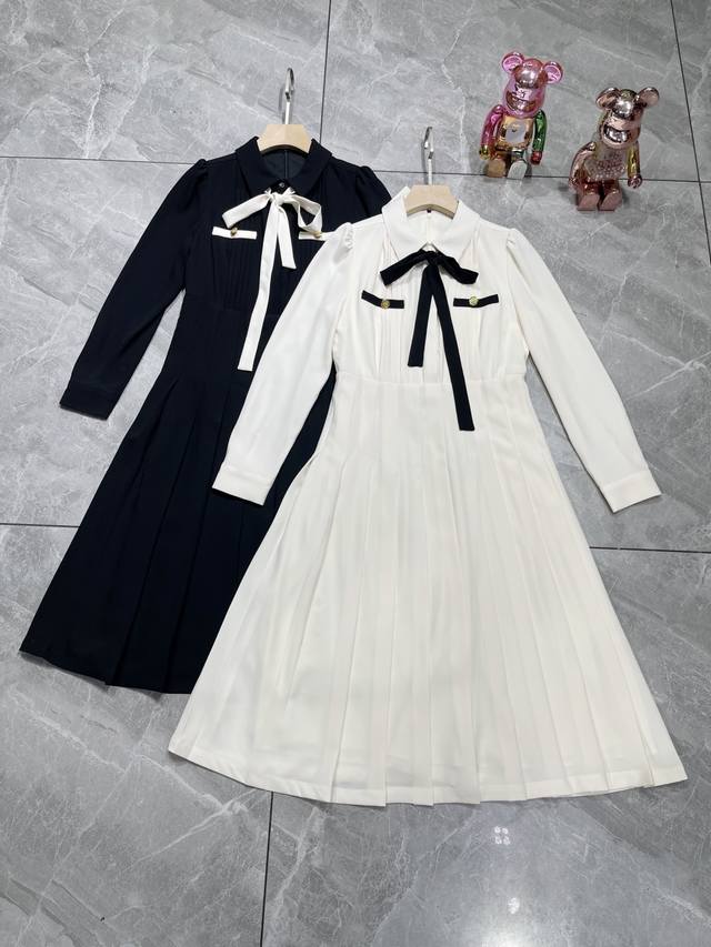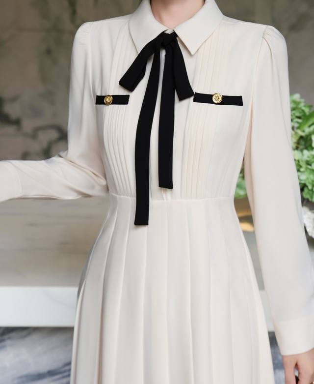 Black apricot S-Xxl 5 sizes ~ 2025 autumn and winter new arrivals French lady temperament shirt collar tie butterfly contrast pleated maxi skirt A-line swing dress, high-end atmosphere slimming and slimming solid color simple but not simple, elegant and noble, a favorite