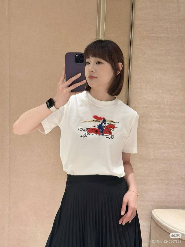 Burber*Y 26Ss New Year Limited Edition Equestrian Knight Logo Crew Neck Short Sleeve T-Shirt | Exclusive Yb Development! High-Quality Production! Featuring a classic crew neck cut and a relaxed silhouette, this T-shirt is crafted from soft cotton for ultimate comfort. The embroidered equestrian knight logo on the chest incorporates a New Year's red and pure white color scheme, with 3D embroidery details. The limited-edition red hue adds to the festive atmosphere. The simple design is versatile enough for various everyday wear occasions, a fusion of understated luxury and holiday style. Available now in sizes S, M, L, D.D.
