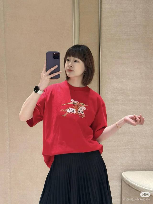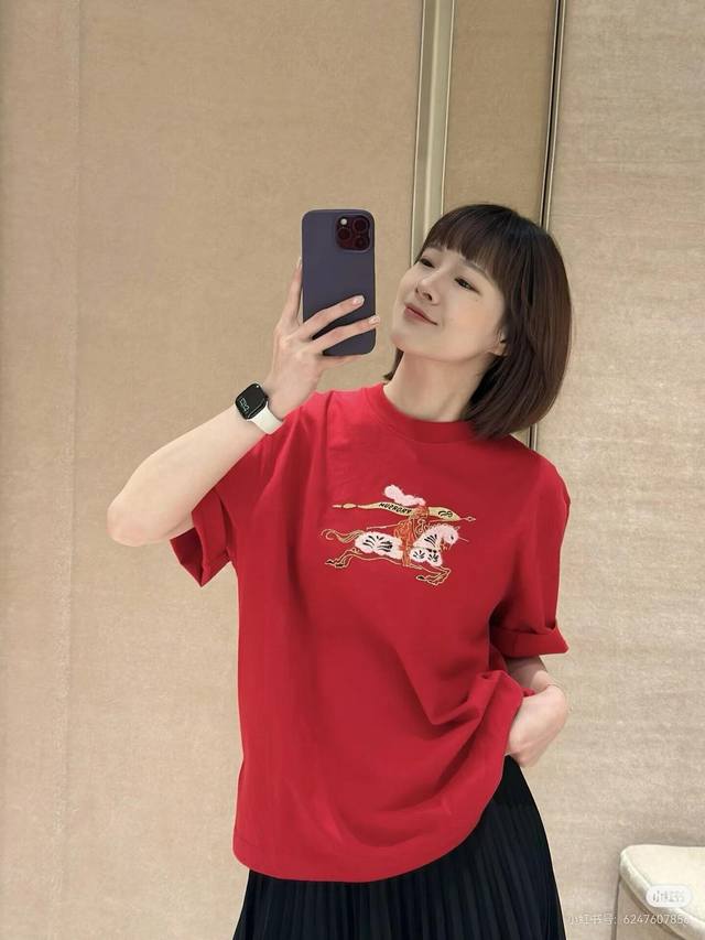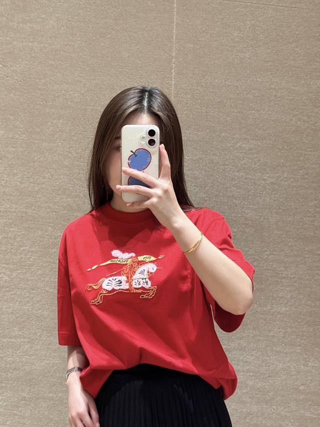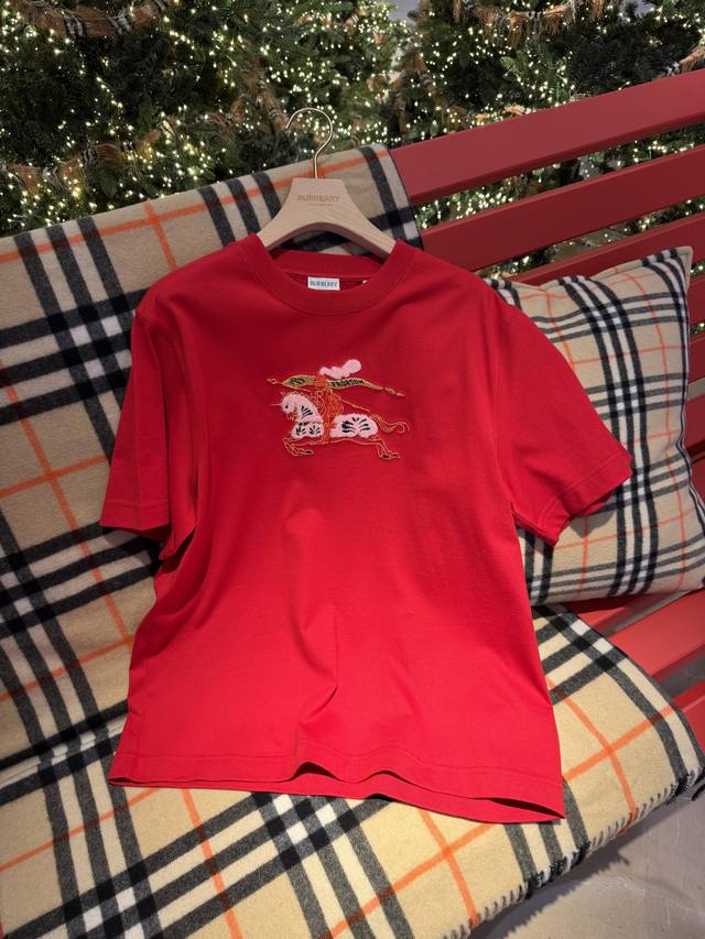 Burber*Y 26Ss New Year Limited Edition Equestrian Knight Logo Crew Neck Short Sleeve T-Shirt | Exclusive Yb Development! High-Quality Production! Featuring a classic crew neck cut and a relaxed silhouette, this T-shirt is crafted from soft cotton for ultimate comfort. The embroidered equestrian knight logo on the chest incorporates a New Year's red and pure white color scheme, with 3D embroidery details. The limited-edition red hue adds to the festive atmosphere. The simple design is versatile enough for various everyday wear occasions, a fusion of understated luxury and holiday style. Available now in sizes S, M, L, D.D.