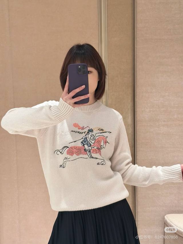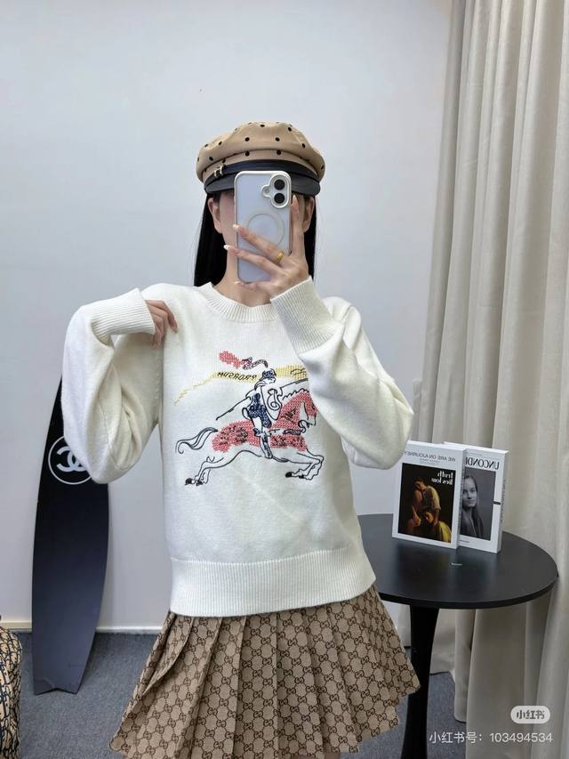 Burber*Y35Fw Autumn/Winter New Arrival Collection: Equestrian Sweater. Made with delicate knit fabric, featuring a classic crew neck and a slim fit. The design highlight is the "equestrian pattern" decoration on the chest: a dynamic equestrian silhouette presented using cross-stitch embroidery. Exquisite details and a high-quality feel are added. Ribbed cuffs and hem complete the look. A must-have for autumn/winter! ~Sml DDD