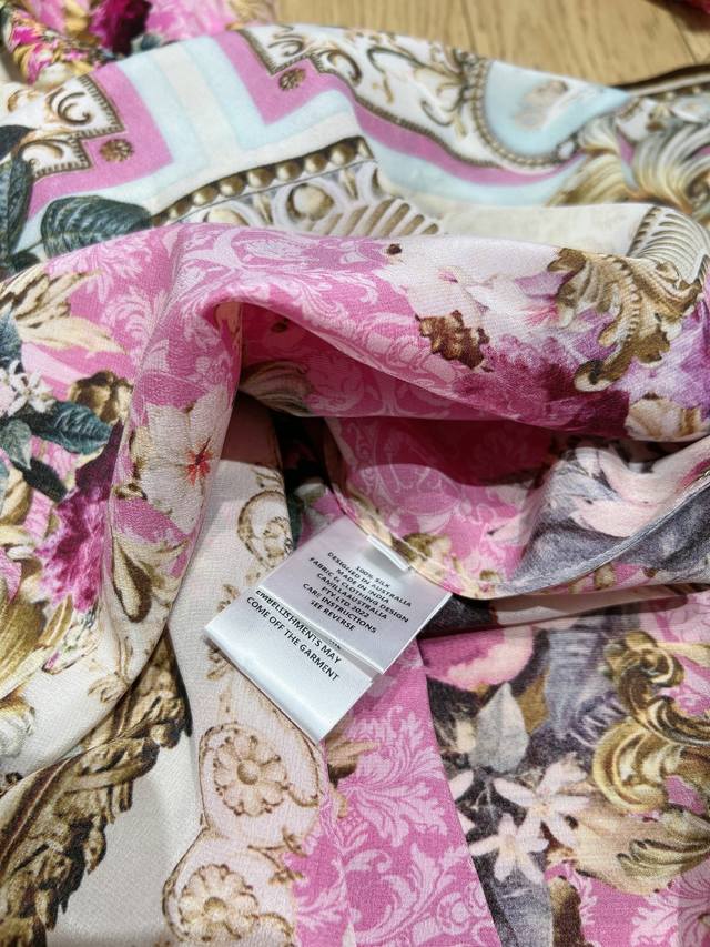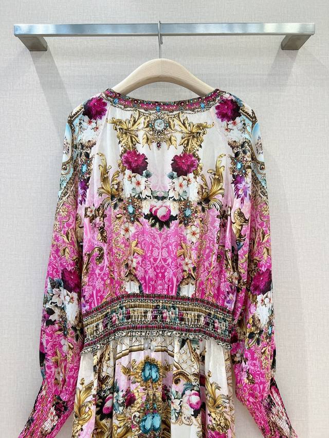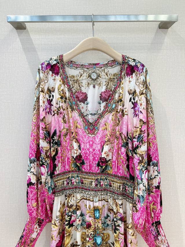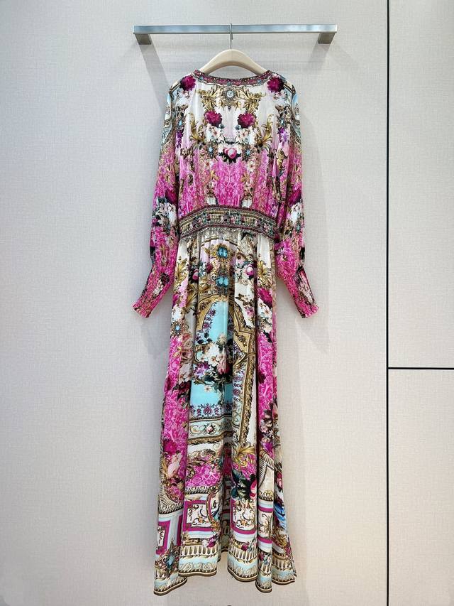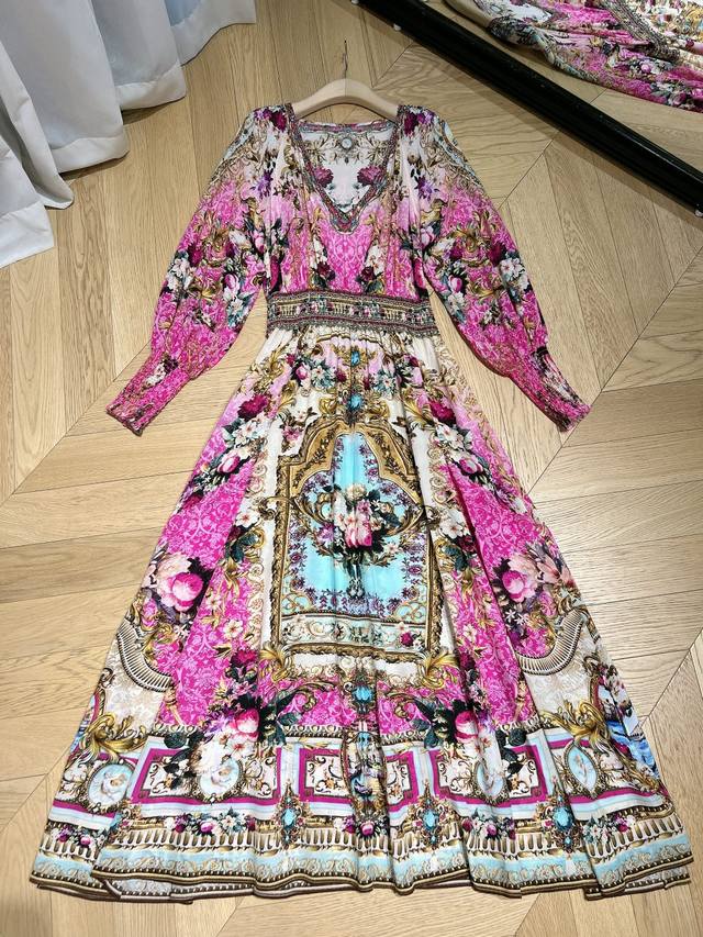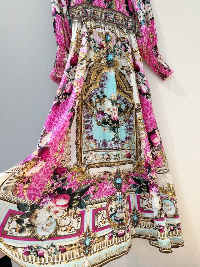 Camill*A Baroque Silk Print Dress DDD French Tea Break Style ~ Classic Baroque pink printed dress, elegant V-neck with custom high-temperature hot-stamped rhinestones, high-waisted elastic waist design, full of aristocratic style ~ 100% heavyweight silk, custom-made exclusive accessories, light and flowing, showing elegant charm with every move ~ DDD Sizes: Smlxl