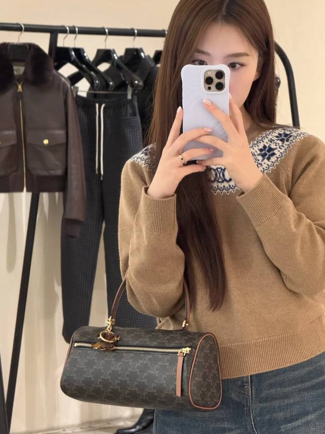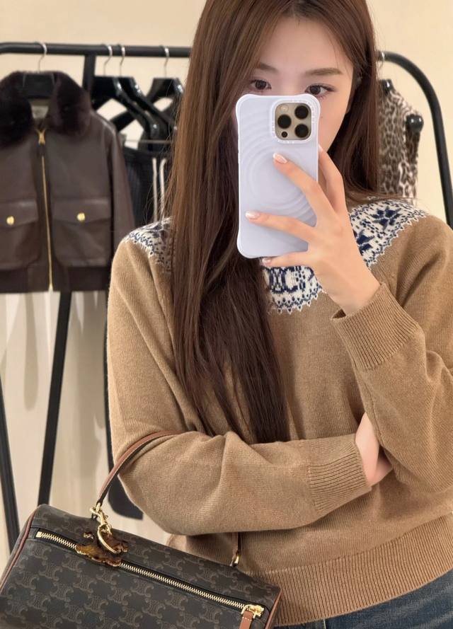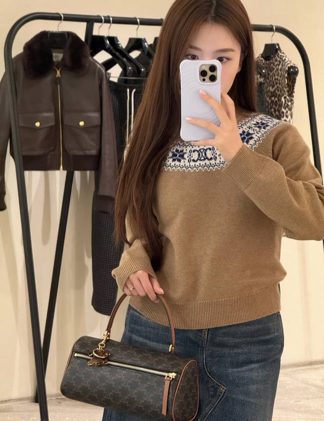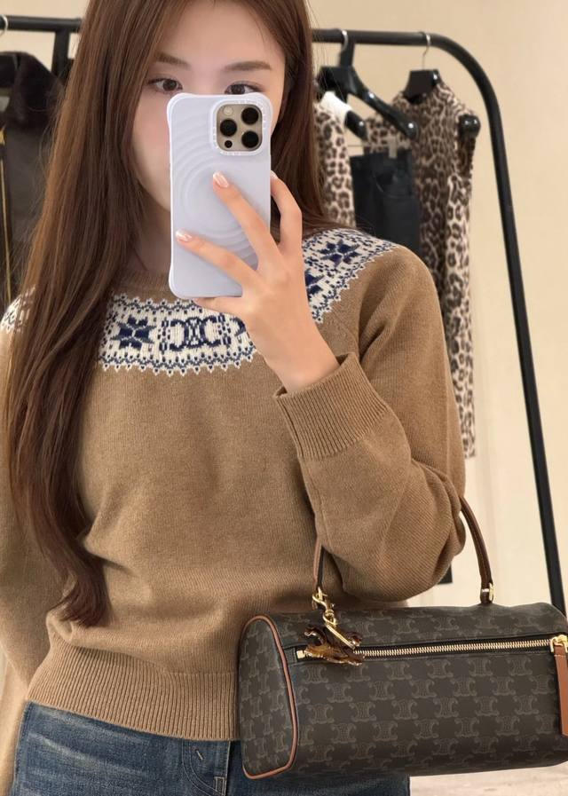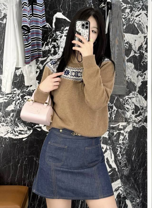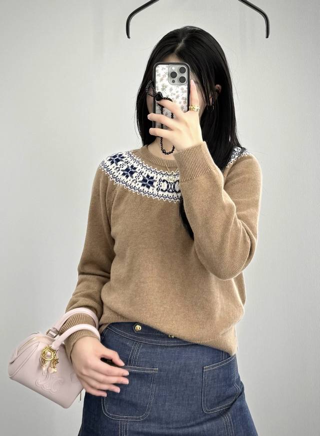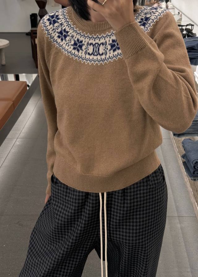 Ce 25 New Early Fall Crochet Pullover Sweater. The collar and cuffs have ribbed hems that match the hem. The neckline is embellished with a Fair Isle Nordic-style crochet pattern, creating a youthful, artistic vibe. The Arc de Triomphe jacquard logo is centered, highlighting the brand's signature style. Cashmere knit fabric provides warmth and comfort. A regular fit is a simple, versatile style for every day use in fall and winter. Two colors: Sml