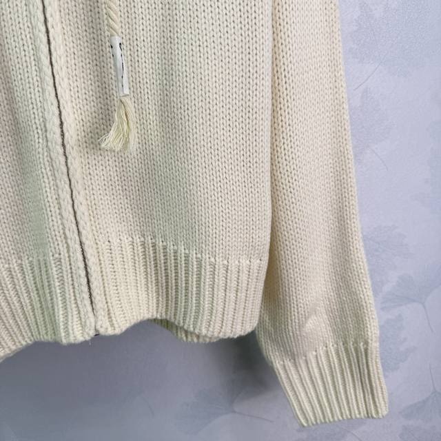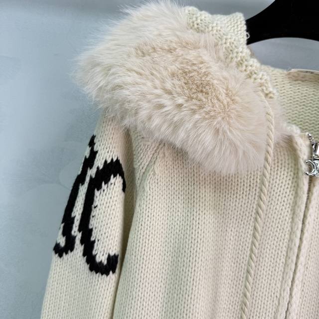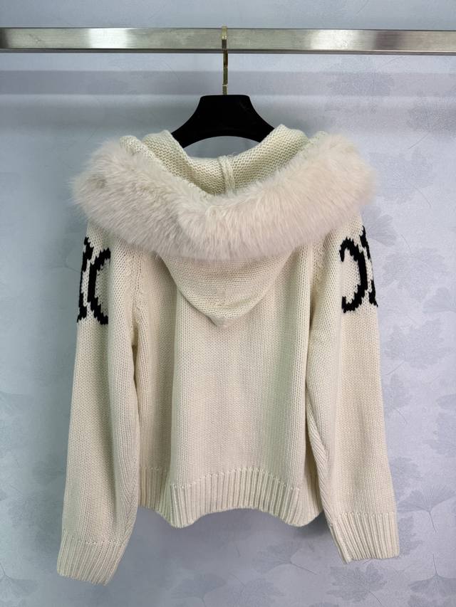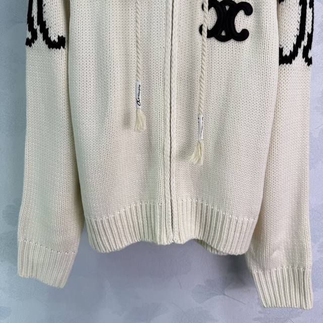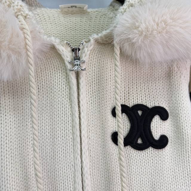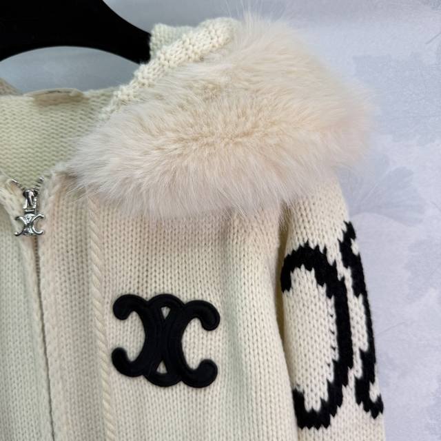 Ce*25 Autumn/Winter New Hooded Knit Cardigan with Arc de Triomphe Logo Design. Features an embroidered fur collar on the chest and sleeves, super cute! Convenient zipper closure. Soft, comfortable fabric. Stylish, versatile, and suits all body types! 1 color, 3 sizes: S, M, L, T226B,