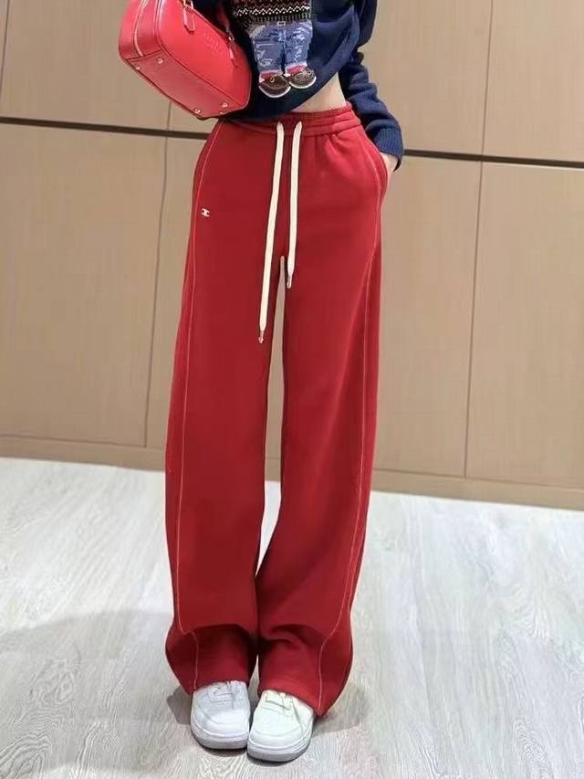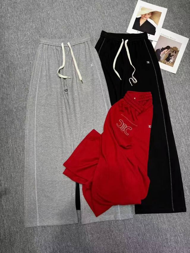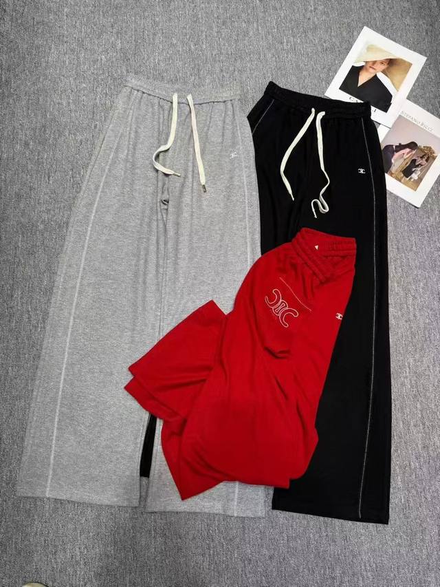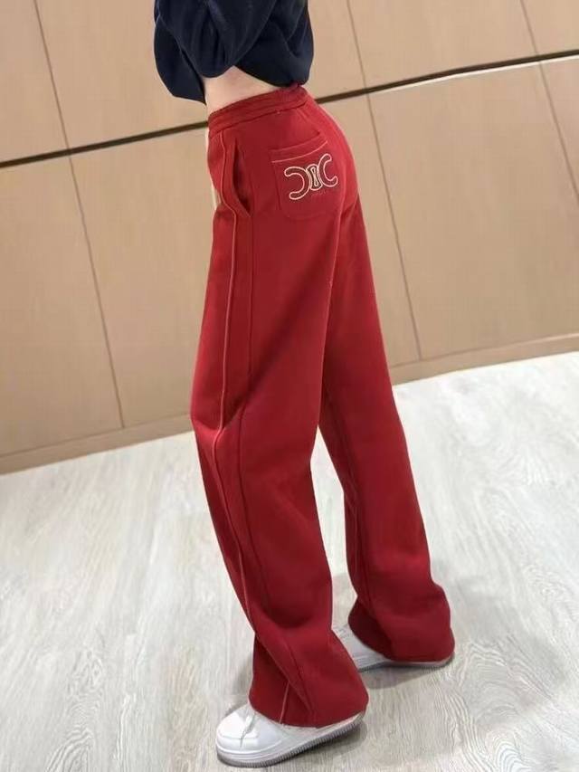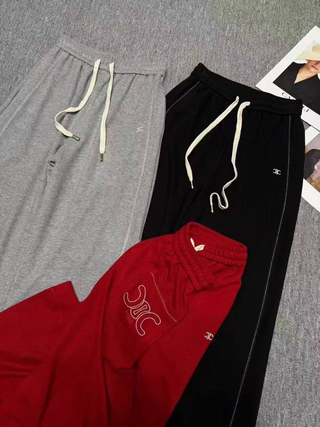 Cel Celine 25Fw latest autumn casual straight-leg pants with embroidered logo and lettering on the back pockets. Elastic waist and drawstring. Casual and versatile fashion trend slim straight-leg pants with exquisite logo embroidery pattern. Available in black, gray and red. Sml xl 4 size