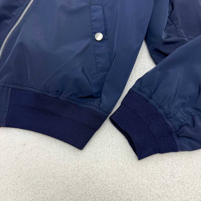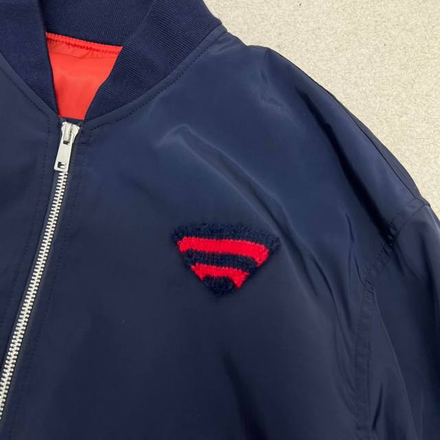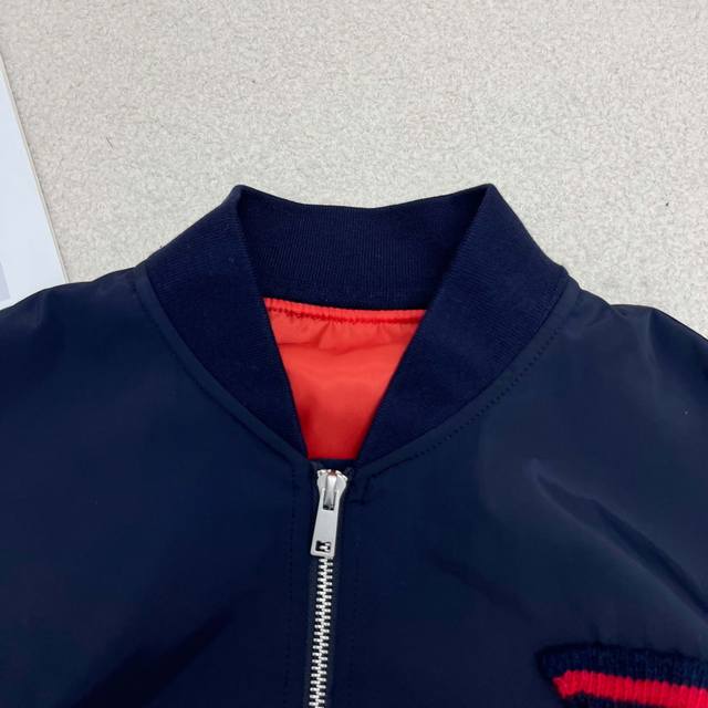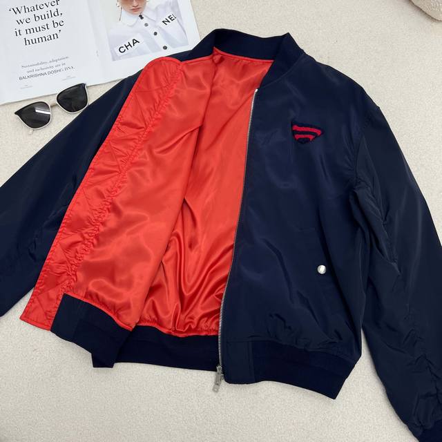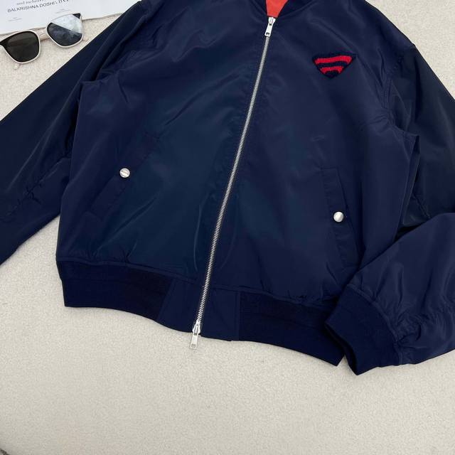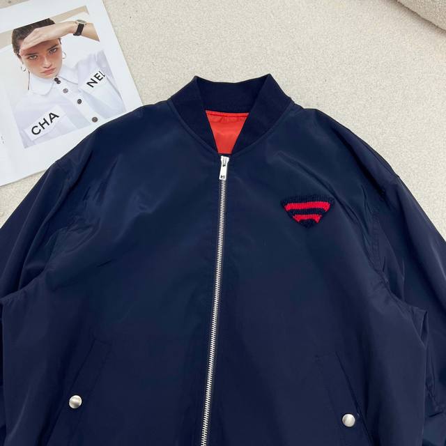 Celebrity-style Pd 25 knit baseball jacket with triangle logo decoration. This super cool navy blue jacket has a stylish feel and is very practical. A must-have item for all seasons. Loose Bf fit, custom color-blocked ribbed lining, and contrasting color lining make it very fashionable. Highly recommended! Available in three sizes.