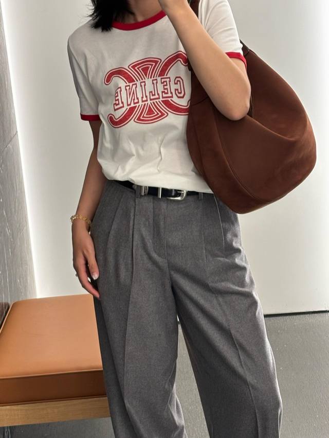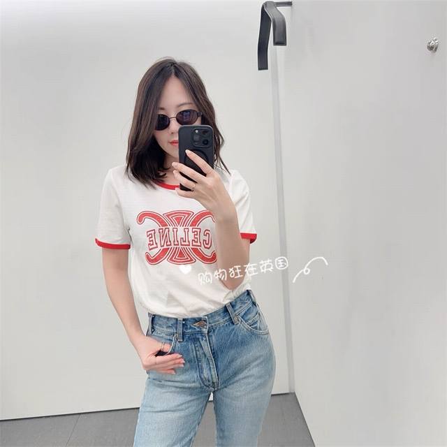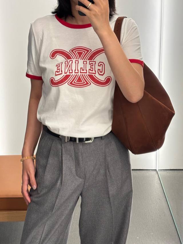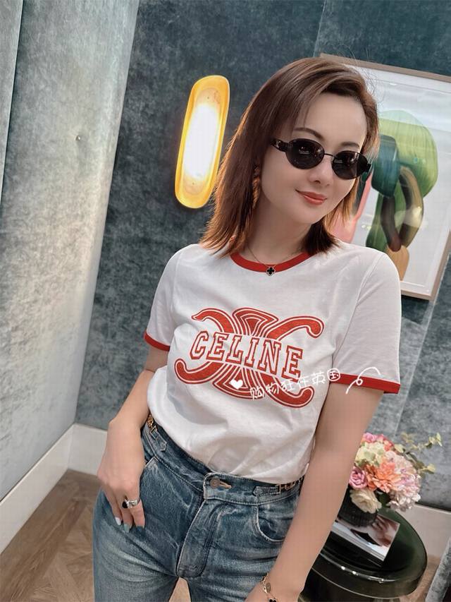 Celin* 25Fw's new early fall logo print and colorblock cotton round neck short-sleeved T-shirt | Exclusive high-edition product! Made from skin-friendly pure cotton fabric, featuring the brand's iconic double C interwoven elements paired with a reverse letter logo print, this clever fusion of luxury genes and American retro preppy style creates a strong visual impact and high recognition. The short version neatly highlights the waistline, easily creating the golden ratio of "short top and long bottom". Suitable for a variety of bottoms such as high-waisted jeans and skirts, it can be savory or sweet to create a variety of early fall styles. Available now SML