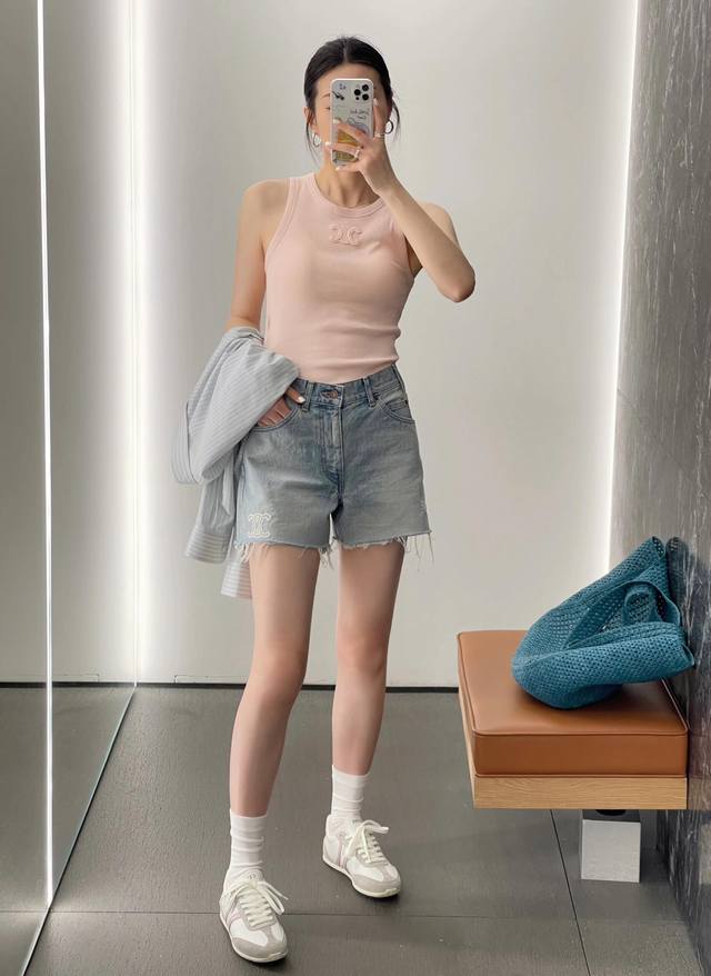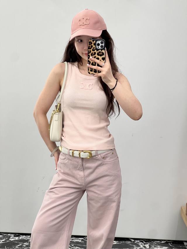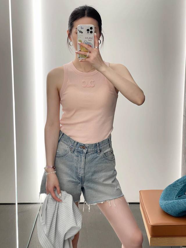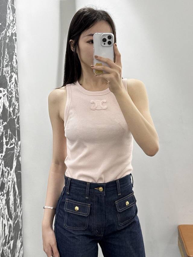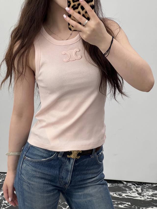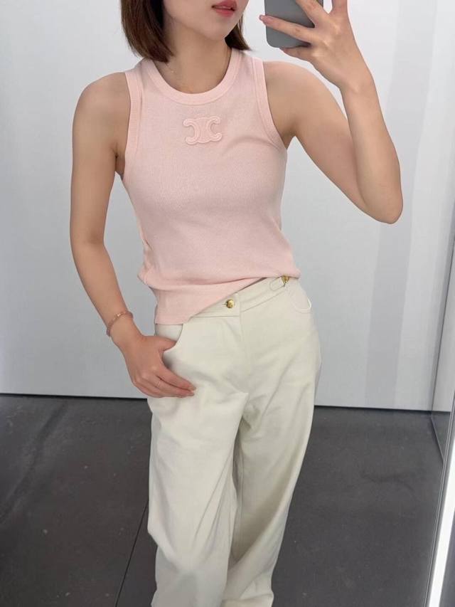 Celin* 25Ss Early Spring New Arc de Triomphe Embroidery Versatile Sweet Girl Pink Vest | Exclusive Yb development! High version production! A treasured and versatile item for the whole summer! Yb customized vertical stripe fabric, the collar and sleeve edges are all made of seamless splicing and one-piece molding technology, the workmanship quality depends on the details! The three-dimensional drum edge and foot-cutting process at the bottom of the hem distinguishes the market version! The waist-hugging version design, three-dimensional cutting, the upper body effect is absolutely amazing! The customized threaded edge is smooth and smooth, the quality depends on the details! Available now SML