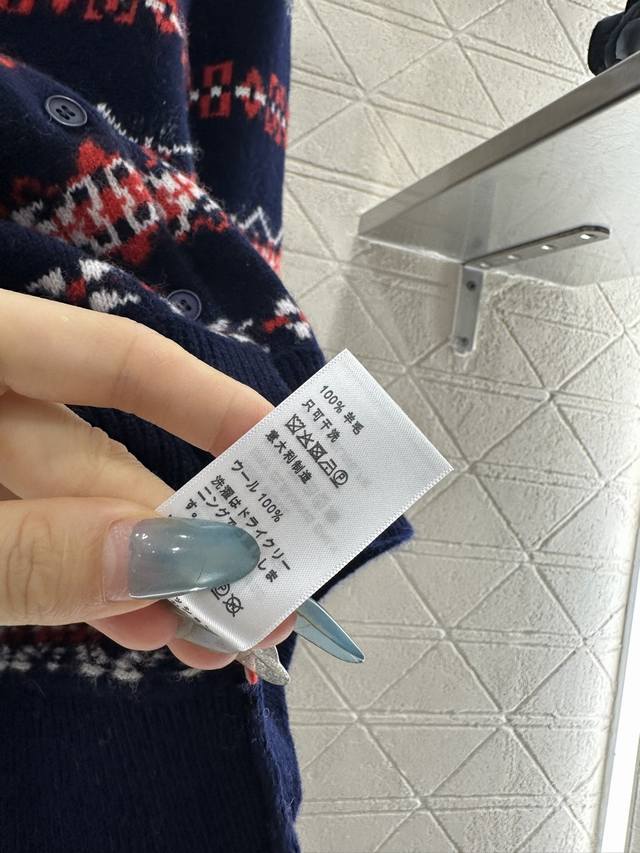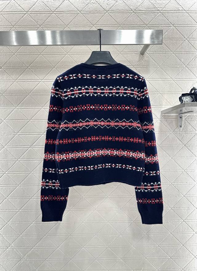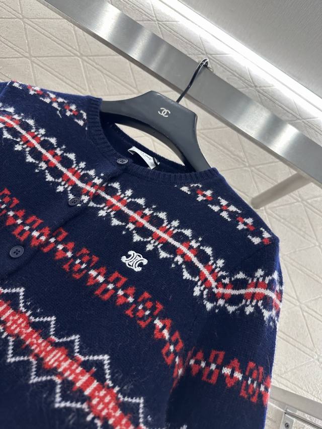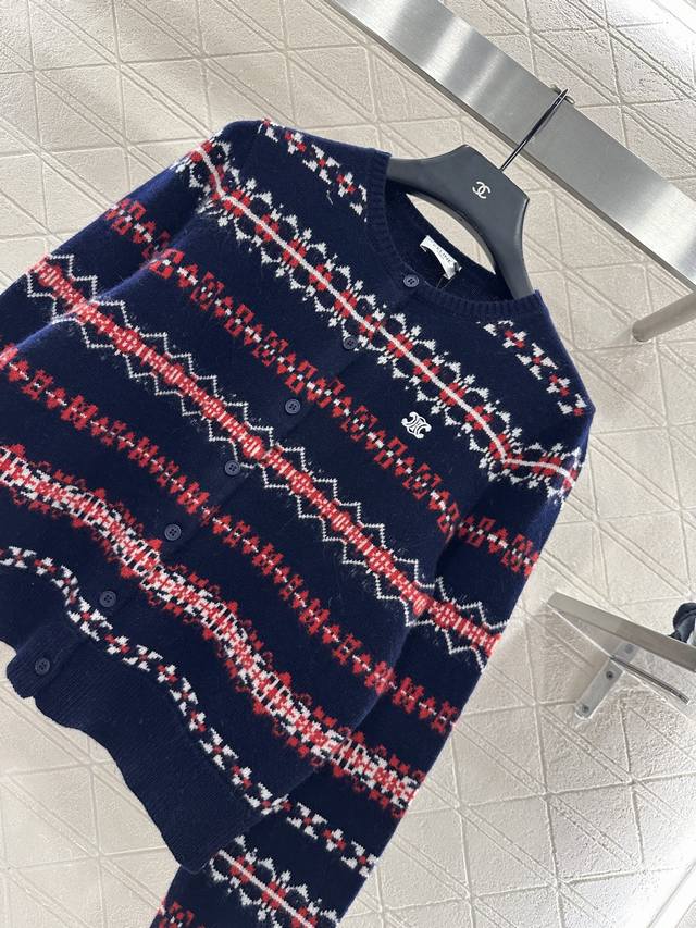 Crew Neck Knit Snowflake Striped Cardigan. Made of custom Yb wool knit material, soft and delicate, comfortable to the touch. Crew neck cut, ribbed edges throughout, elastic wrap for extra warmth. The iconic Arc de Triomphe logo adorns one side of the chest, showcasing the brand's style. The entire cardigan features a non-repeating, irregular geometric pattern arranged horizontally, with contrasting stripes creating a snowflake winter feel, enriching the visual effect and adding an artistic touch. It exudes a simple yet sophisticated and stylish look. Custom fabric and accessories, look for the high-quality version, 2 colors available.