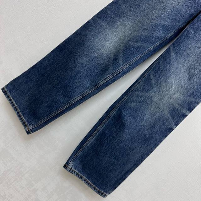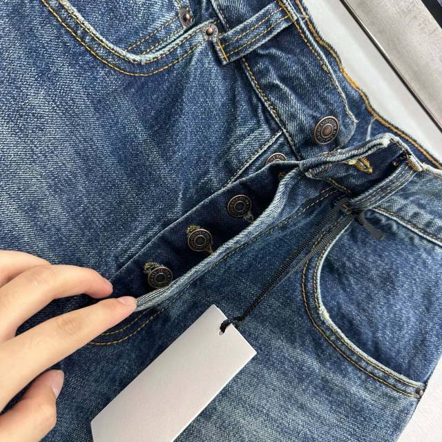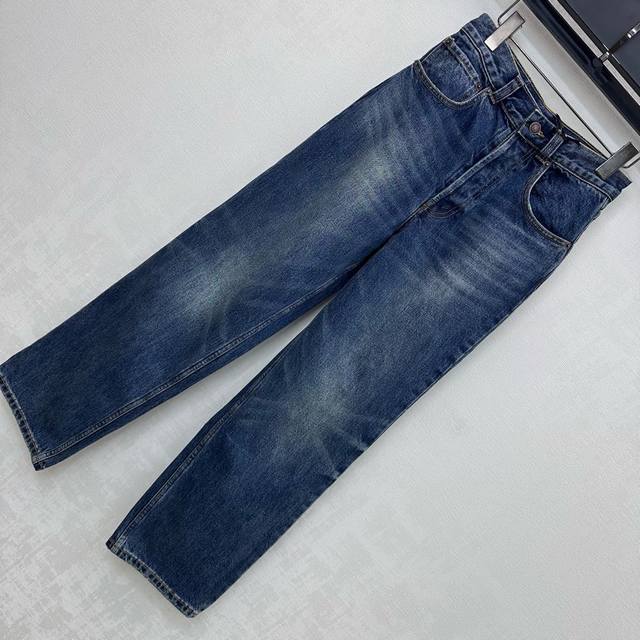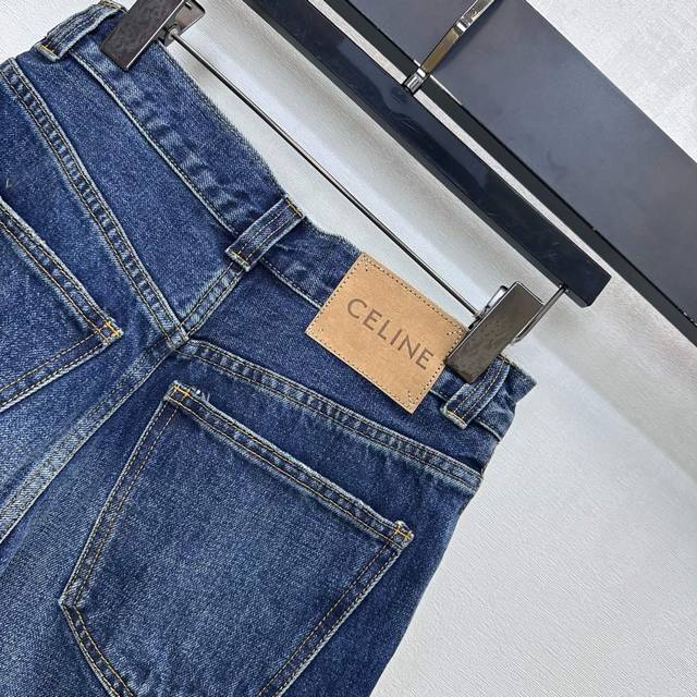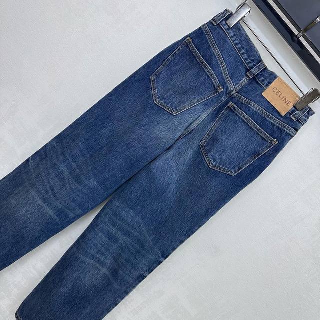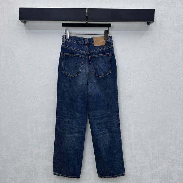 Celin*2025 New Arrival: High-Waisted Straight-Leg Jeans, Custom Made with Imported Twill Cotton Denim, Crisp, Comfortable, and Stylish. Enzyme Wash Retro Dark Blue Distressed and Whitened Process Adds a Layered Look. The Back Waist is Adorned with a Signature Letter Leather Tag, Showcasing the Brand's Style. New Fabric and Accessories. Button-Up Straight-Leg Jeans. Easy-to-Pair Tops. Relaxed and Stylish. High-Version.