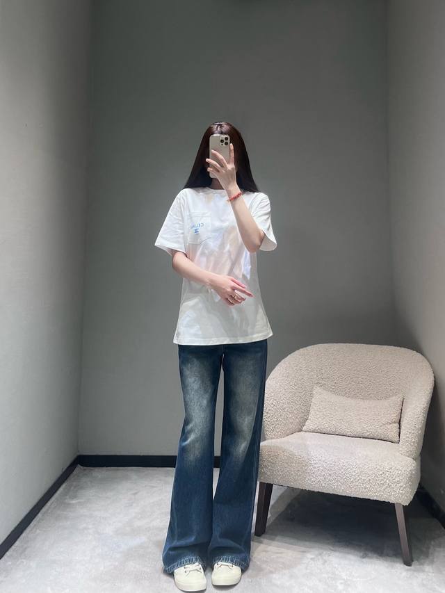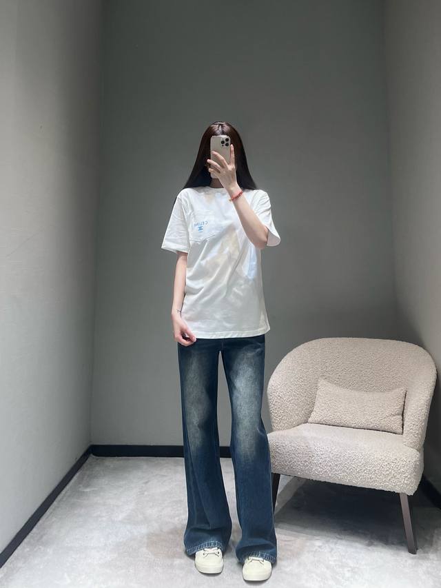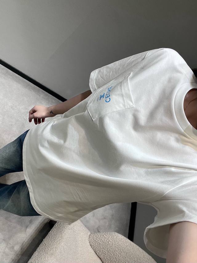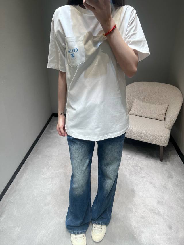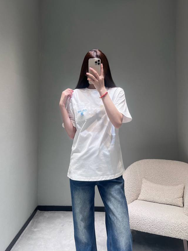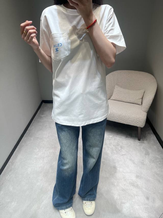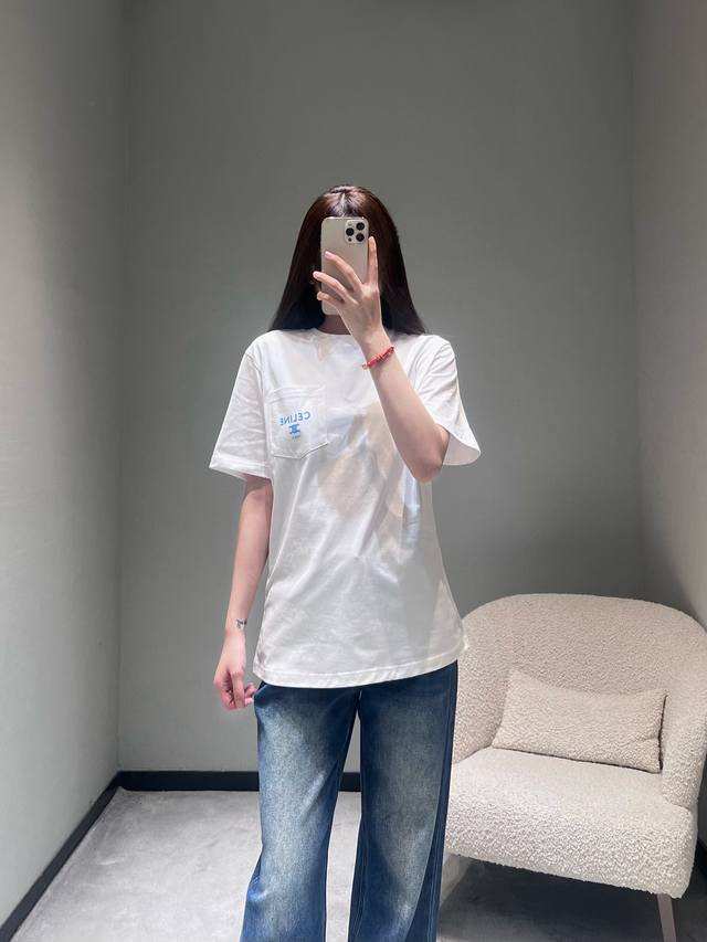 Celin*2025Fw Autumn/Winter New Arrival Short-Sleeve T-Shirt: A relaxed, flattering crew neck design suitable for all body types; the fabric is a crisp yet soft high-quality cotton. The blue lettering and classic logo on the chest pocket add a touch of understated elegance, showcasing quality details. Sml DDD