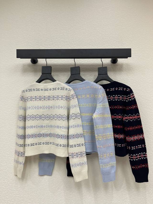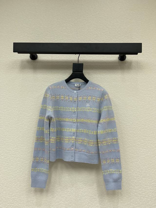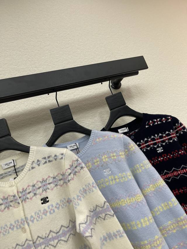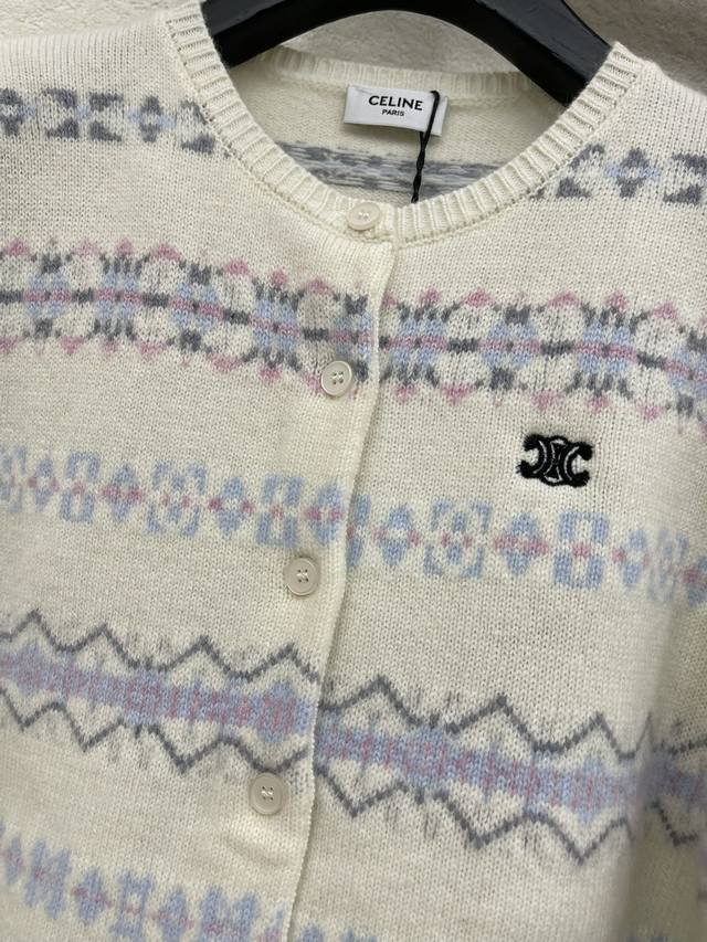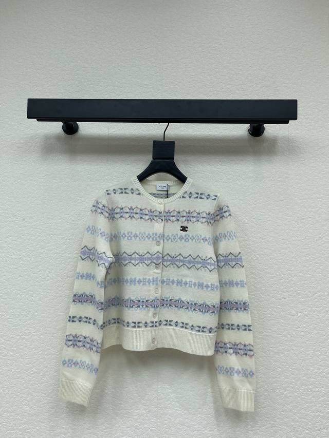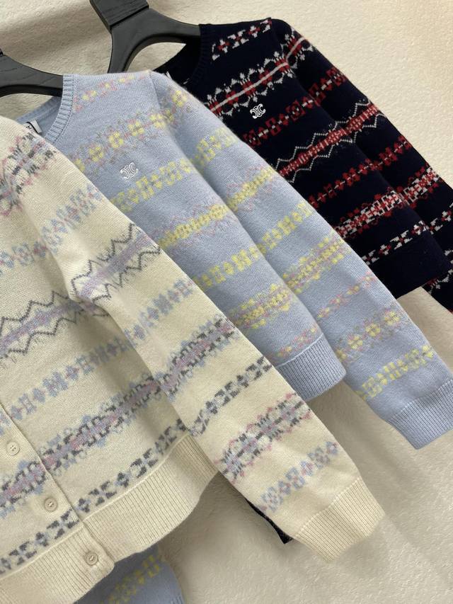 Celin*25 Autumn/Winter New Crew Neck Knit Snowflake Striped Cardigan. Made of custom Yb wool knit material, soft and delicate, with a comfortable feel. The crew neck cardigan features an all-over ribbed trim and an elasticated wrap for added warmth. The Arc de Triomphe logo adorns one side of the chest, showcasing the brand's style. The entire cardigan features a horizontally arranged, non-repeating geometric pattern with contrasting stripes creating a snowflake-like winter feel, enriching the visual effect and adding an artistic touch. It exudes a simple yet sophisticated and chic look. Sml Aa. DDD