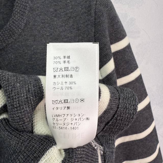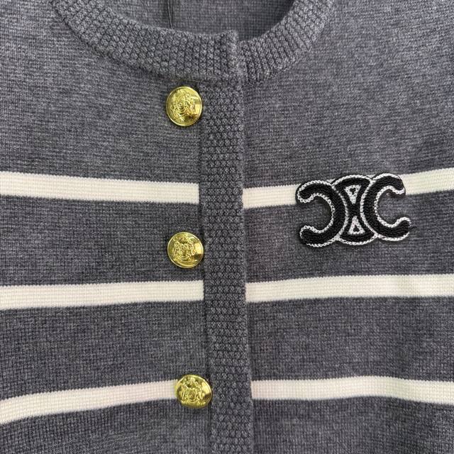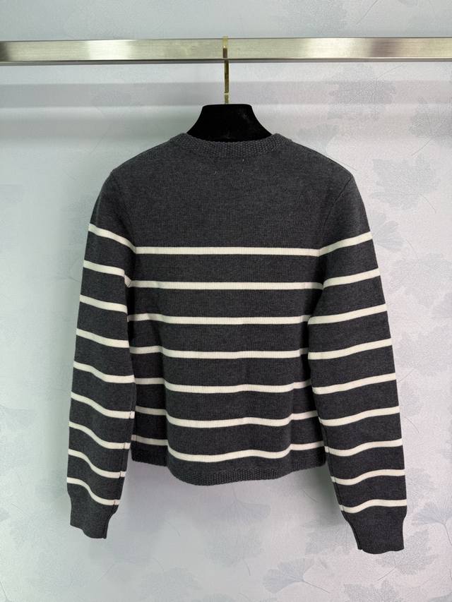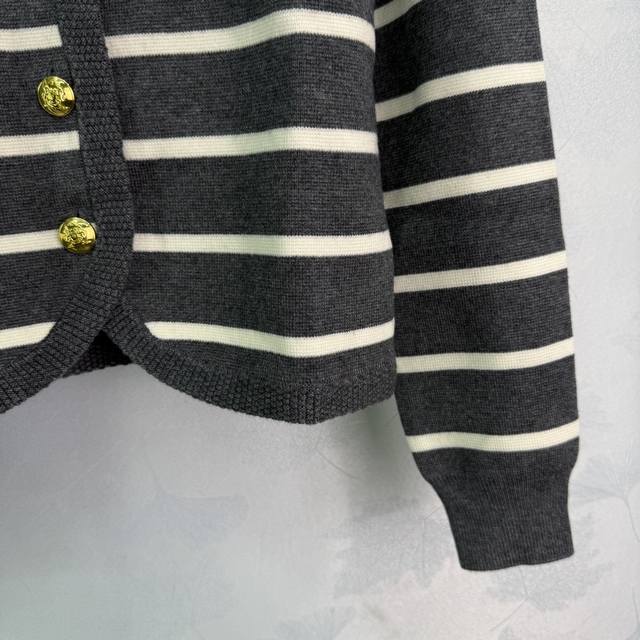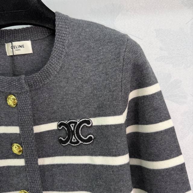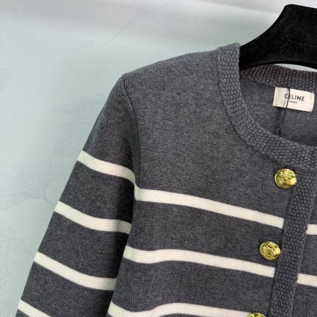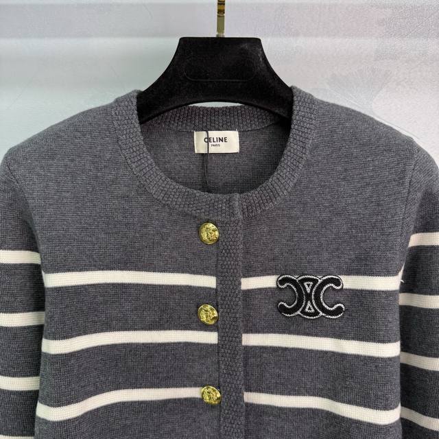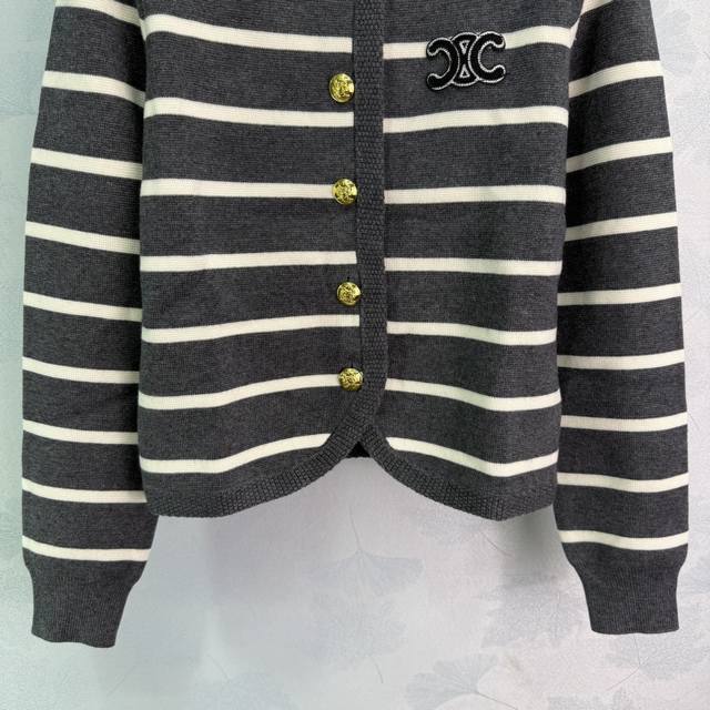 Celin*'s latest 2025 Early Fall collection! A round-neck, striped, knitted long-sleeved cardigan! Custom-made wool knit for a comfortable, delicate texture. The round-neck, long-sleeved cardigan features a collared collar that extends to the hem, with ribbed trims for a flawless finish. The Arc de Triomphe logo adorns the chest, complemented by a single row of gold buttons. The contrasting stripes create a stylish, regular fit. A versatile, slimming style for fall and winter! One color, three sizes. Sml T226B.