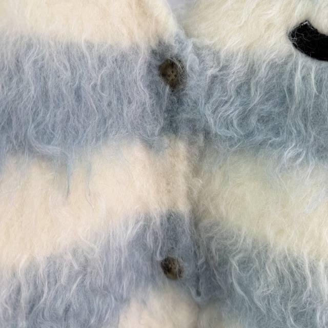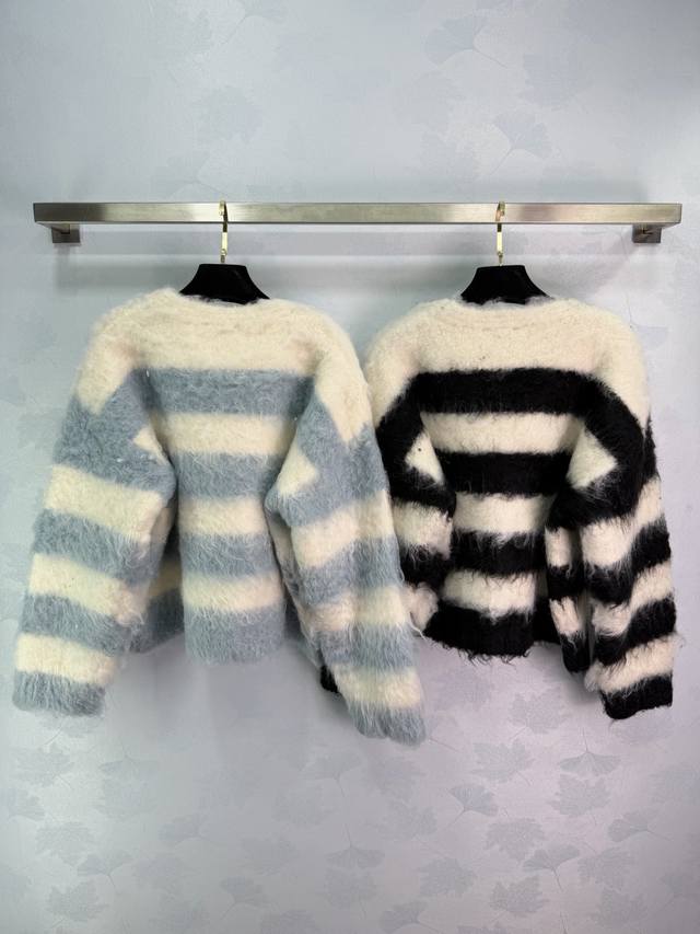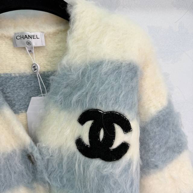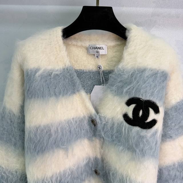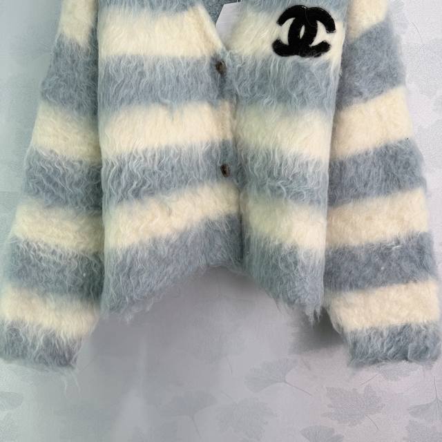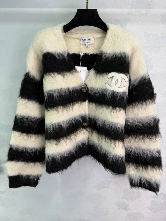 Ch* 2025 Early Autumn New Mohair V-Neck Color-Blocked Striped Long-Sleeve Cardigan! Custom-made wool mohair yarn, V-neck knit cardigan with contrasting colors throughout, featuring a double C logo on the chest to highlight the brand's style. Great for wearing alone or layering, suitable for commuting, dates, and many other occasions! 2 colors, 3 sizes: S, M, L, T226B. DDD