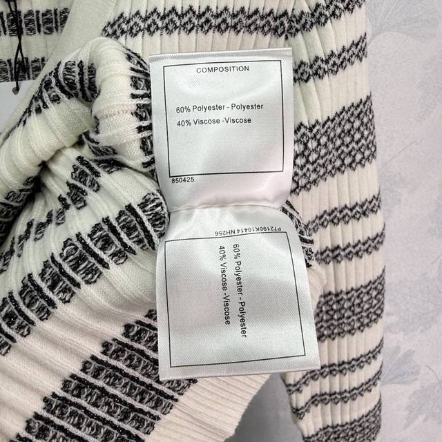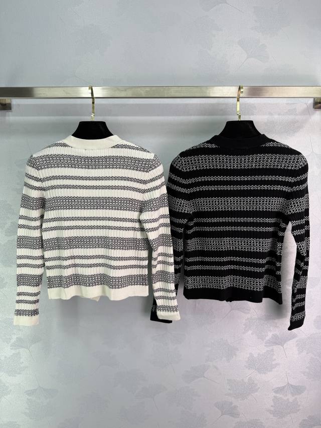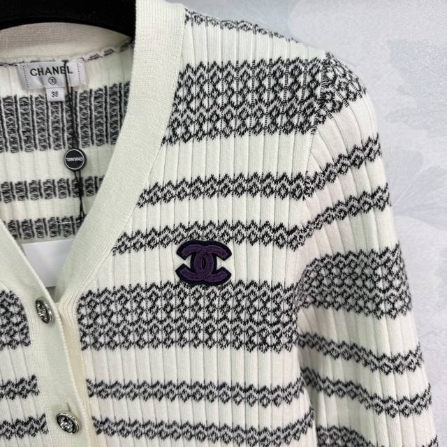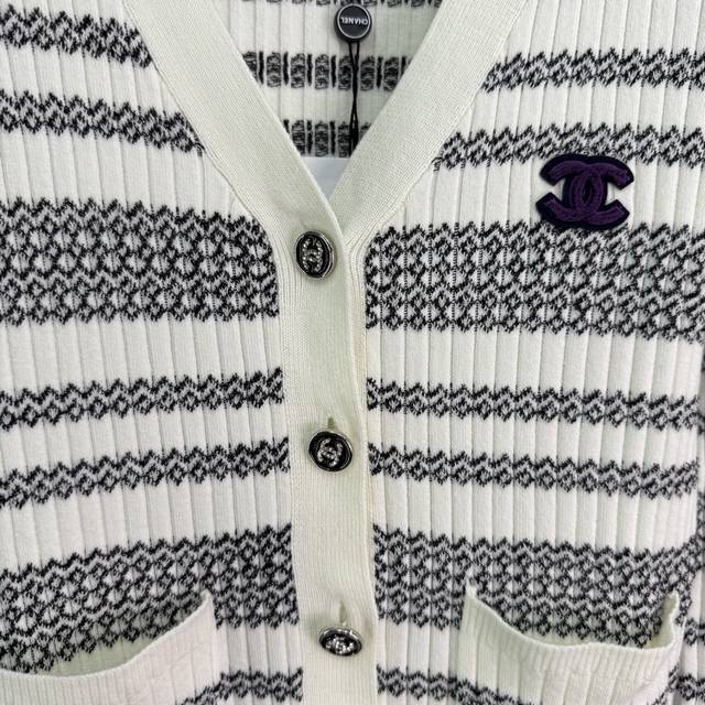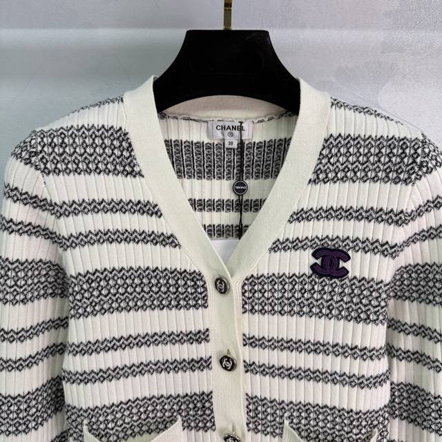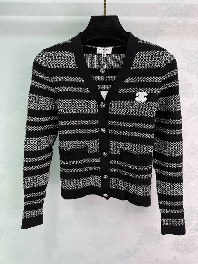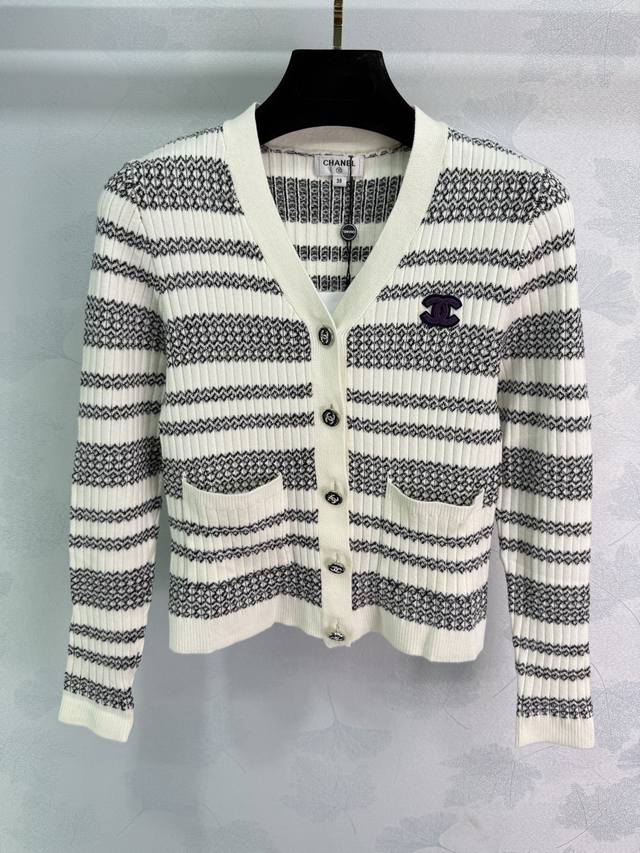 Ch*2025 Early Autumn New V-Neck Striped Knit Cardigan. Custom wool knit material, soft and delicate texture, comfortable feel. V-neck knit cardigan, windproof and warm. Double C logo decoration on the chest showcases brand style. All-over striped color-blocking design enriches the visual effect and adds an artistic touch. Vertical ribbed stretch fabric fits the body shape, showing a simple, high-end, fashionable and stylish look! 2 colors, 3 sizes: S, M, L, D, D