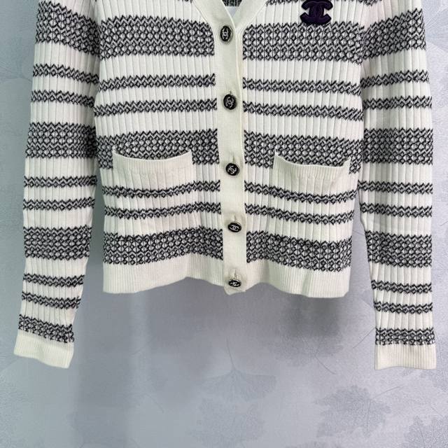 Ch*2025 Early Autumn New V-Neck Striped Knit Cardigan. Custom wool knit material