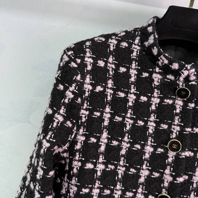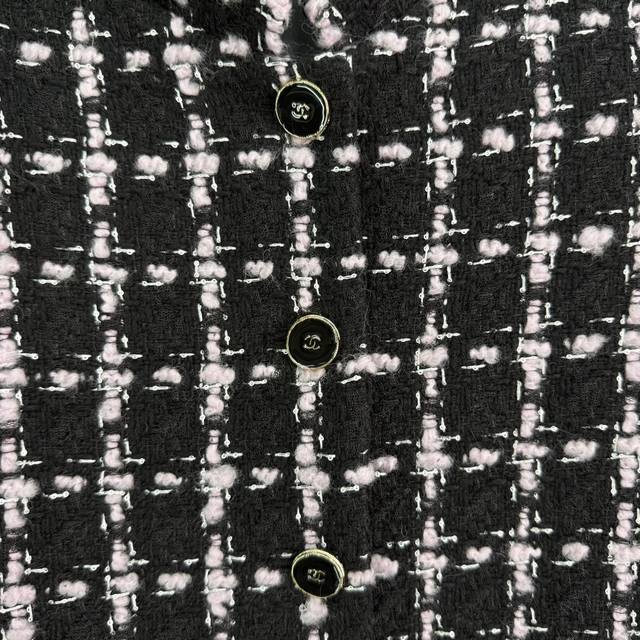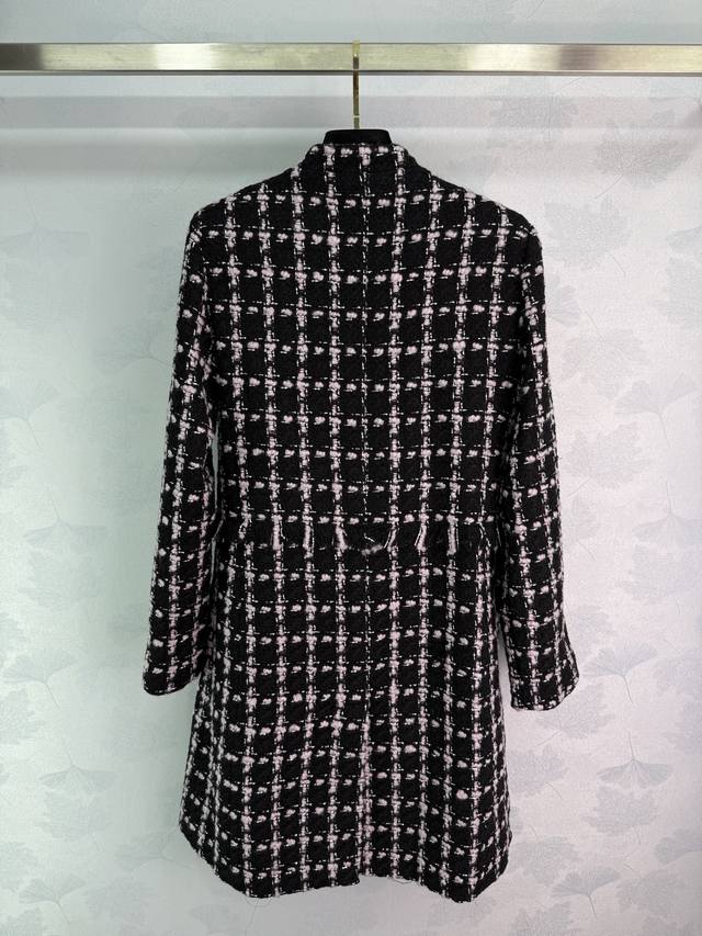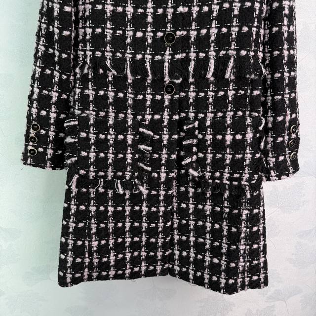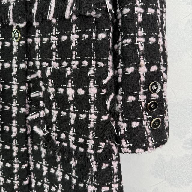 Ch*2025 Early Fall New Braided Dress with a Long Hem. Custom-made YB imported wool tweed with a pronounced texture visible to the naked eye. The premium, coarse, striped tweed fabric embodies a sophisticated, ladylike style. The midi-length design can be worn as a coat or dress. The front features a single row of printed buttons, intricately woven in pink and black. The hem features a luxurious yet elegant slit. Fur fringe trims at the waist and pockets create an elegant, rich, layered design. A stylish and sophisticated choice! One color, three sizes. Sml T226B.