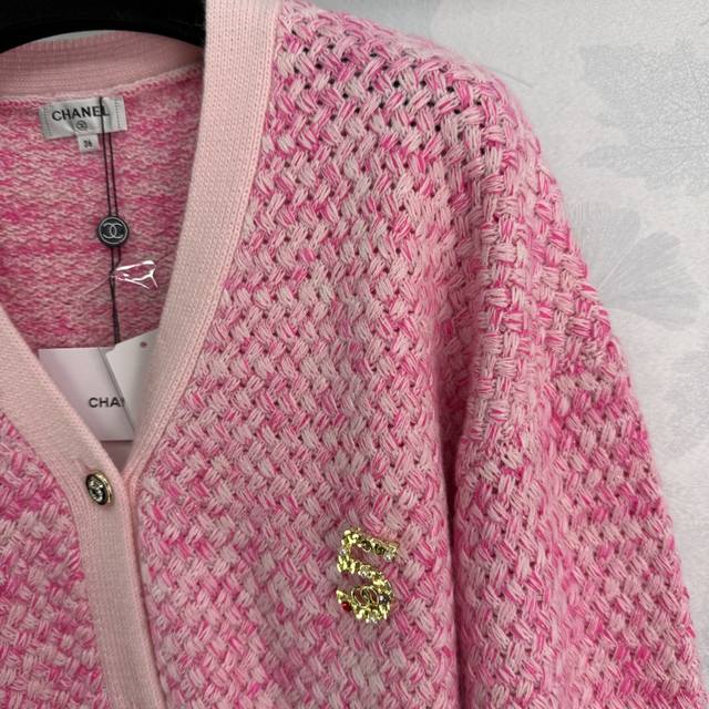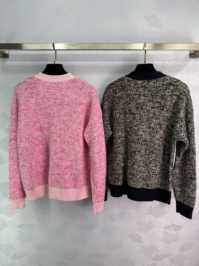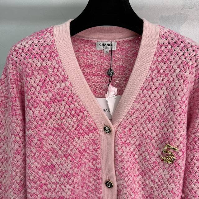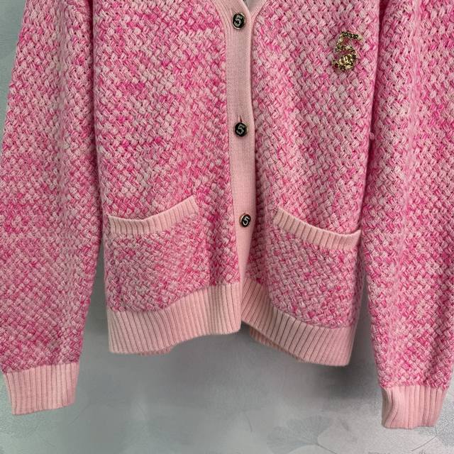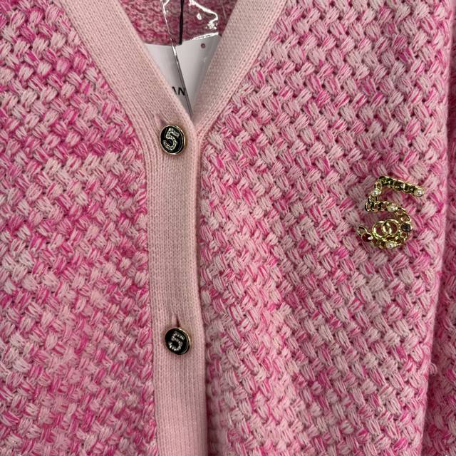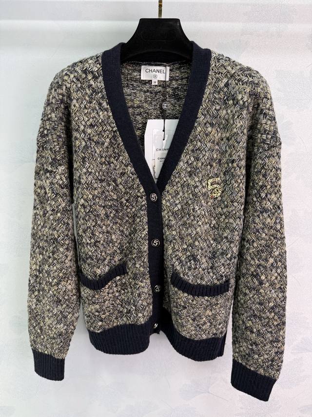 Ch*2025 Early Fall new contrast-colored knitted V-neck cardigan. Made with a custom imported, specially blended yarn, several colors of wool are interwoven, using Chanel's classic yarn. Includes a size 5 brooch. This elegant, slimming, and versatile design features a matching contrasting color scheme on the collar, cuff, and hem. The densely woven hem creates a textured, custom-made "5" diamond-encrusted metal buckle for a truly captivating look. 2 colors, 3 sizes. Sml T226B