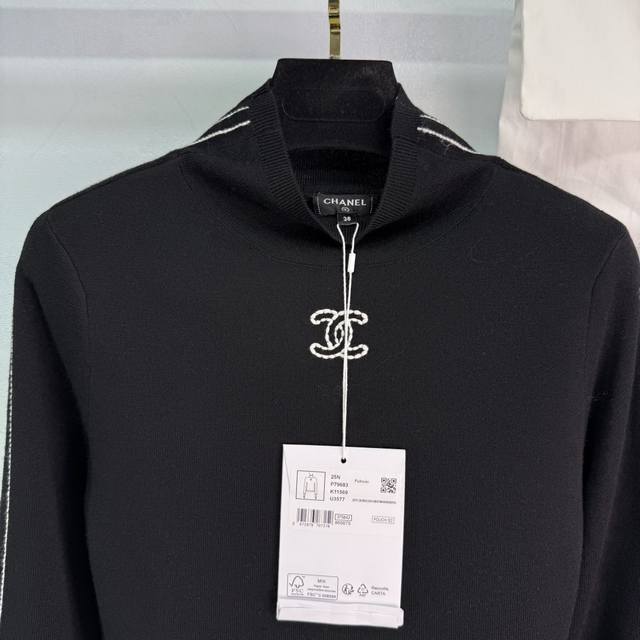 Ch*2025 New High-Neck Knitted Pullover Sweater, 25Coco Ski Series# Woven with custom Yb wool yarn, delicate texture, comfortable to wear. The high-neck pullover sweater design features elastic ribbed trim that narrows the neckline. The collar, shoulders, and cuffs are separated by different colored dividing lines, creating a color-blocked effect. A double C letter decoration is added to the chest. The overall style is sophisticated yet casual, creating a fashionable look. It's warm and comfortable as an inner layer and stylish as an outer layer. Comes with a delicate drawstring dust bag. 2 colors, 3 sizes: S, M, L, T226B, DDD