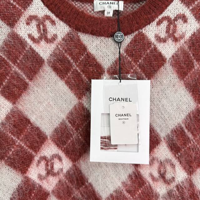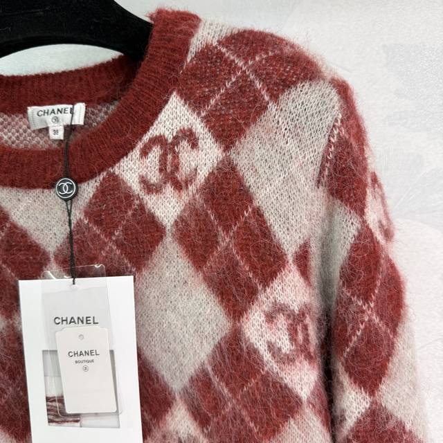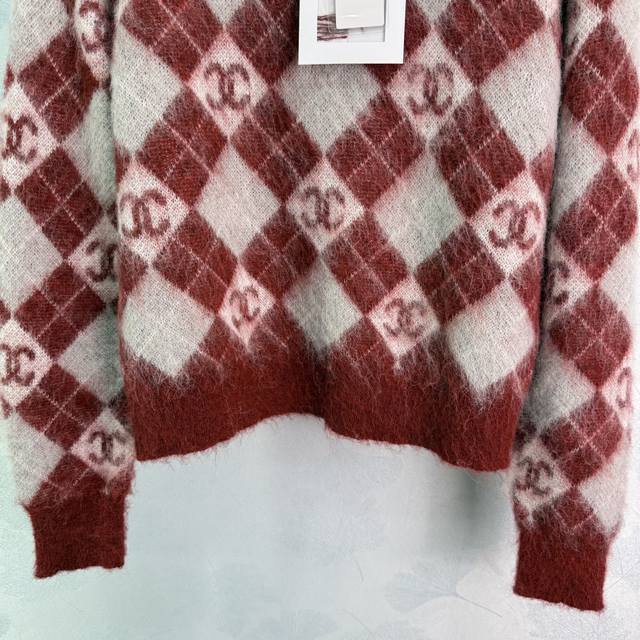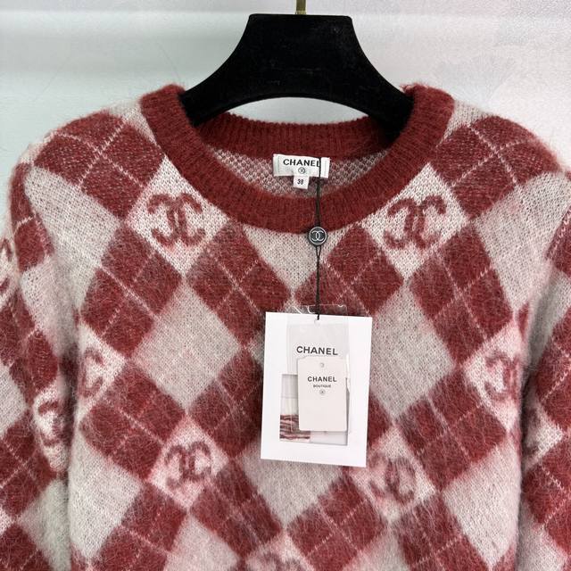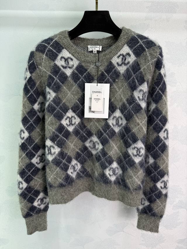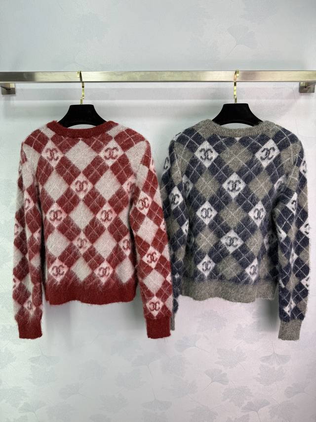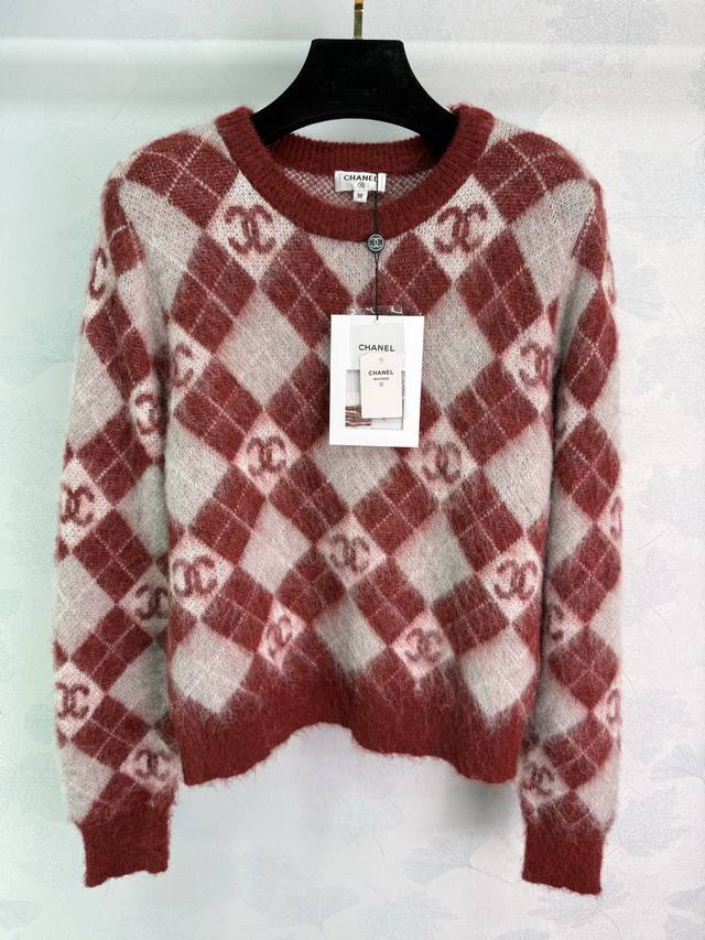 Ch*25 Autumn/Winter New Checkered Sweater, made of mohair and wool, soft and comfortable to the touch. The checkered pattern and double C logo highlight the brand's style. A must-have item for autumn and winter! 2 colors, 3 sizes: S, M, L, DDD