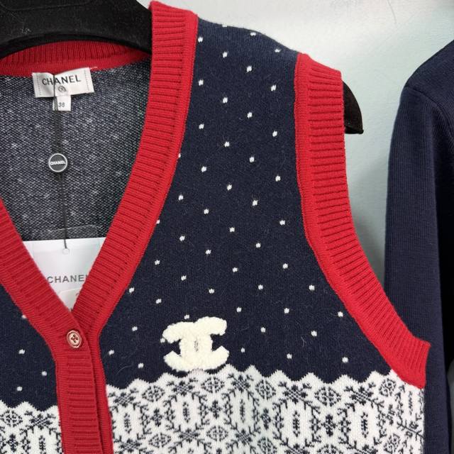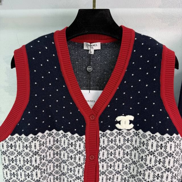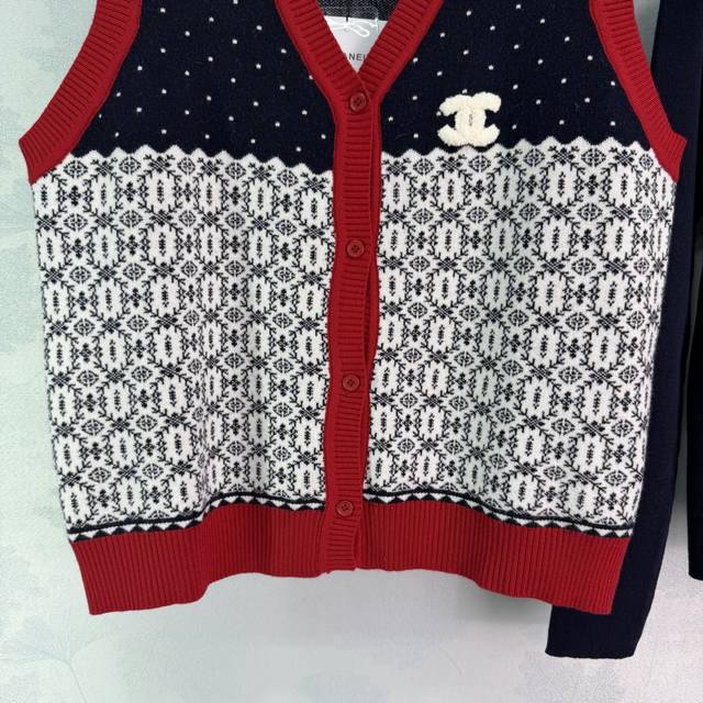 Ch*25 Autumn/Winter New Knitted Vest Set: Vest + Turtleneck Base Layer. Features a red, white, and blue color-blocked design with geometric and polka dot patterns. The double C logo on the chest is highly recognizable. The turtleneck base layer is dark blue, made of soft knit, simple and versatile, easily suitable for everyday wear, commuting, or casual occasions. Comfortable and stylish. 1 color, 3 sizes: Smlt226B DDD