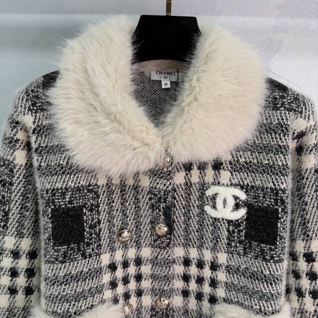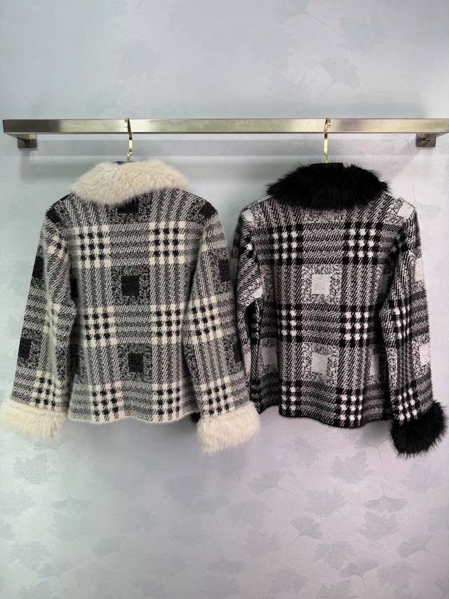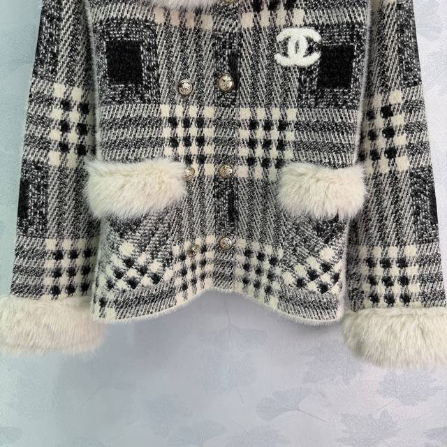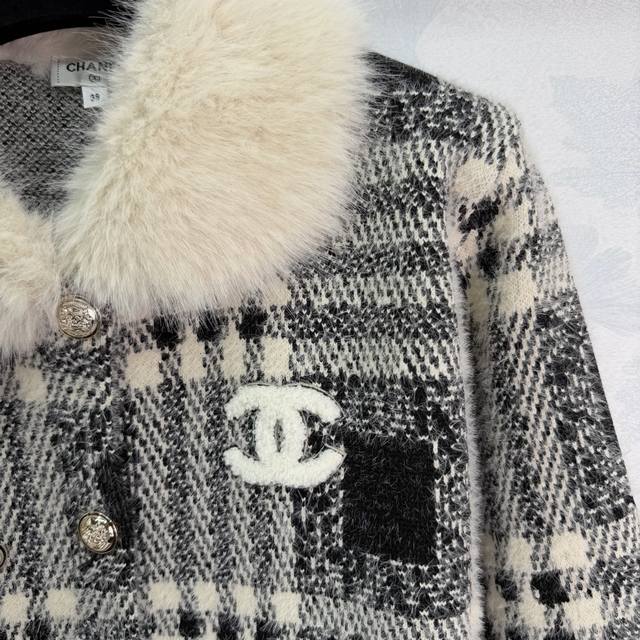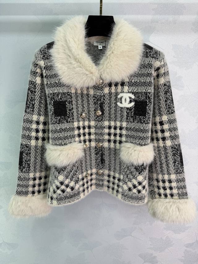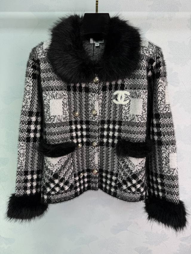 Ch*25 Autumn/Winter New Retro Style Coat, Black and White Checkered Pattern + Fur Collar Design, Elegant and Warm, 2 Colors, 3 Sizes Sml T226B DDD
