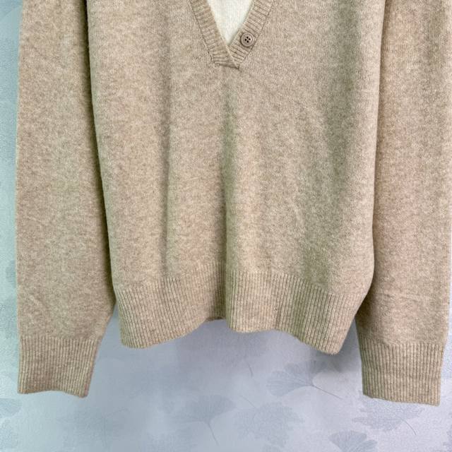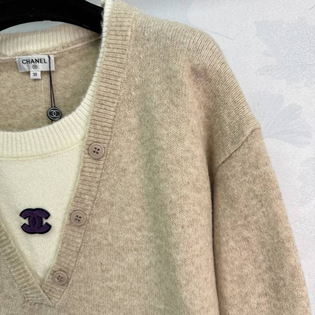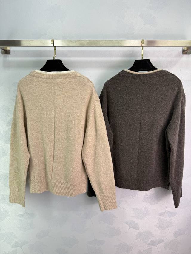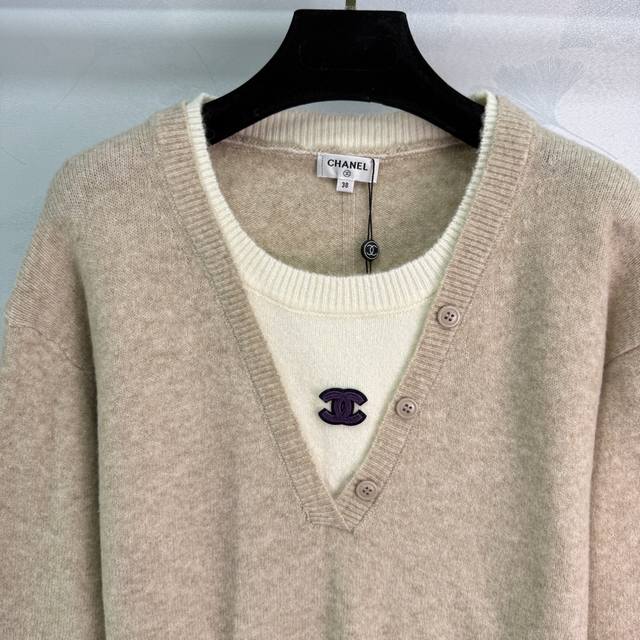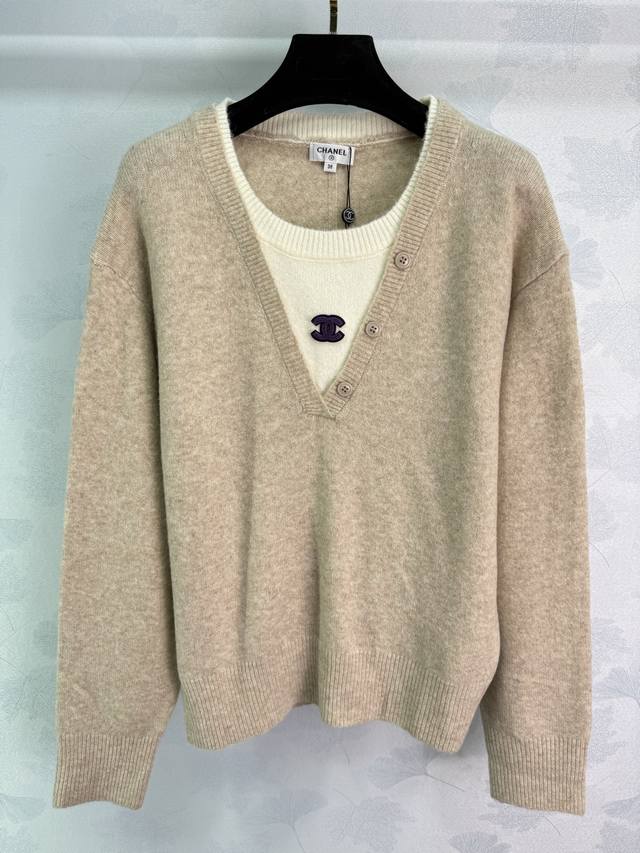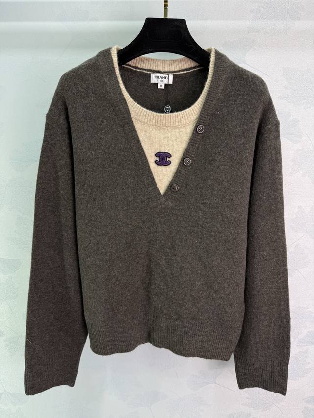 Ch*25 Autumn/Winter New Round Neck Faux Two-Piece Knit Sweater, White Inner Layer Design, Small Embroidered Logo on Chest, Loose Fit, Slimming, Soft and Comfortable Fabric, Exquisite Workmanship, Autumn/Winter Everyday Simple and Versatile Style! 2 Colors, 3 Sizes Sml T226B.