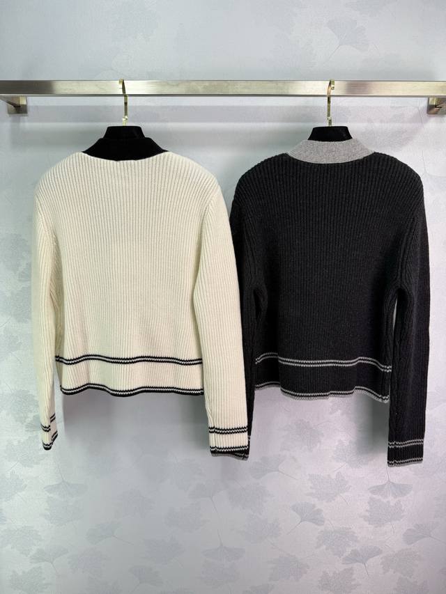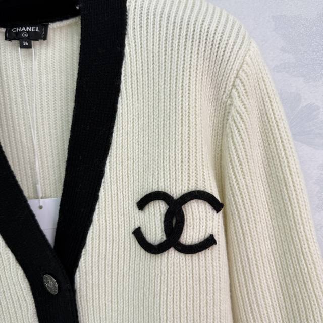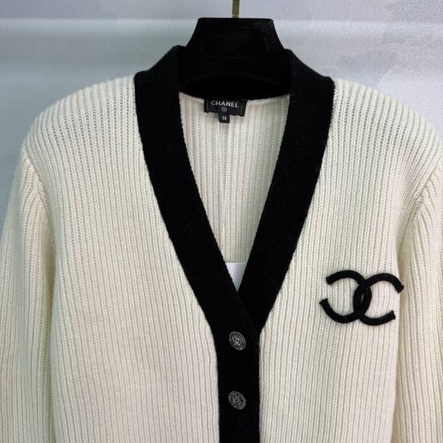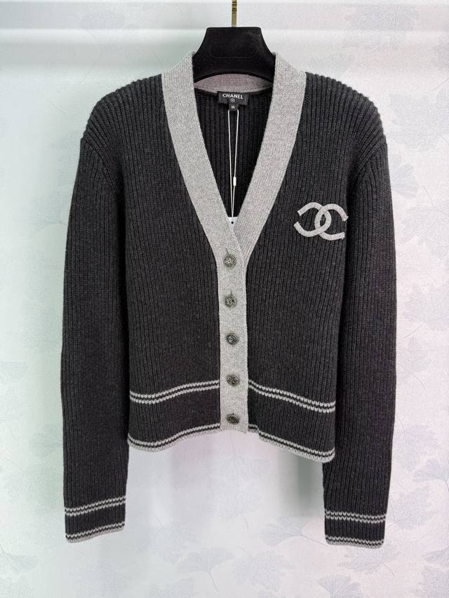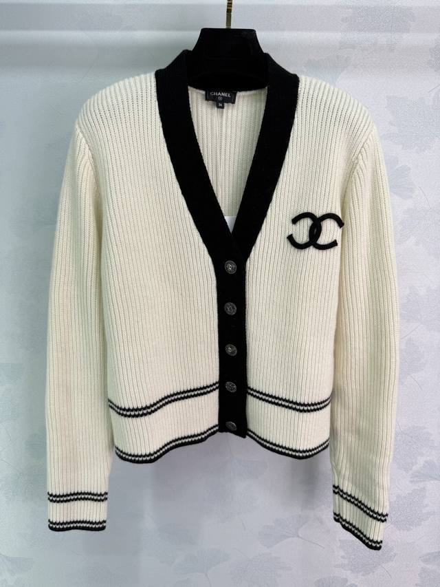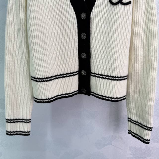 Ch*25 New early fall colorblock knitted cardigan. V-neck design for a slimming and stylish look. Classic double C logo accented with silver round buckles. Contrasting colors create a luxurious feel. The knitted fabric is soft and comfortable, with a sharp, three-dimensional texture. Perfect for fall and winter, this versatile and stylish cardigan comes in 2 colors and 3 sizes. Sml T226B.