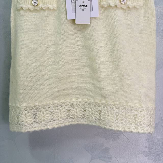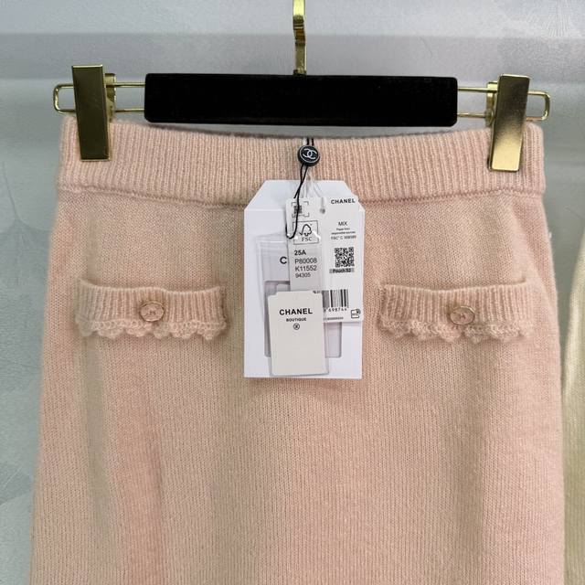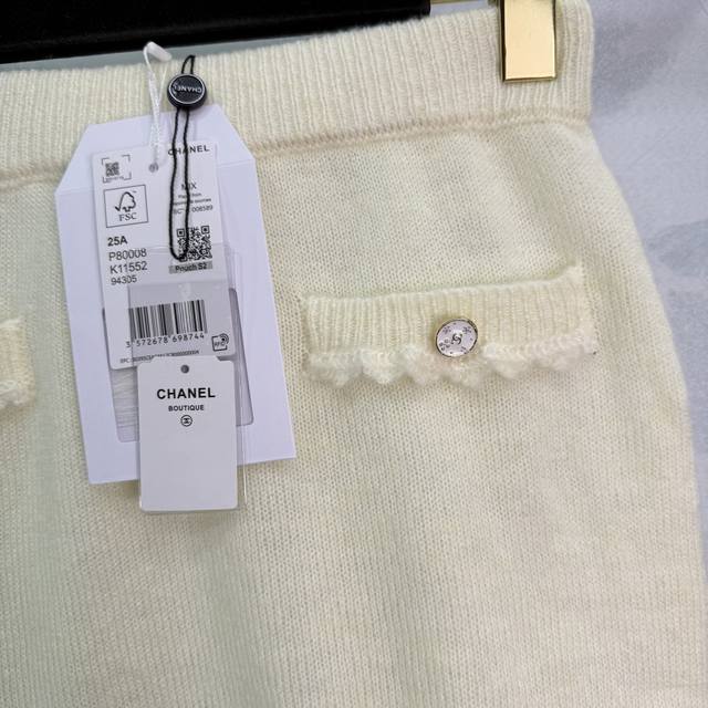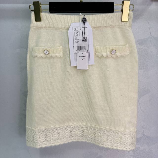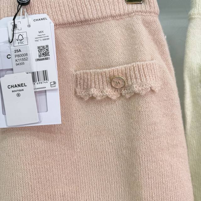 Ch*25 New early fall knitted skirt with lace trims, a fairy-like, Chanel-inspired look. A must-have for every woman, both wealthy and beautiful. Delicate, breathable, and comfortable. Double C-embossed round buttons on the pockets complement the matching cardigan. This elegant and versatile piece is perfect for any occasion! 2 colors, 3 sizes Sml.