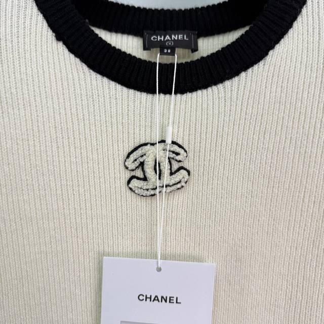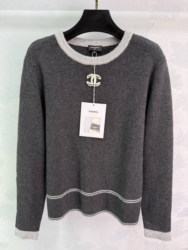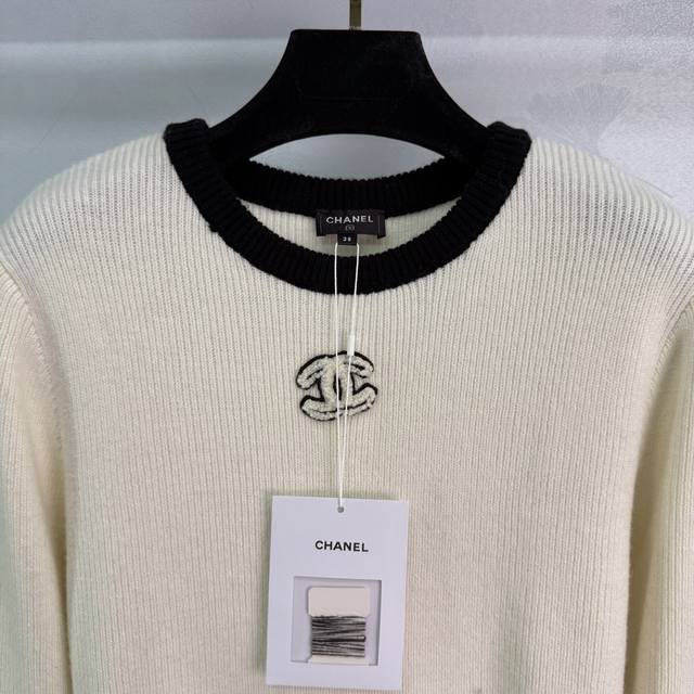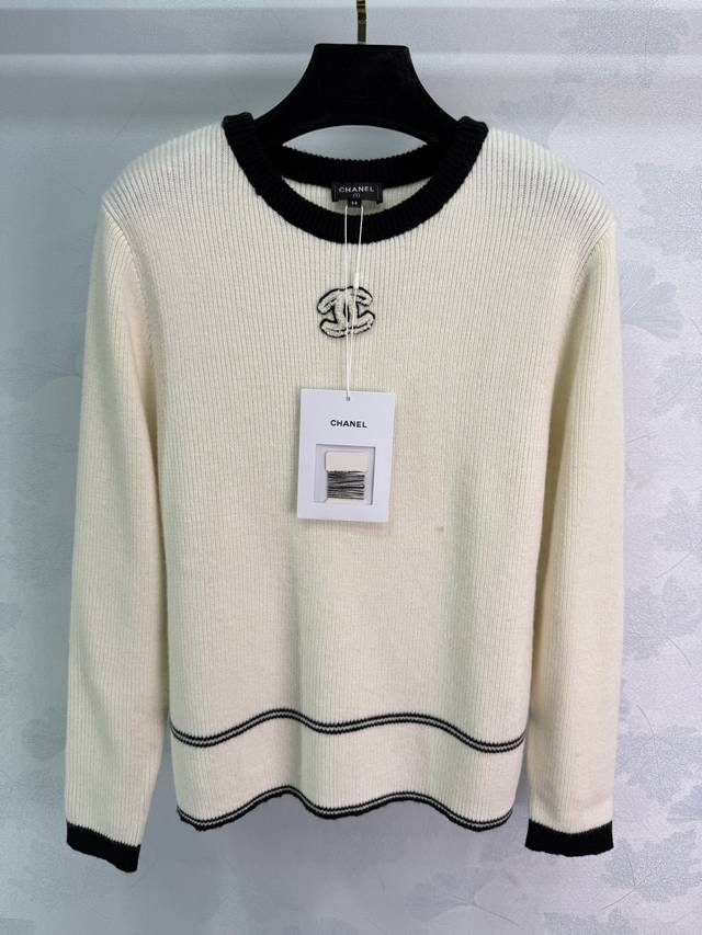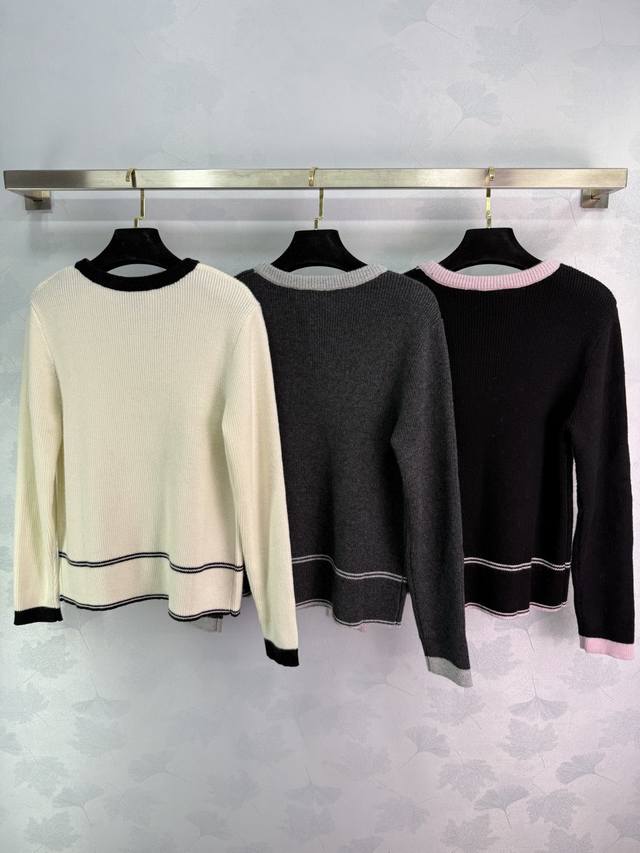 Ch*25 New fall/winter crewneck sweater with contrasting color scheme and double C embroidery. Contrast stripes on the neckline and hem create a simple and elegant look, exuding a touch of luxury and chic. Wear it alone or layered. A top choice for fall/winter fashion! 3 colors, 3 sizes. Sml T226B.