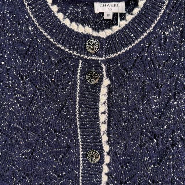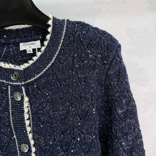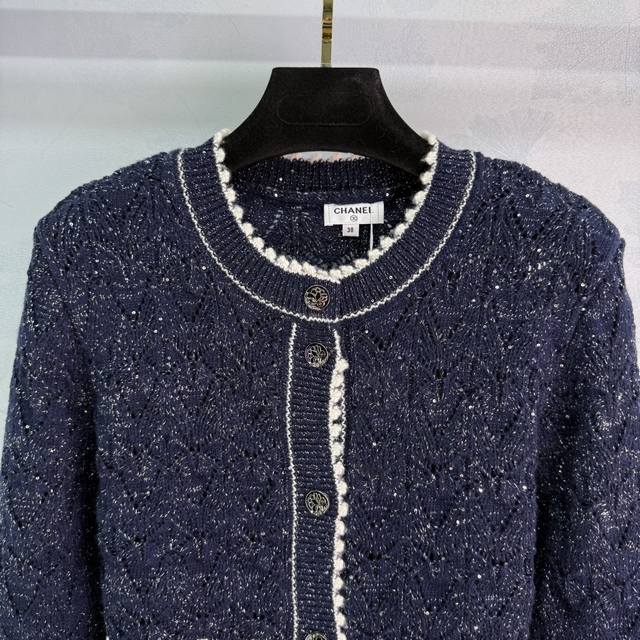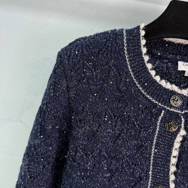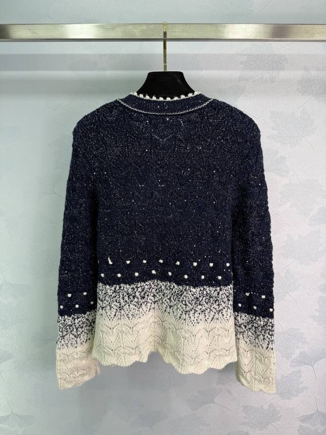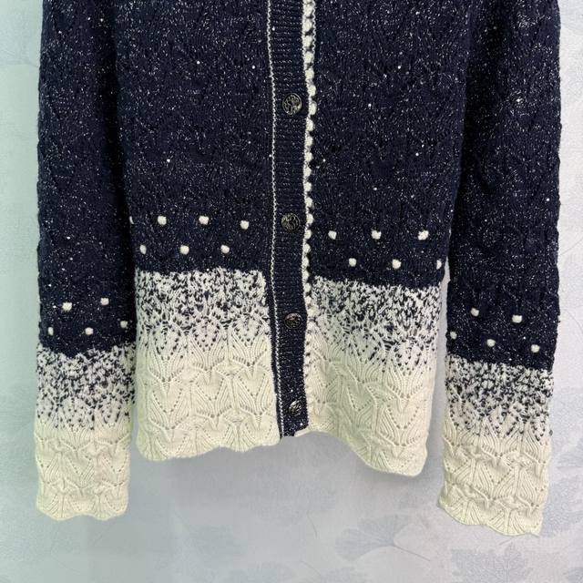 Ch*25 New fall/winter knitted cardigan with a stunning gradient design. Dark blue top with white lace and polka dots. Metal buckle front and textured hem for a luxurious feel! 1 color, 3 sizes. Sml T226B
