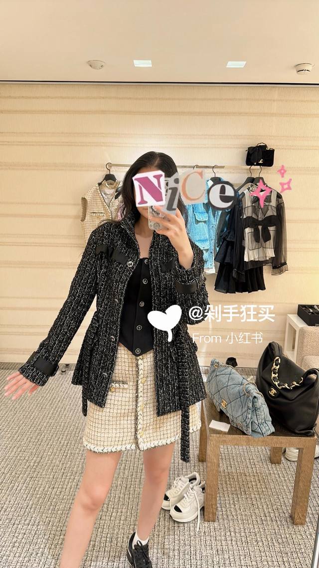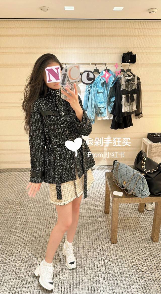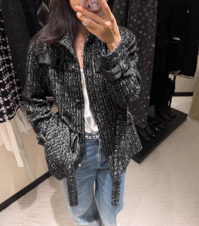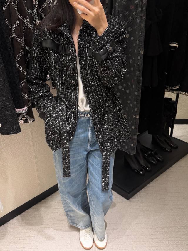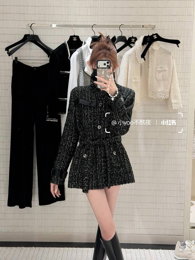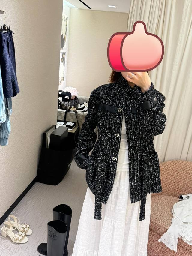 Cha*El 25K High-End Handcrafted Collection Black Stand Collar Belted Tweed Jacket | Exclusive Yb Development! High-Quality Production! Made from a select black and silver blended tweed fabric, the yarns interwoven to create a subtle, shimmering silver texture with an understated sheen; the stand collar is versatile enough for various looks, allowing for either a clean stand-up style or a satin bow tie; black satin trim on the body and cuffs echoes the matching belt, and the cinched waist optimizes proportions while balancing the tweed's sharp lines with feminine details; metal buttons add subtle touches to the brand's identity. Available now in S, M, L, DDD sizes.
