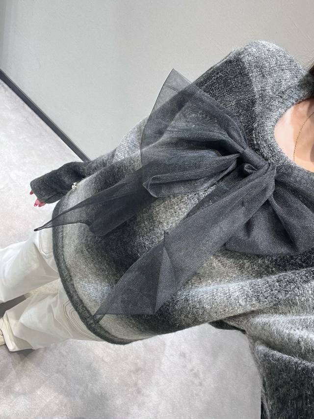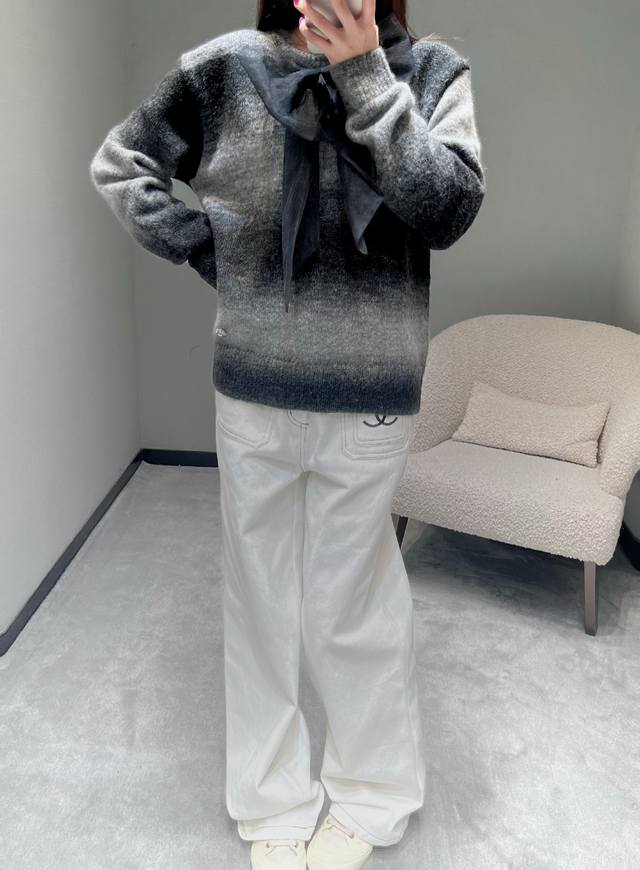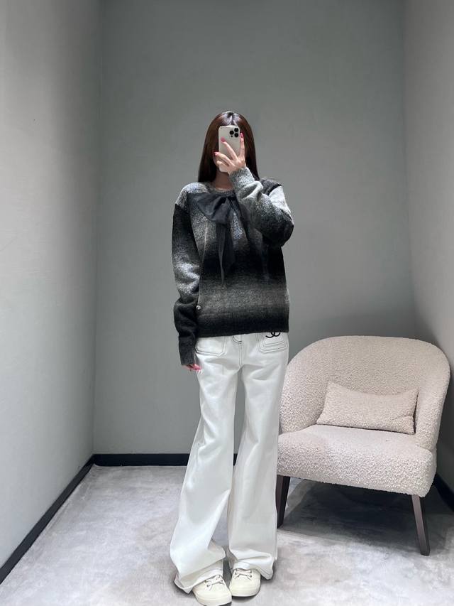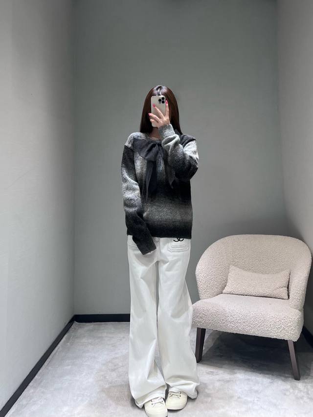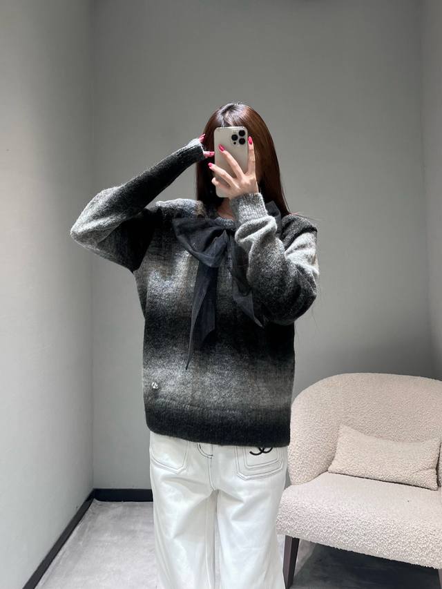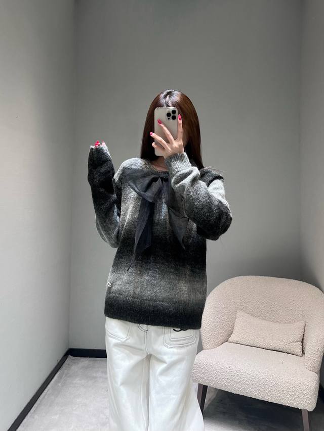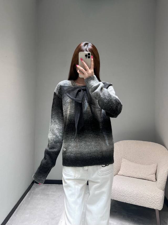 Chan*1 2025 Handmade Collection Gradient Knit Sweater, Park Bo-young's style. Another top-quality product developed by Yb, featuring a gradient gray-black knit fabric reminiscent of the runway collection. The color transition from dark to light is natural and layered, as if weaving light and shadow art onto the garment. The classic round neck design is paired with a large black organza bow at the chest, and the hem is adorned with sparkling rhinestones. (Sml